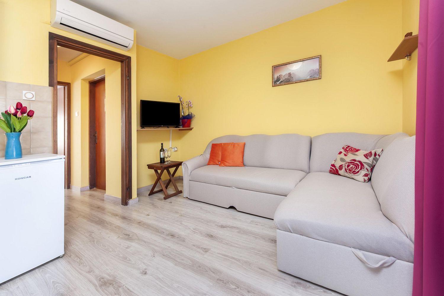 Diese Ferienwohnung mit 1 Schlafzimmer und Balkon befindet sich 15 Minuten zu Fuß vom Stadtzentrum und 10 Minuten zu Fuß vom nächsten Strand. Die Innenfläche ist 30 m2 und der Balkon ist 5 m2. Es befindet sich auf der Etage: 1. Die Unterkunft ist mit Klimaanlage ausgestattet. Die Klimaanlage befindet sich im Wohnzimmer. Bettwäsche und Handtücher werden gestellt. Privater Parkplatz im Hof.