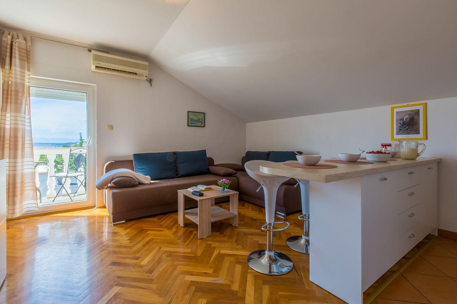 Die Ferienwohnung für zwei bis vier Personen befindet sich im dritten Stock in Crikvenica, ist 36 m² groß und verfügt über ein Schlafzimmer, ein Badezimmer, einen Balkon mit Meerblick, eine Klimaanlage, Satellitenfernsehen, einen Parkplatz auf dem Grundstück und einen Grill. Die Ferienwohnung befindet sich in der Nähe des Stadtzentrums von Crikvenica und eines der schönsten Kiesstrände Crikvenicas. Aufgrund der Nähe zum Zentrum und zum Strand ist sie sehr gut für Gäste geeignet, die ihr Fahrzeug nicht viel nutzen möchten.