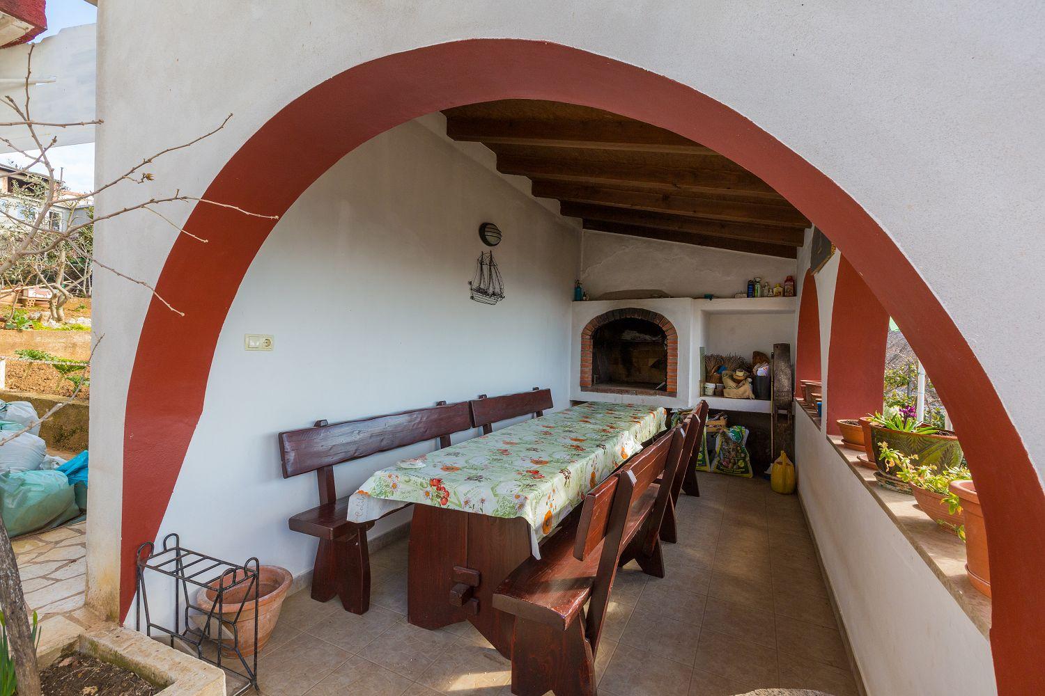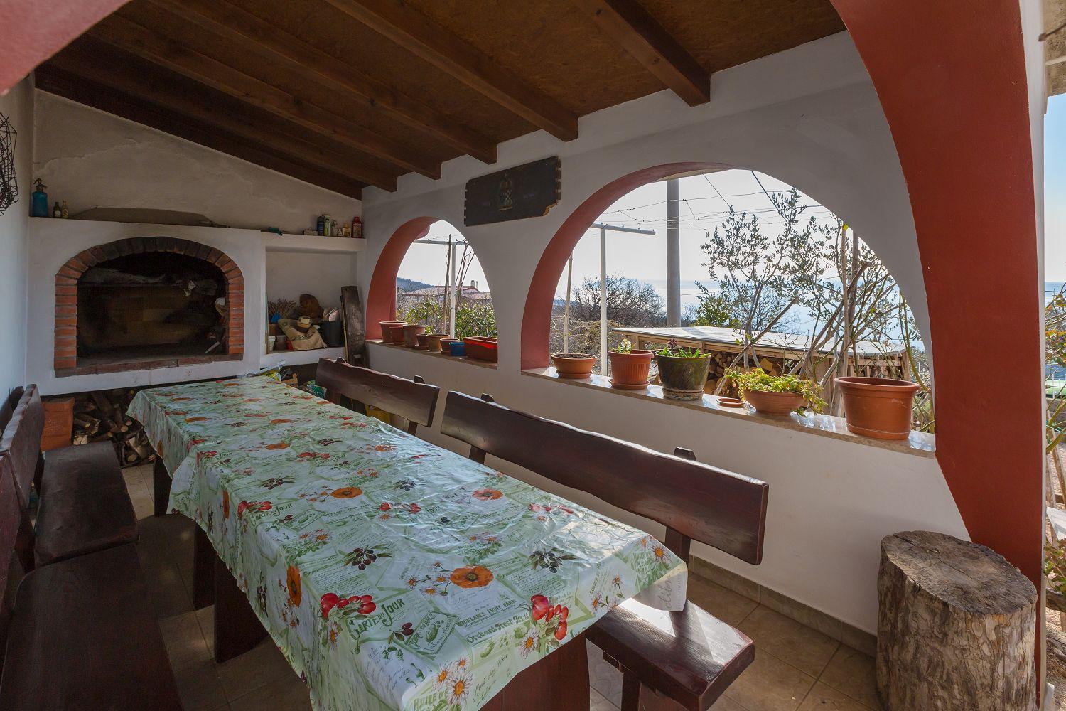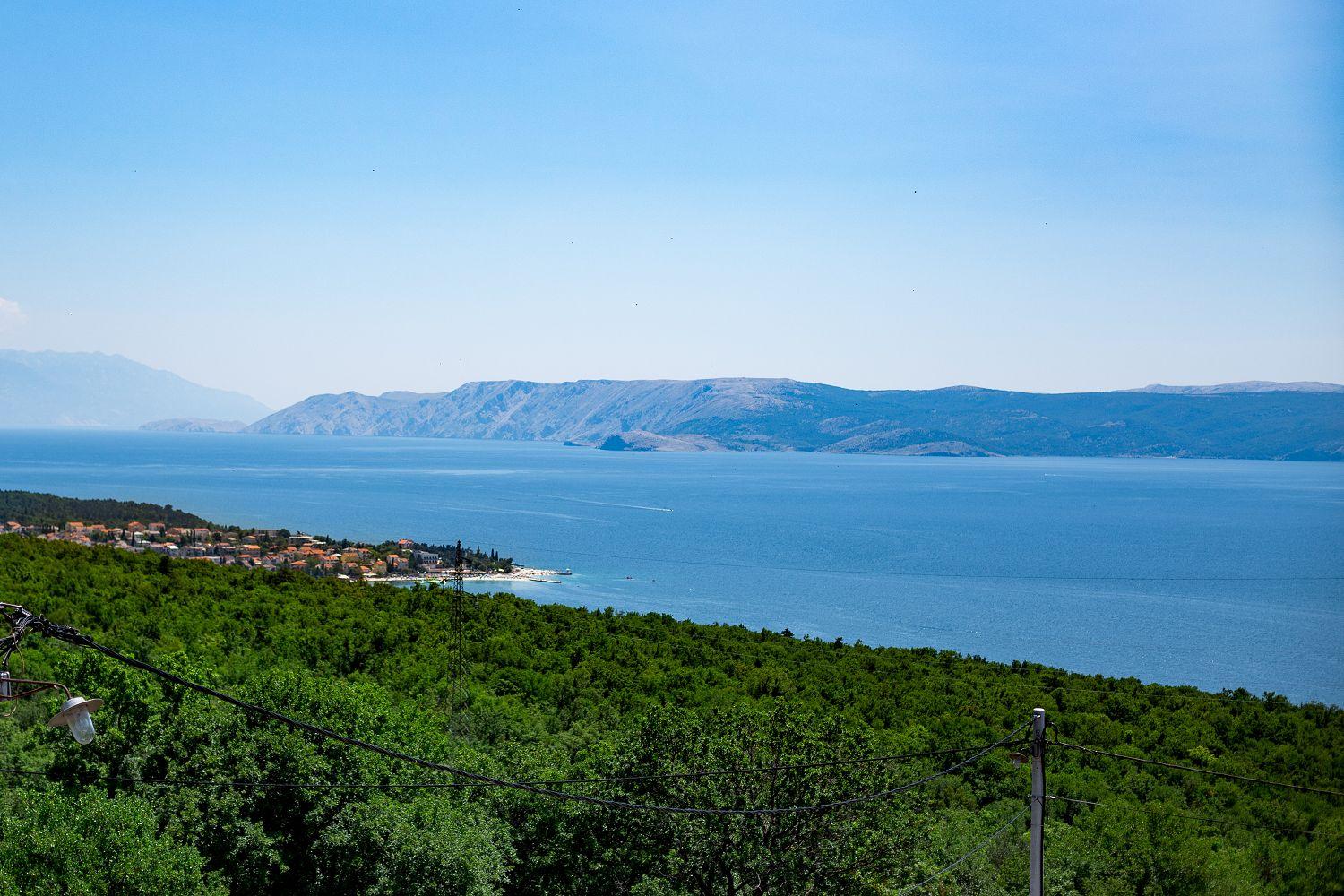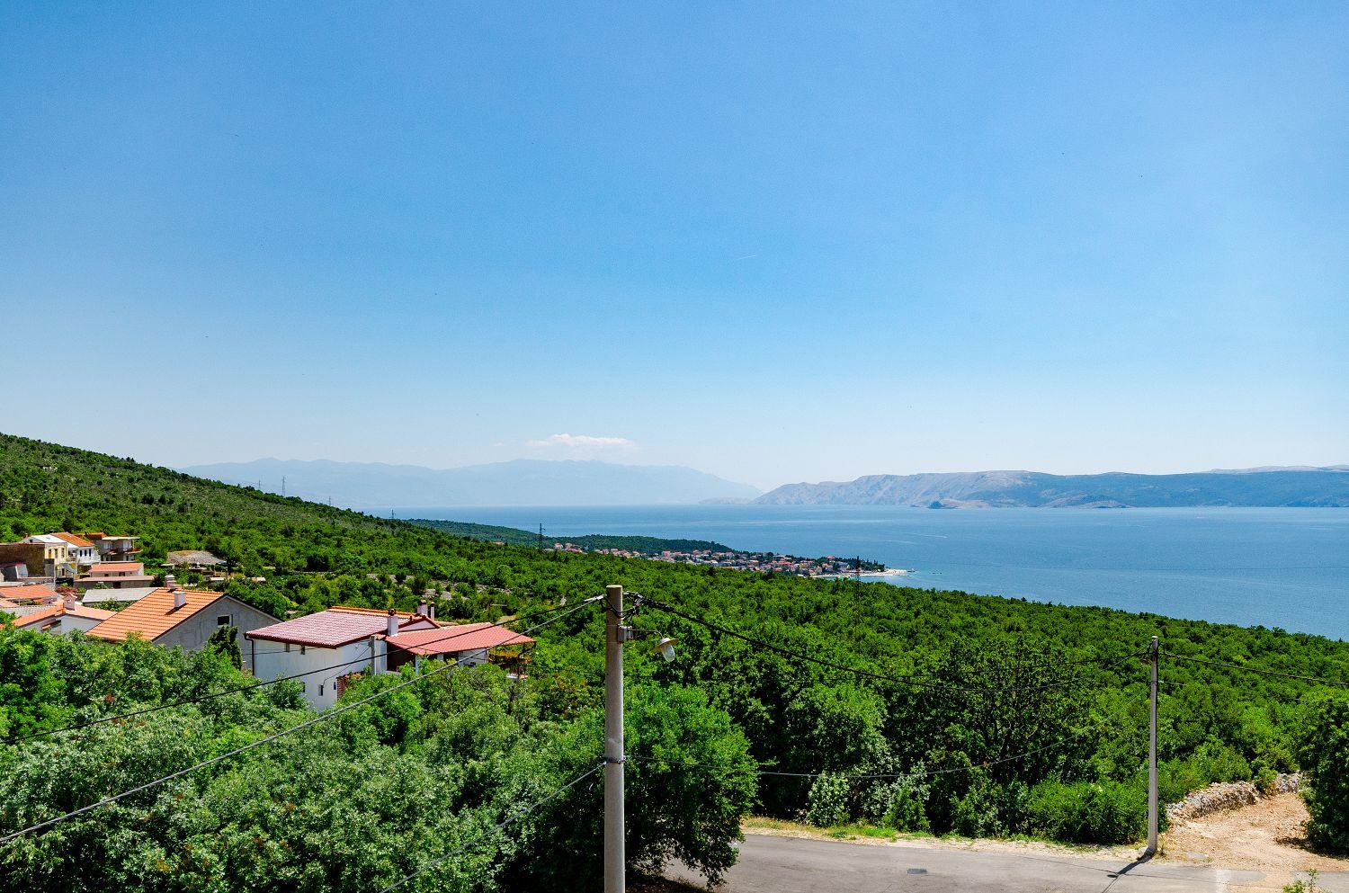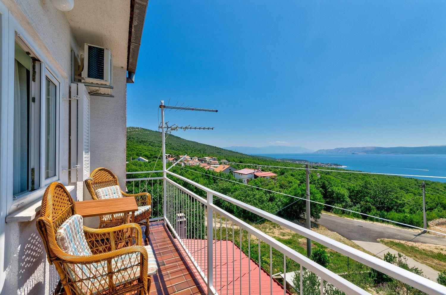 Diese Ferienwohnung befindet sich in einer naturreichen und ruhigen Umgebung. Sie besteht aus einem großen Wohn-/Esszimmer mit Küche, einem Schlafzimmer mit Doppelbett, einem Einzelzimmer und einem Badezimmer. Vom Wohnzimmer aus hat man direkten Zugang zum Balkon der Ferienwohnung. Von dort hat man einen wunderschönen Blick auf das Meer und den Wald.