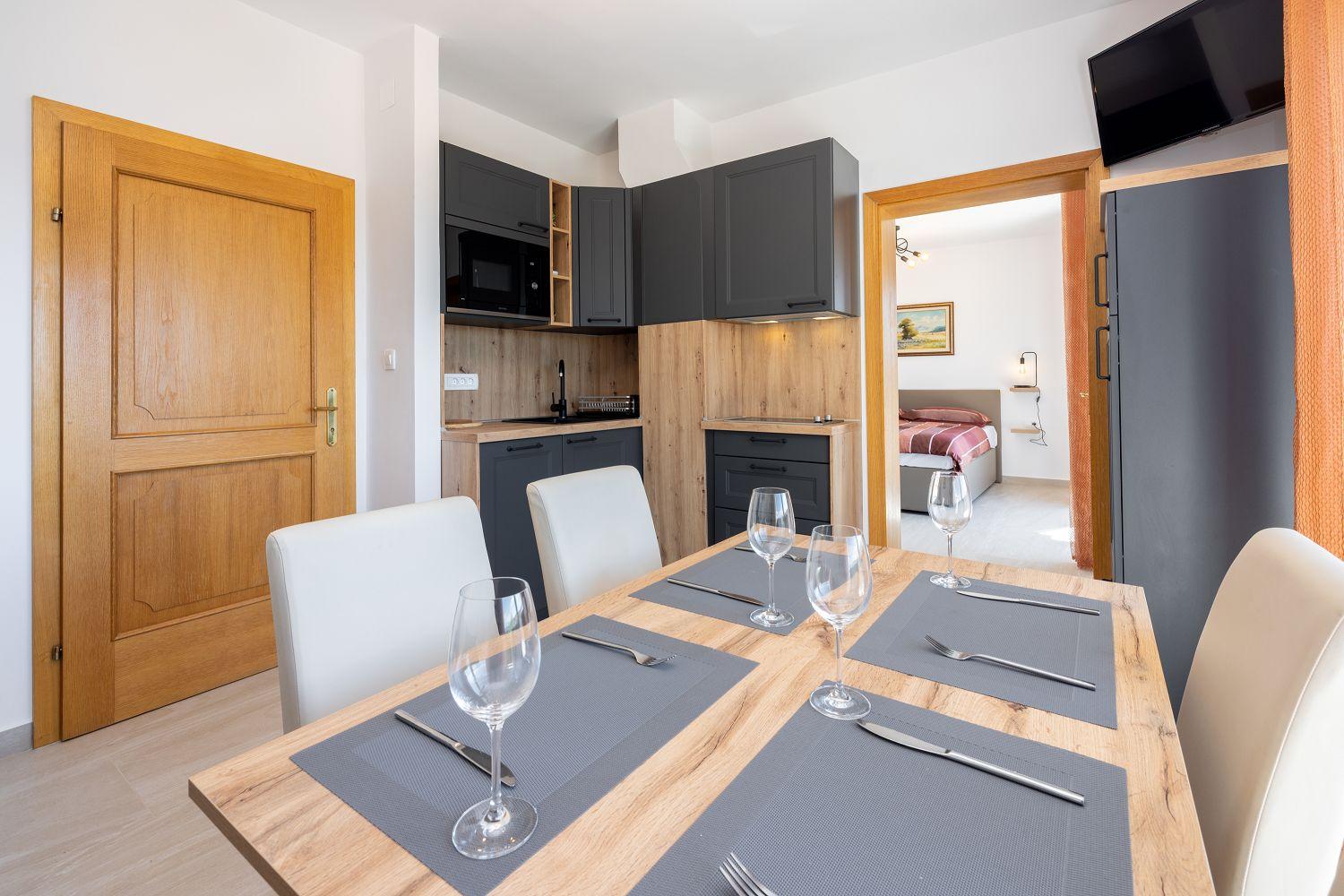 Das Nachbarhaus mit den gleichen Vermietern ist speziell auf den Tourismus ausgerichtet und verfügt über eine Wellness-Oase mit Sauna und Whirlpool auf der Dachterrasse, die auch die Gäste dieser Wohneinheit täglich 2 Stunden kostenlos nutzen können. Die Vermieterfamilie hat langjährige Erfahrung im Tourismus und ist stets bemüht, ihren Gästen den Aufenthalt so angenehm wie möglich zu gestalten. Die Familie betreibt ein preisgekröntes Restaurant. Die Ferienwohnung besteht aus einem Wohn-/Esszimmer mit Küche, in der sich eine Schlafcouch für 2 Personen befindet, einem Schlafzimmer mit Doppelbett, einem Badezimmer mit Dusche und einem sehr schönen Balkon.
