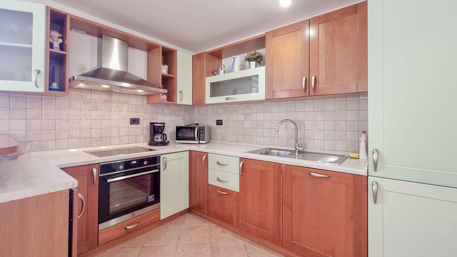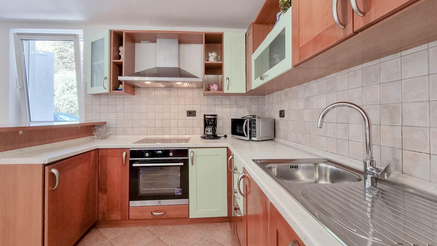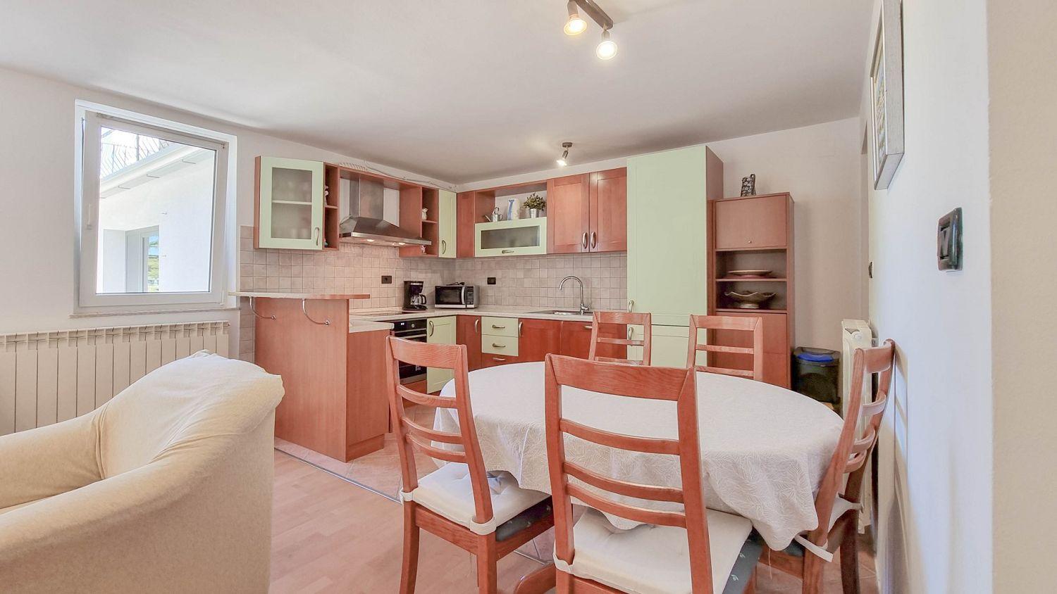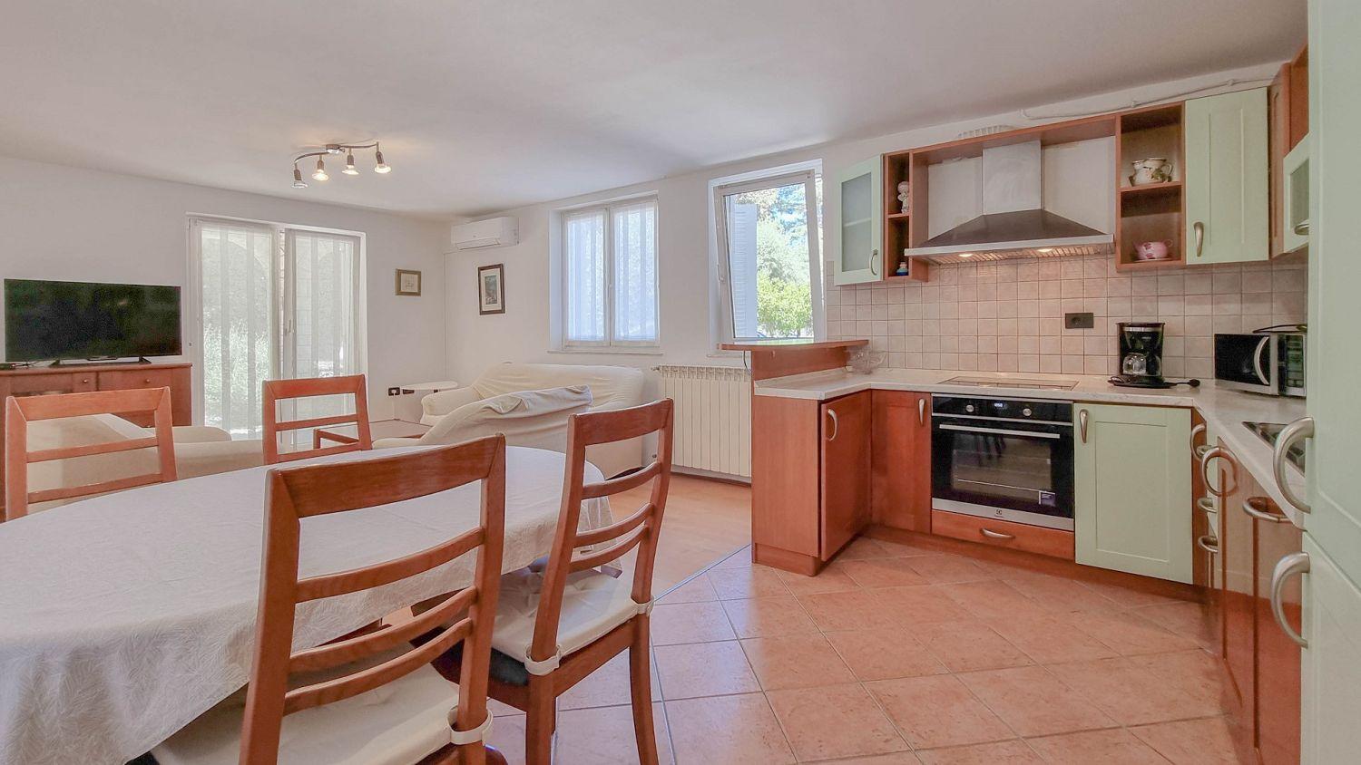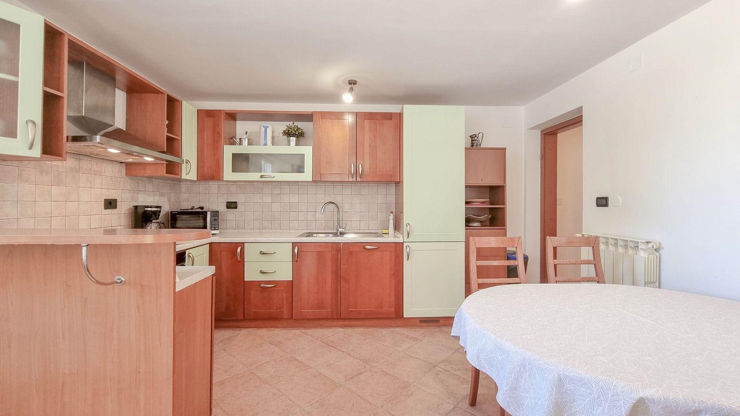 Die Küche ist mit Elektroherd, Backofen, Geschirrspüler, Kühlschrank und Kaffeemaschine ausgestattet. Das Badezimmer ist mit einer Dusche und einer Toilette ausgestattet, eine zusätzliche Toilette ist ebenfalls vorhanden. Die Außenterrasse mit Tisch und Stühlen ist der ideale Ort, um sich im Freien zu entspannen und die warmen istrischen Abende zu genießen.
