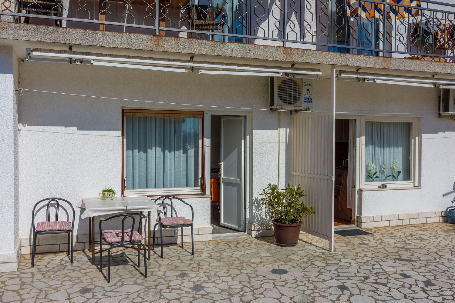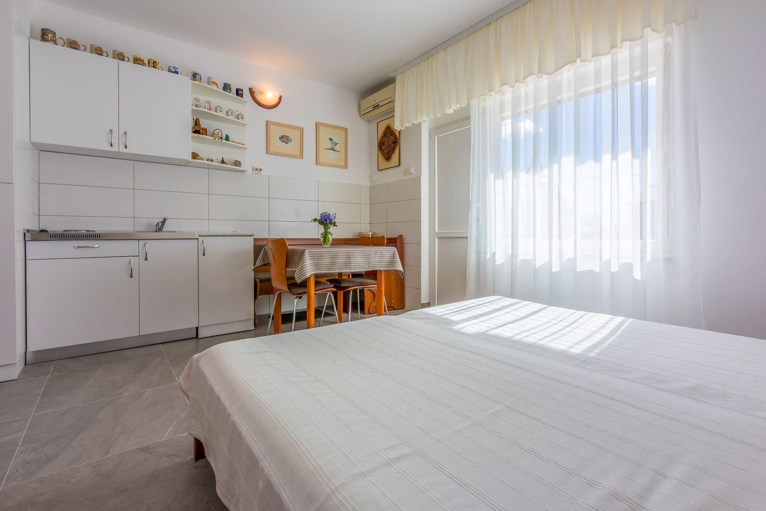 Das 33 m² große Studioapartment im Erdgeschoss bietet Platz für zwei Personen. Es besteht aus einem gemeinsamen Wohn-, Schlaf- und Esszimmer mit einem Doppelbett, einem Badezimmer mit Badewanne und einer 70 m² großen, überdachten und möblierten Terrasse.