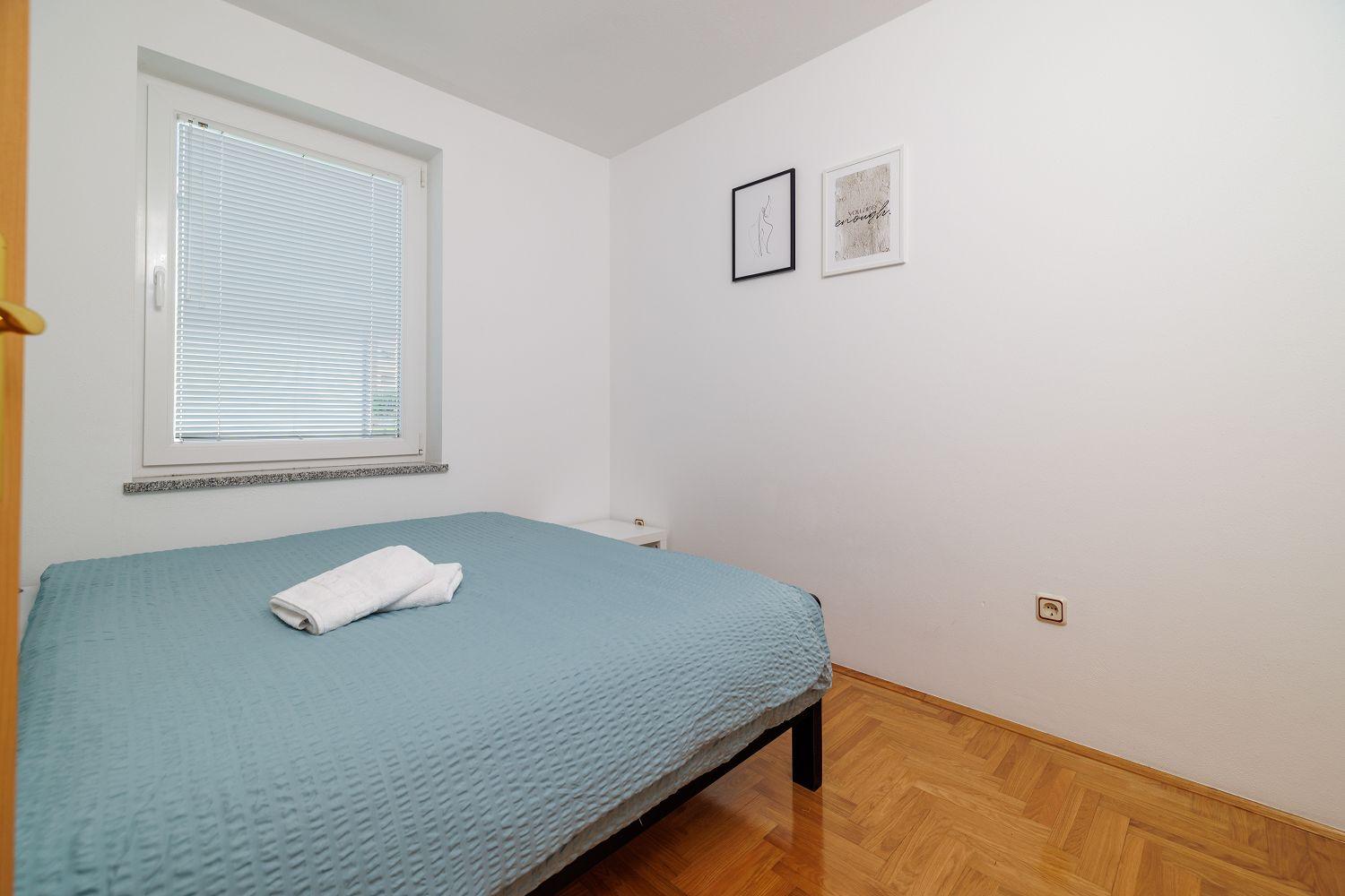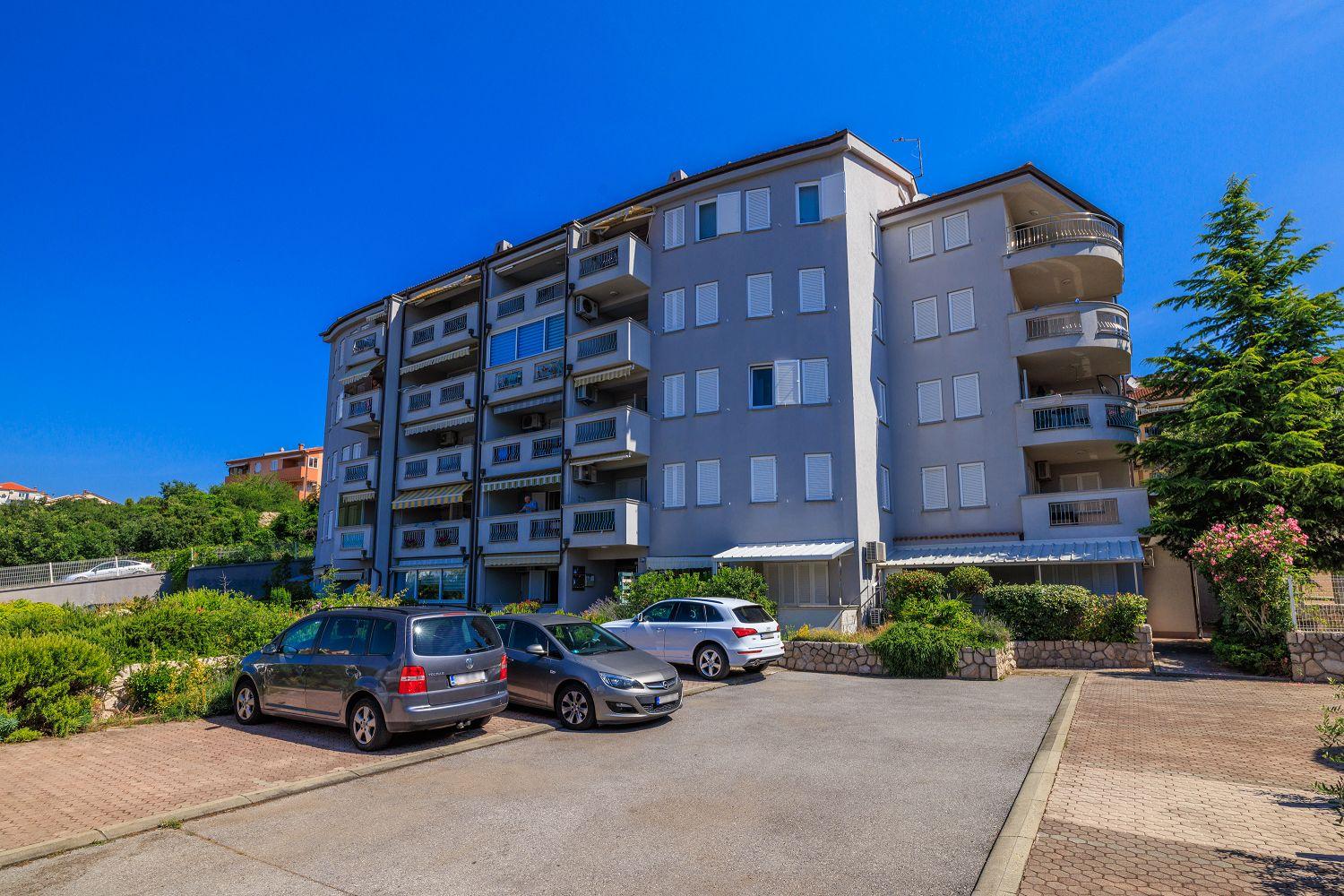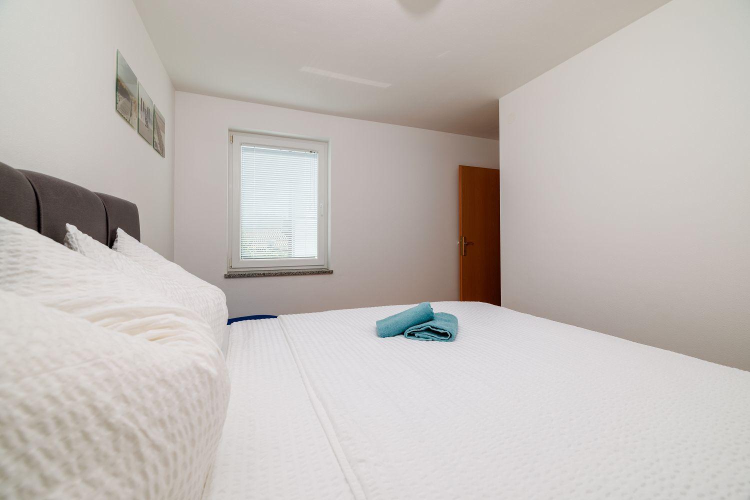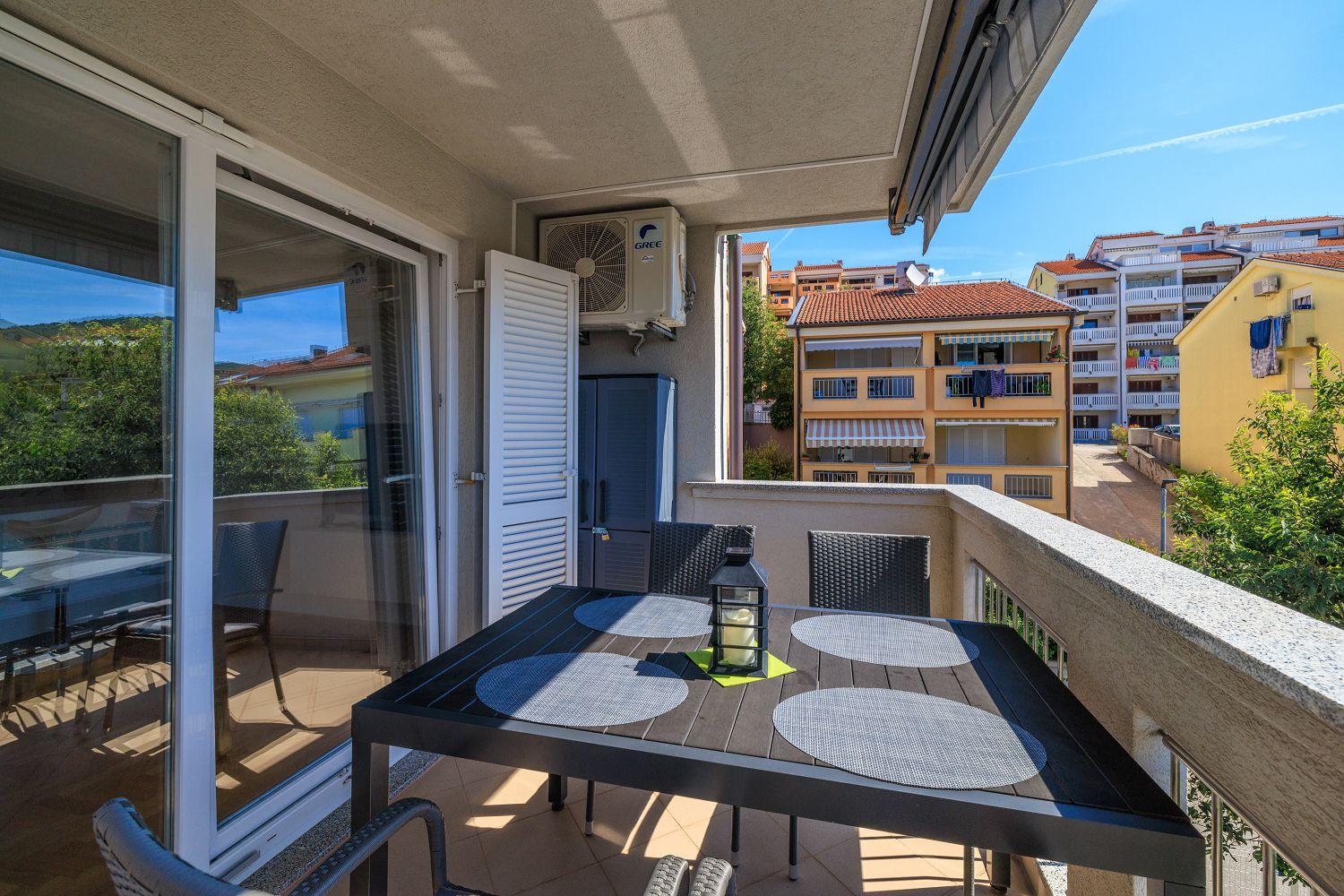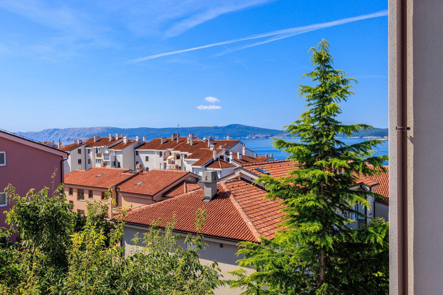 Die Ferienwohnung befindet sich in einer Neubausiedlung in Crikvenica und besteht aus einem Wohnzimmer mit Küche, zwei Schlafzimmern und einem Badezimmer. Vom Wohnbereich aus gelangt man auf den Balkon, der mit Gartenmöbeln und einer Markise ausgestattet ist und einen Blick auf das Meer bietet.