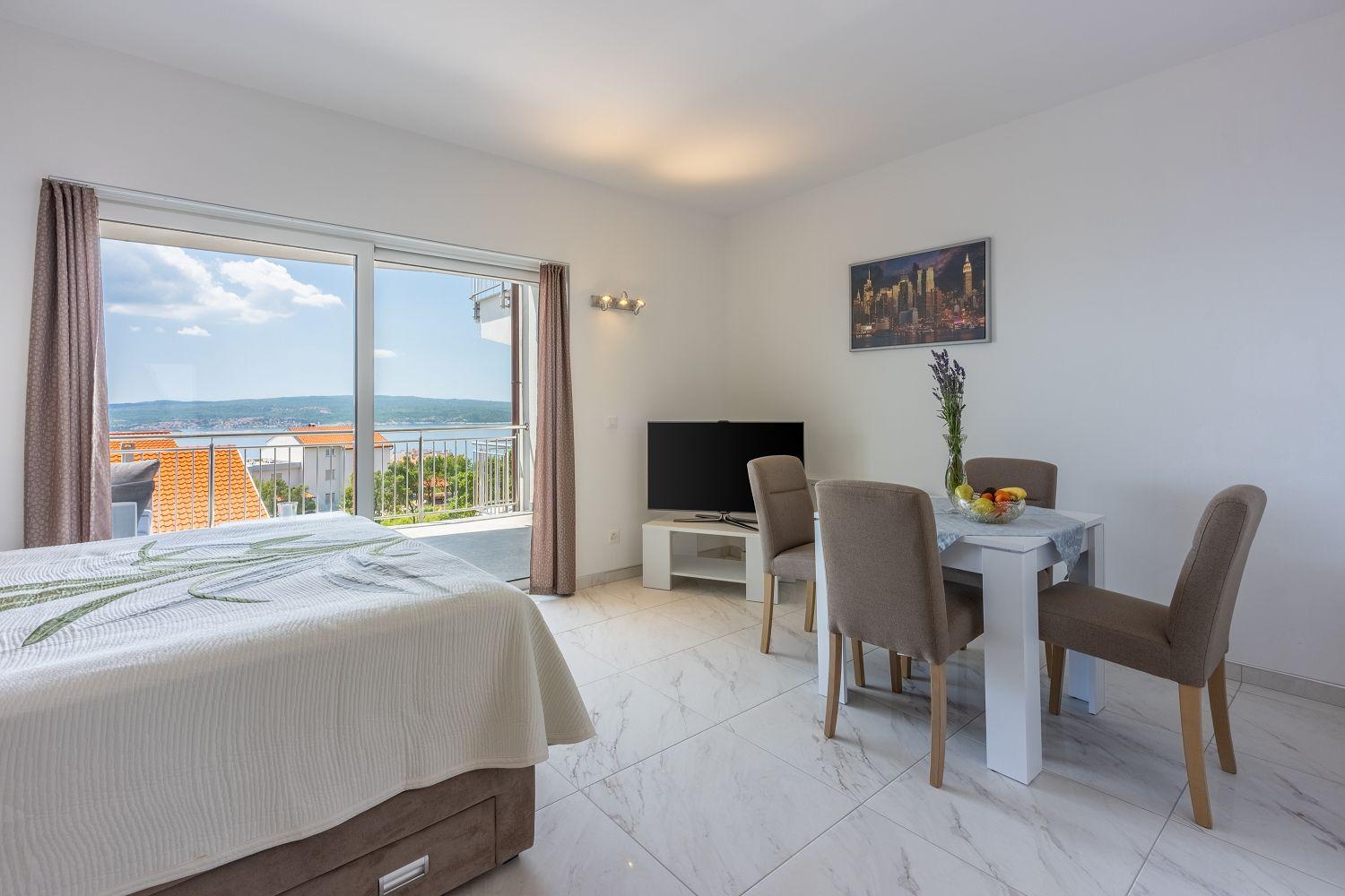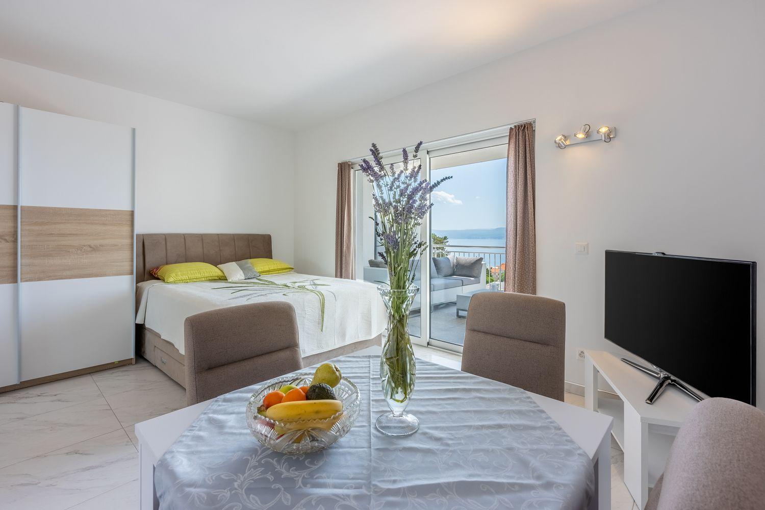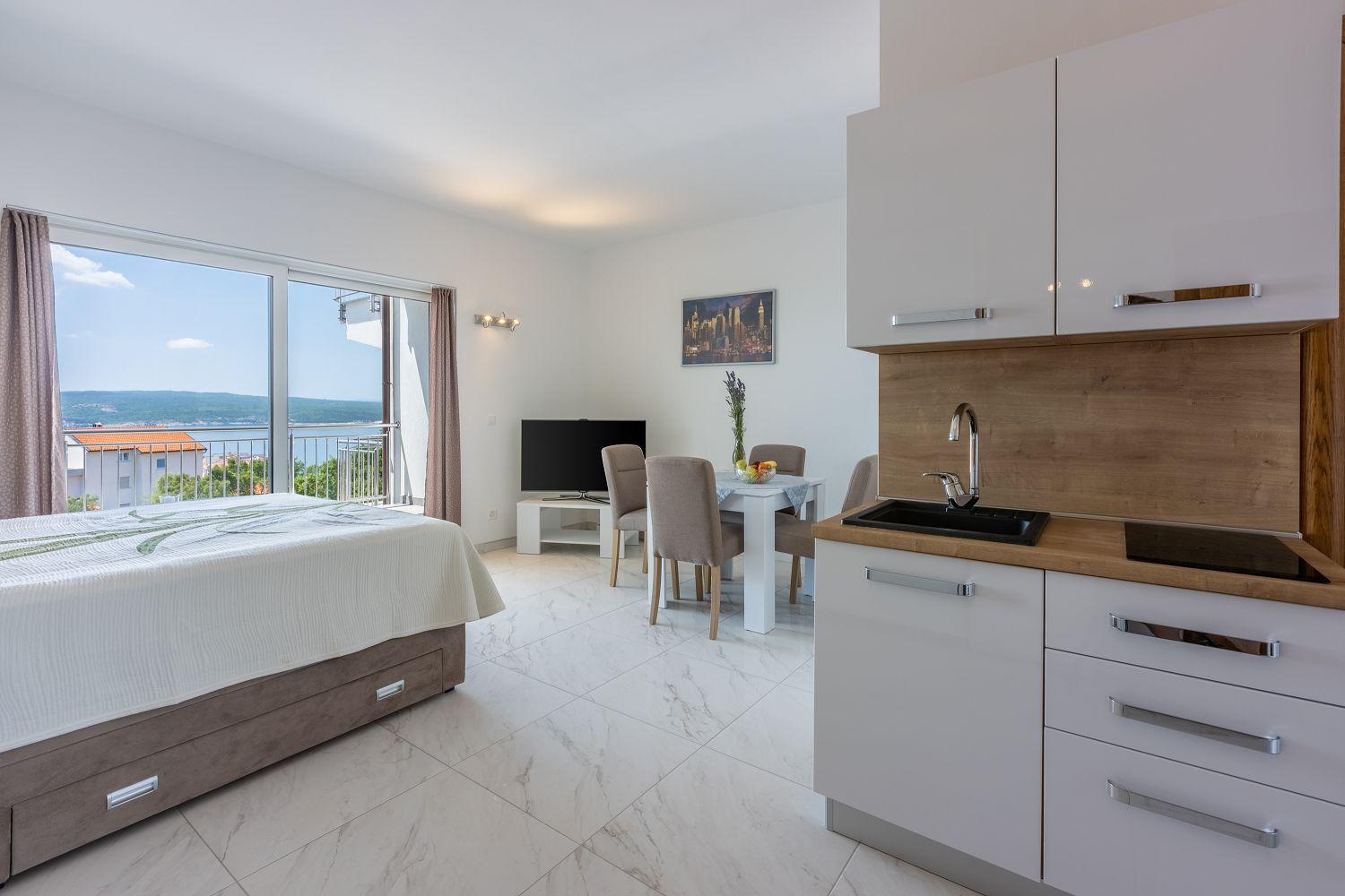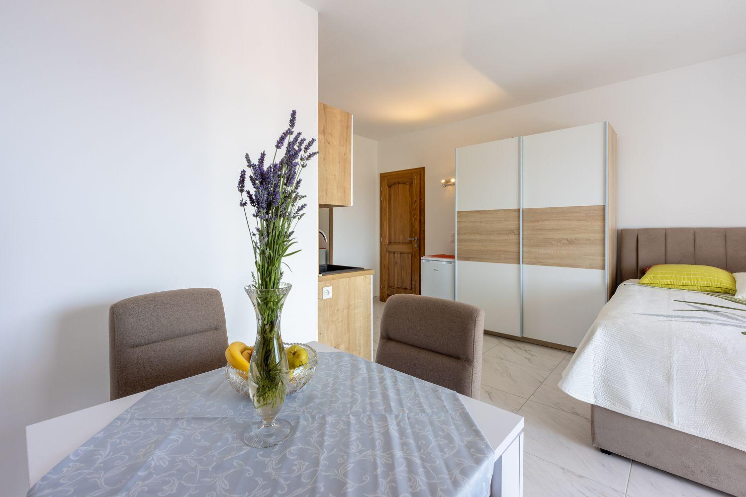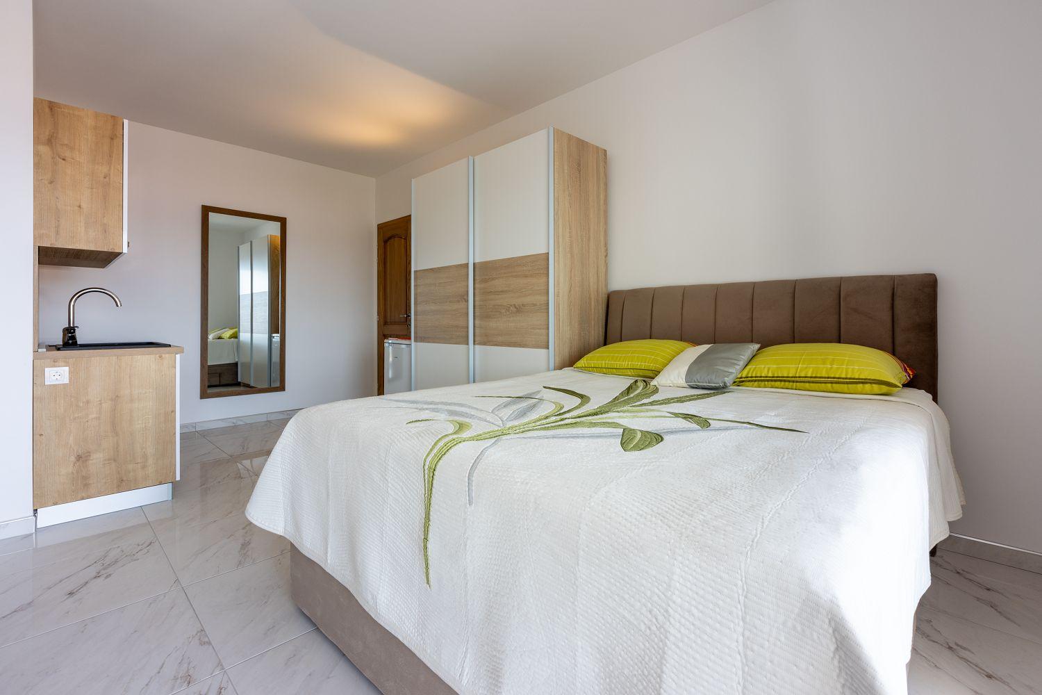 Dieses moderne Studioapartment für bis zu zwei Personen befindet sich in ruhiger Lage oberhalb des Ortszentrums. Es liegt im zweiten Obergeschoss und besteht aus einem Wohn-/Esszimmer mit Küche und Schlafbereich im selben Raum, einem Badezimmer und einem eigenen Balkon mit Meerblick. Eine Klimaanlage sorgt für eine angenehme Raumtemperatur. Vom Wohn-/Schlafbereich aus hat man direkten Zugang zum überdachten Balkon dieser Wohnung. Ein privater Parkplatz befindet sich auf dem Grundstück und steht kostenfrei zur Verfügung.