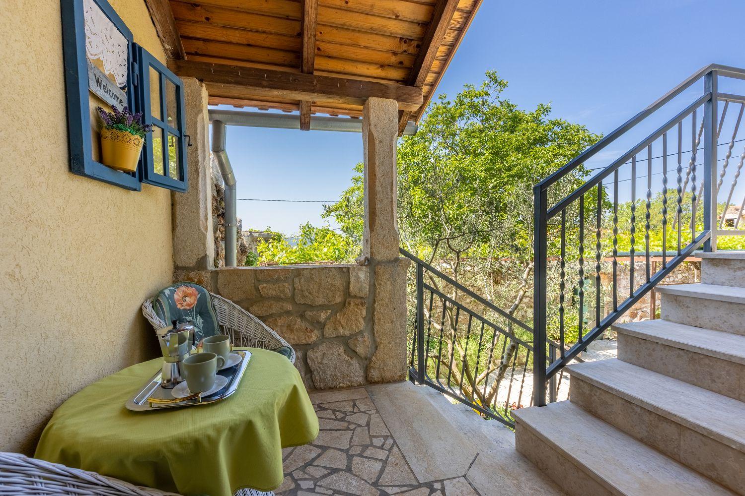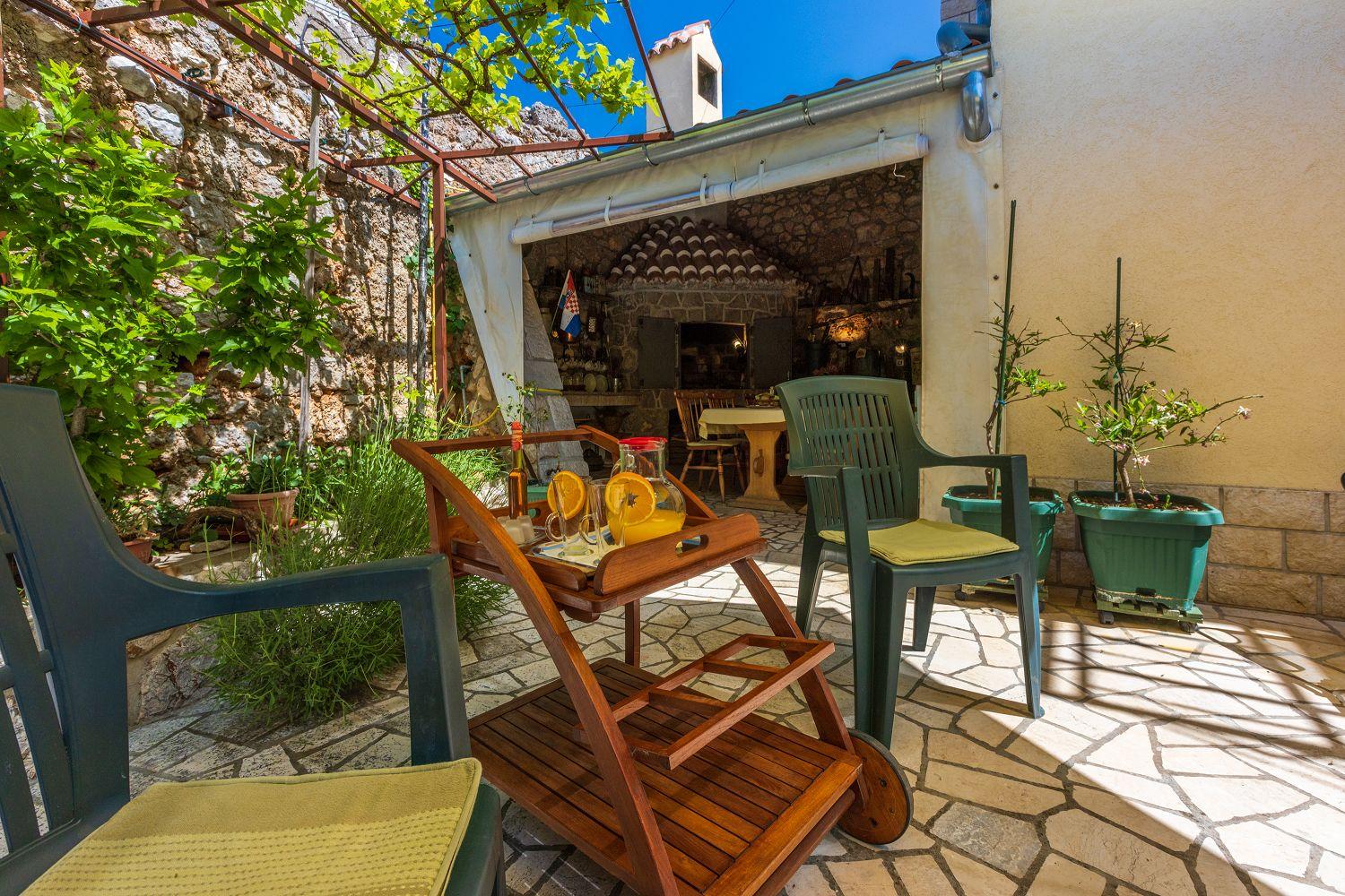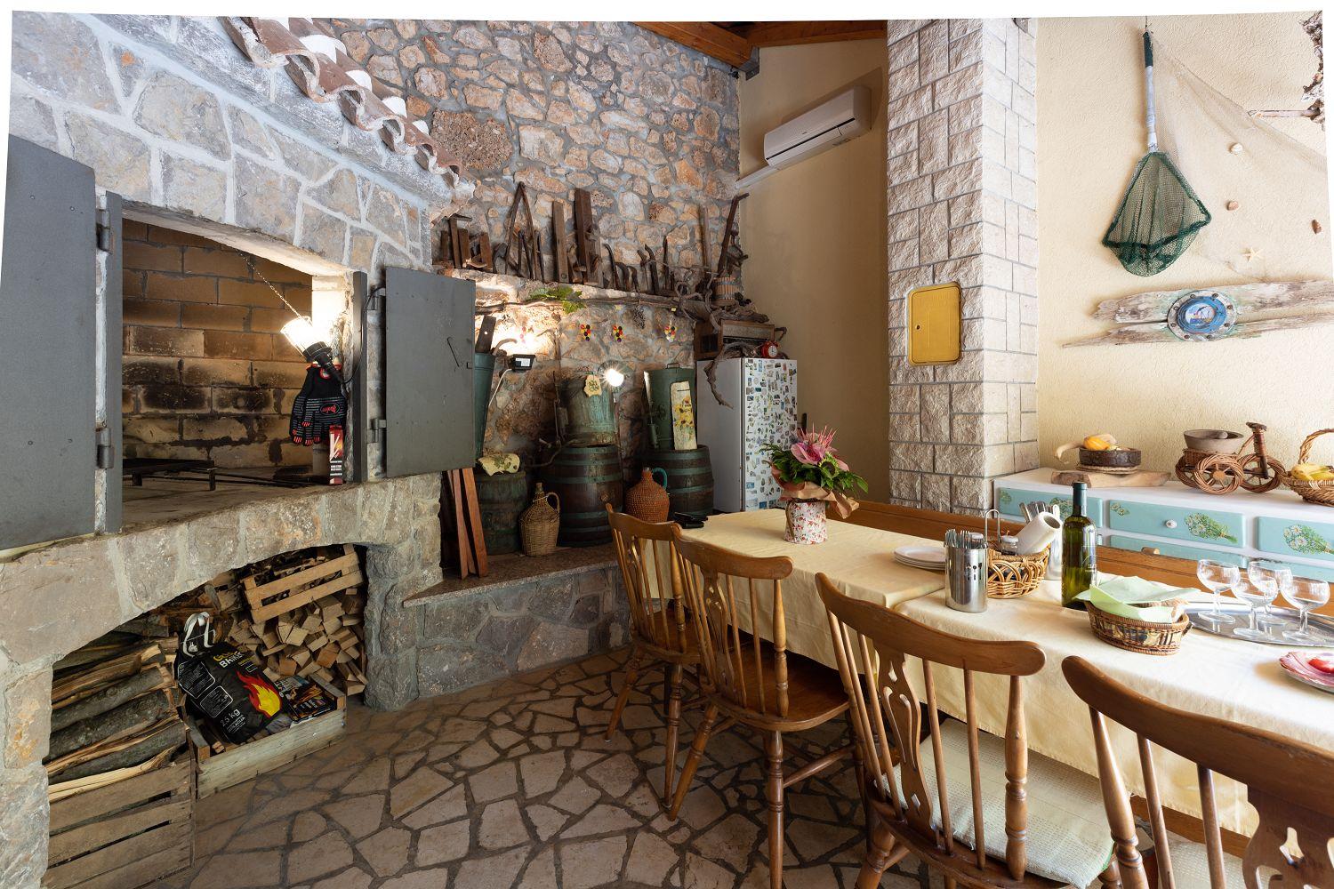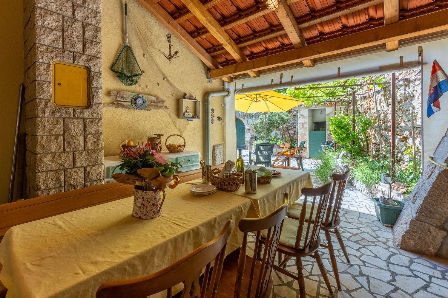 Im mediterranen Stil eingerichtetes und renoviertes Ferienhaus. Das Gebäude befindet sich auf einem Familiengrundstück, das auf allen Seiten von einer Steinmauer umgeben ist. Durch die dicken Steinmauern bietet es ein Höchstmaß an Privatsphäre und eine angenehme Atmosphäre während des Aufenthalts. Mit seiner Ruhe und Gemütlichkeit lädt dieses Haus zum Besuch und Verweilen ein. Zur privaten Nutzung stehen zur Verfügung: Sonnenschirm, Liegestühle, Dusche im Hof, Terrasse, Tisch, großer Kamin mit Grill. Vom Hof und von der Terrasse hat man einen schönen Blick in die Natur und auf das herrlich blaue Meer unserer Kvarner Bucht.