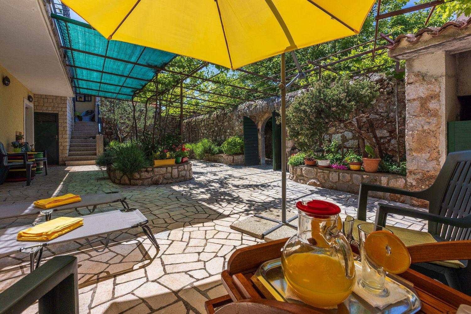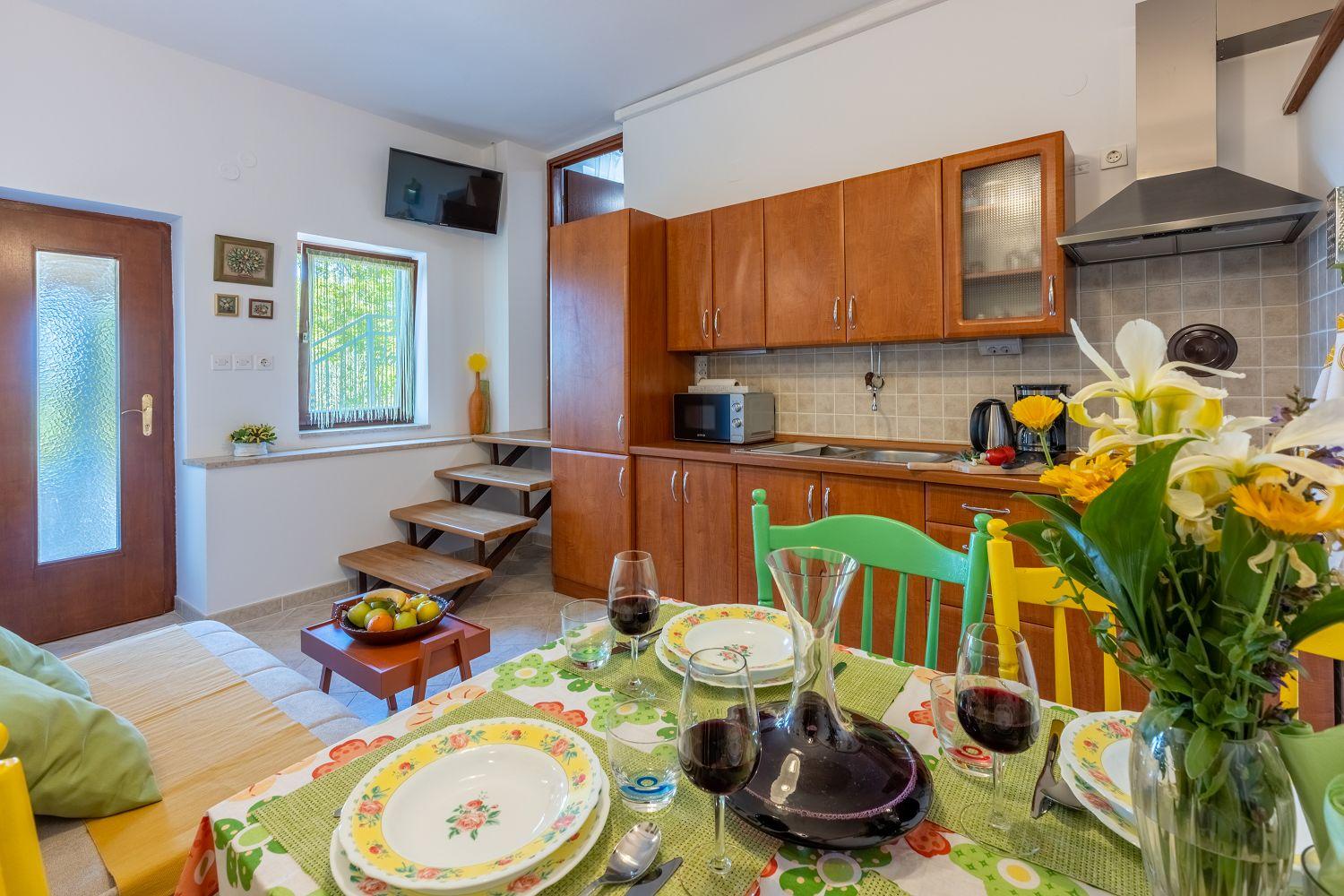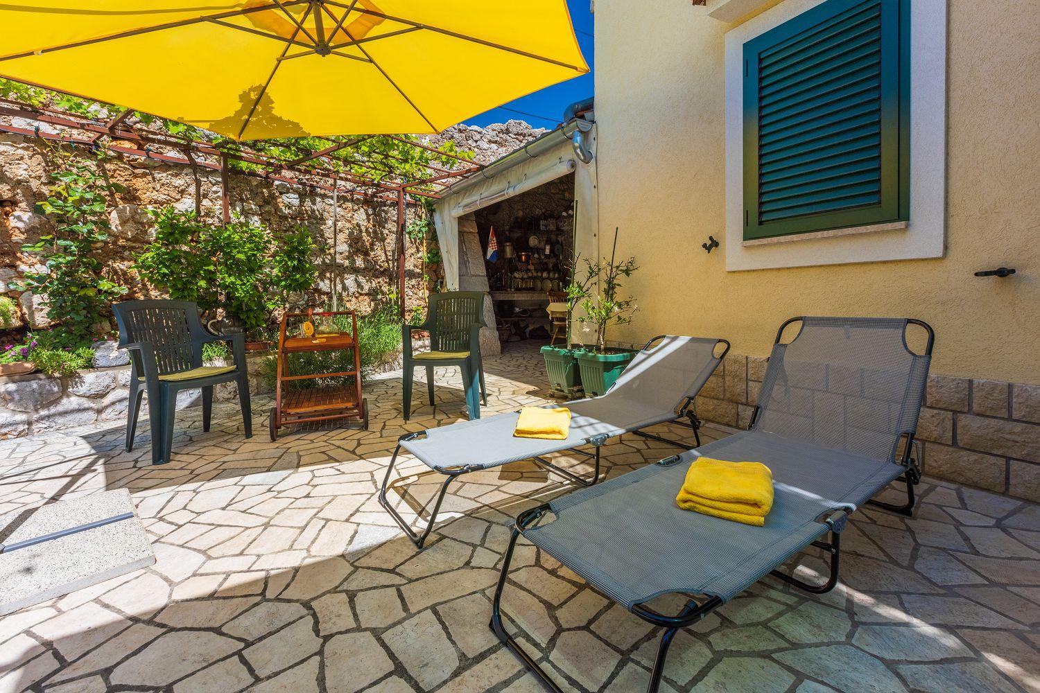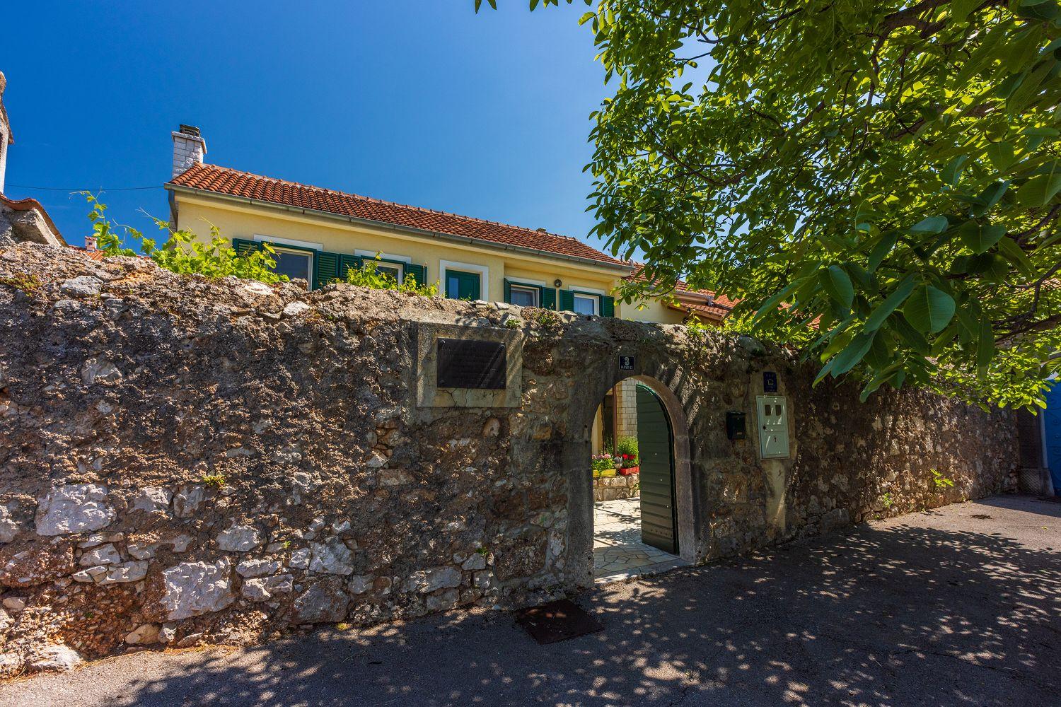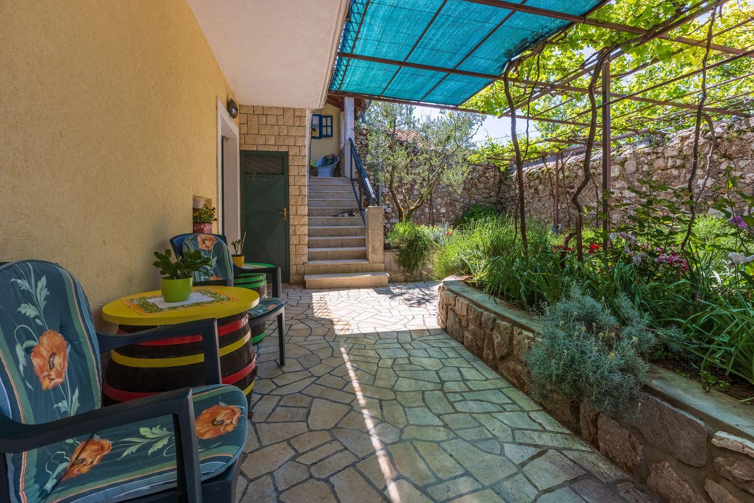 Im mediterranen Stil eingerichtetes und renoviertes Ferienhaus. Das Gebäude befindet sich auf einem Familiengrundstück, das auf allen Seiten von einer Steinmauer umgeben ist. Durch die dicken Steinmauern bietet es ein Höchstmaß an Privatsphäre und eine angenehme Atmosphäre während des Aufenthalts. Mit seiner Ruhe und Gemütlichkeit lädt dieses Haus zum Besuch und Verweilen ein. Zur privaten Nutzung stehen zur Verfügung: Sonnenschirm, Liegestühle, Dusche im Hof, Terrasse, Tisch, großer Kamin mit Grill. Vom Hof und von der Terrasse hat man einen schönen Blick in die Natur und auf das herrlich blaue Meer unserer Kvarner Bucht.