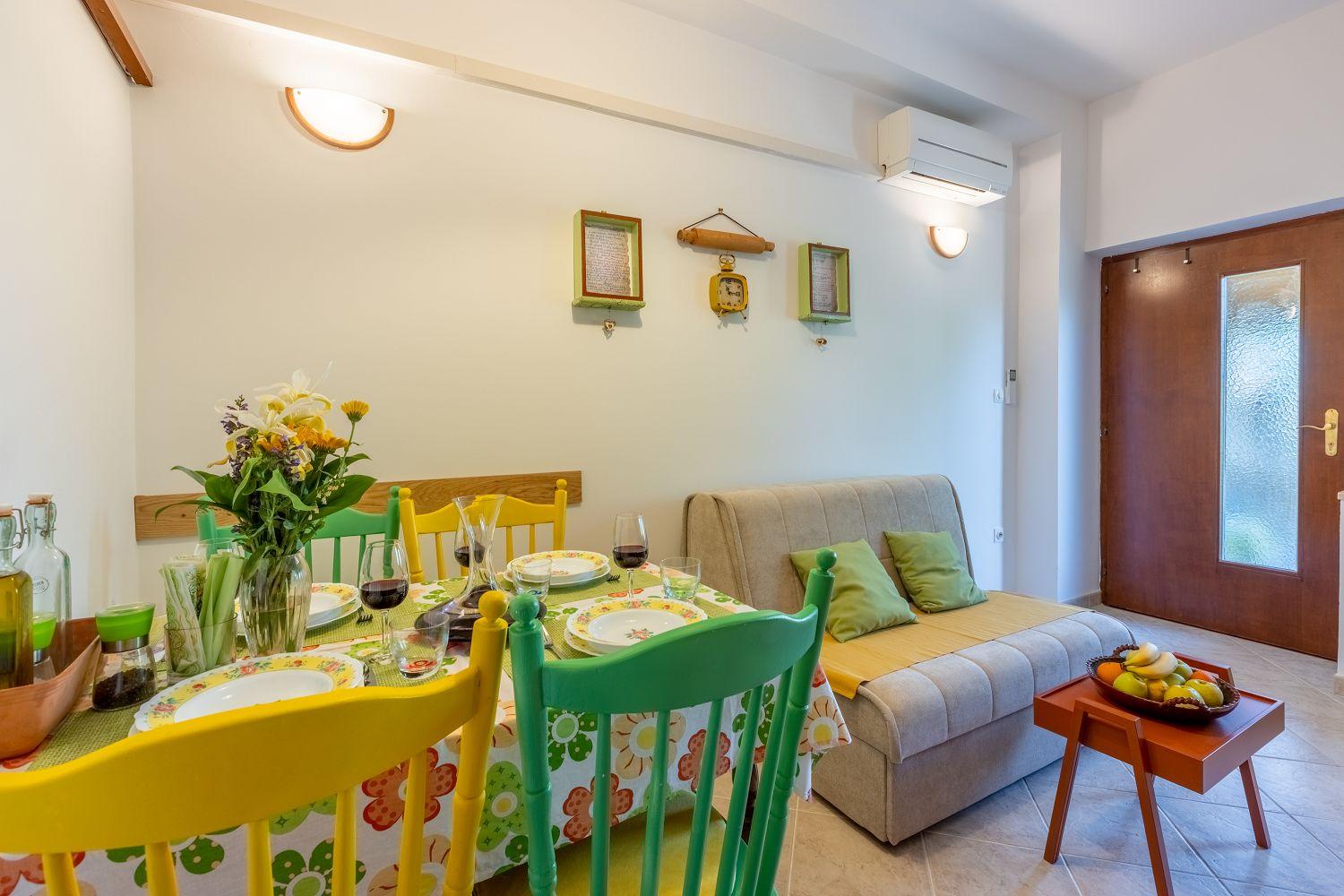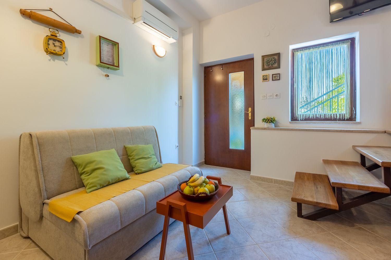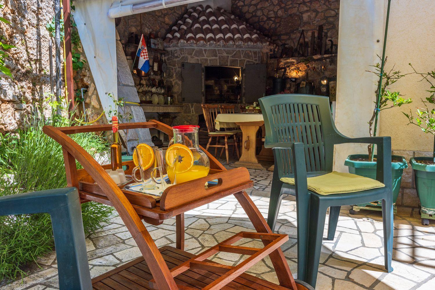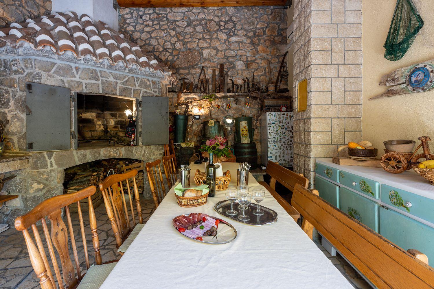 Im mediterranen Stil eingerichtetes und renoviertes Ferienhaus. Das Gebäude befindet sich auf einem Familiengrundstück, das auf allen Seiten von einer Steinmauer umgeben ist. Durch die dicken Steinmauern bietet es ein Höchstmaß an Privatsphäre und eine angenehme Atmosphäre während des Aufenthalts. Mit seiner Ruhe und Gemütlichkeit lädt dieses Haus zum Besuch und Verweilen ein. Zur privaten Nutzung stehen zur Verfügung: Sonnenschirm, Liegestühle, Dusche im Hof, Terrasse, Tisch, großer Kamin mit Grill. Vom Hof und von der Terrasse hat man einen schönen Blick in die Natur und auf das herrlich blaue Meer unserer Kvarner Bucht.
