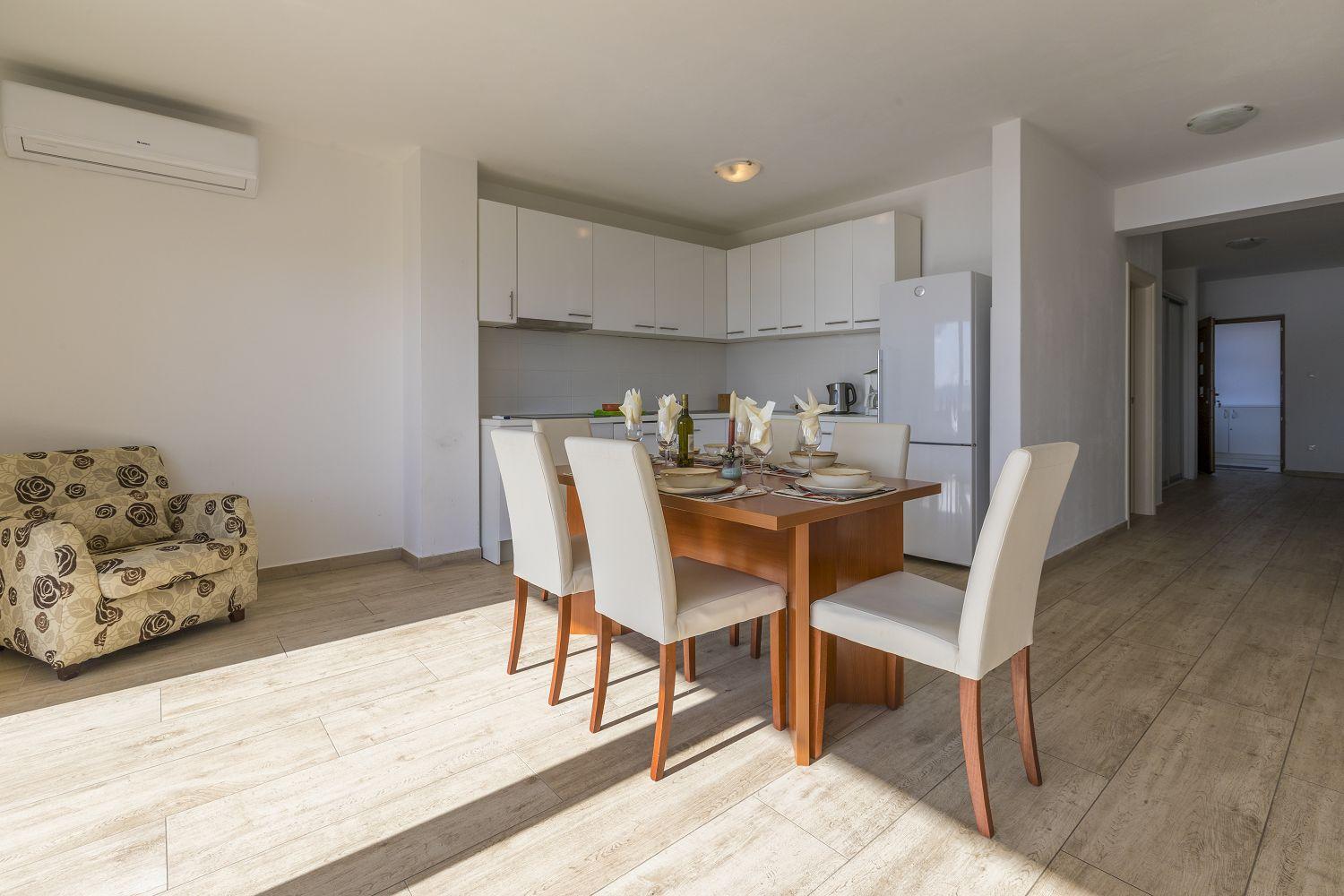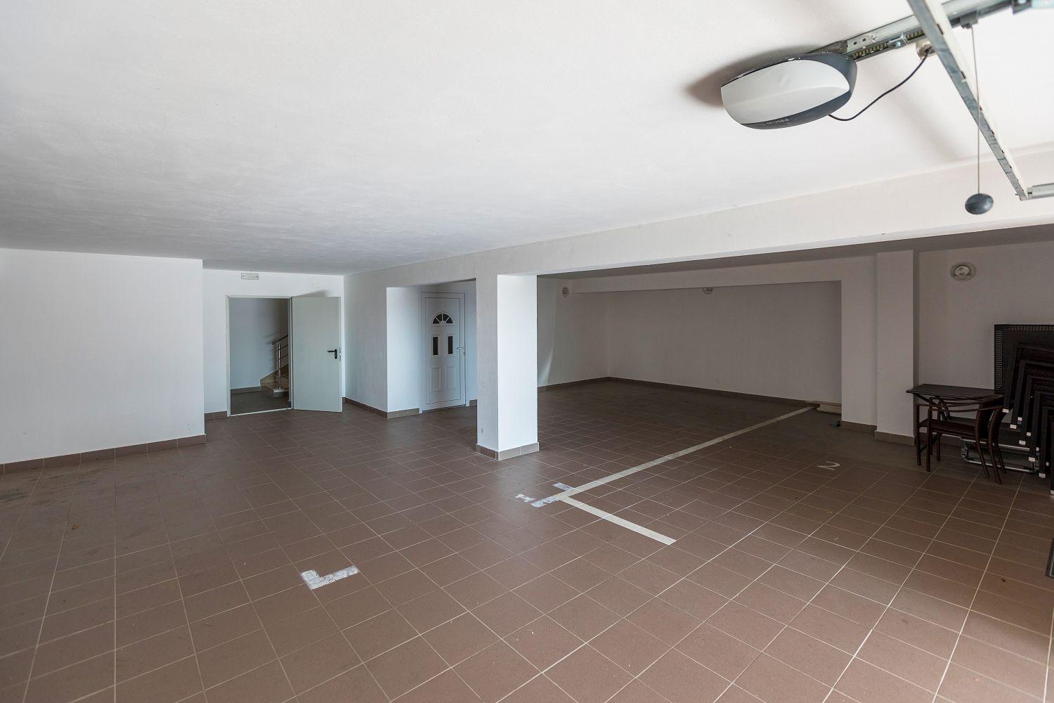 Bestehen tut die Wohnung aus einem herrlichen, klimatisierten Wohn/Esszimmer mit einer gut ausgestatteten Küche in einem Raum, drei klimatisierten Schlafzimmern, drei Badezimmern, einem Flur und einem traumhaften Balkon welcher 20 m² groß ist. Als Parkmöglichkeit steht ein Parkplatz in der Garage und ein zweiter Parkplatz auf dem Grundstück im offenem zur Verfügung. Für längere Aufenthalte ist diese Wohnung sehr gut geeignet da Sie sehr gut ausgestattet ist. Eine Waschmaschine, Bugelbrett mit Bügeleisen, ein Staubsauger und anderes sind vorhanden.