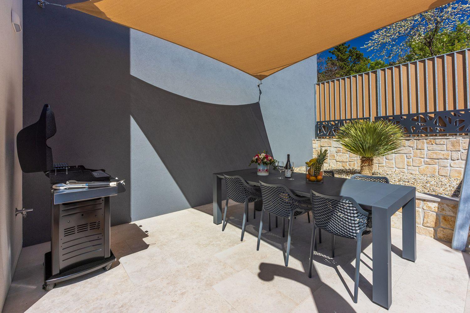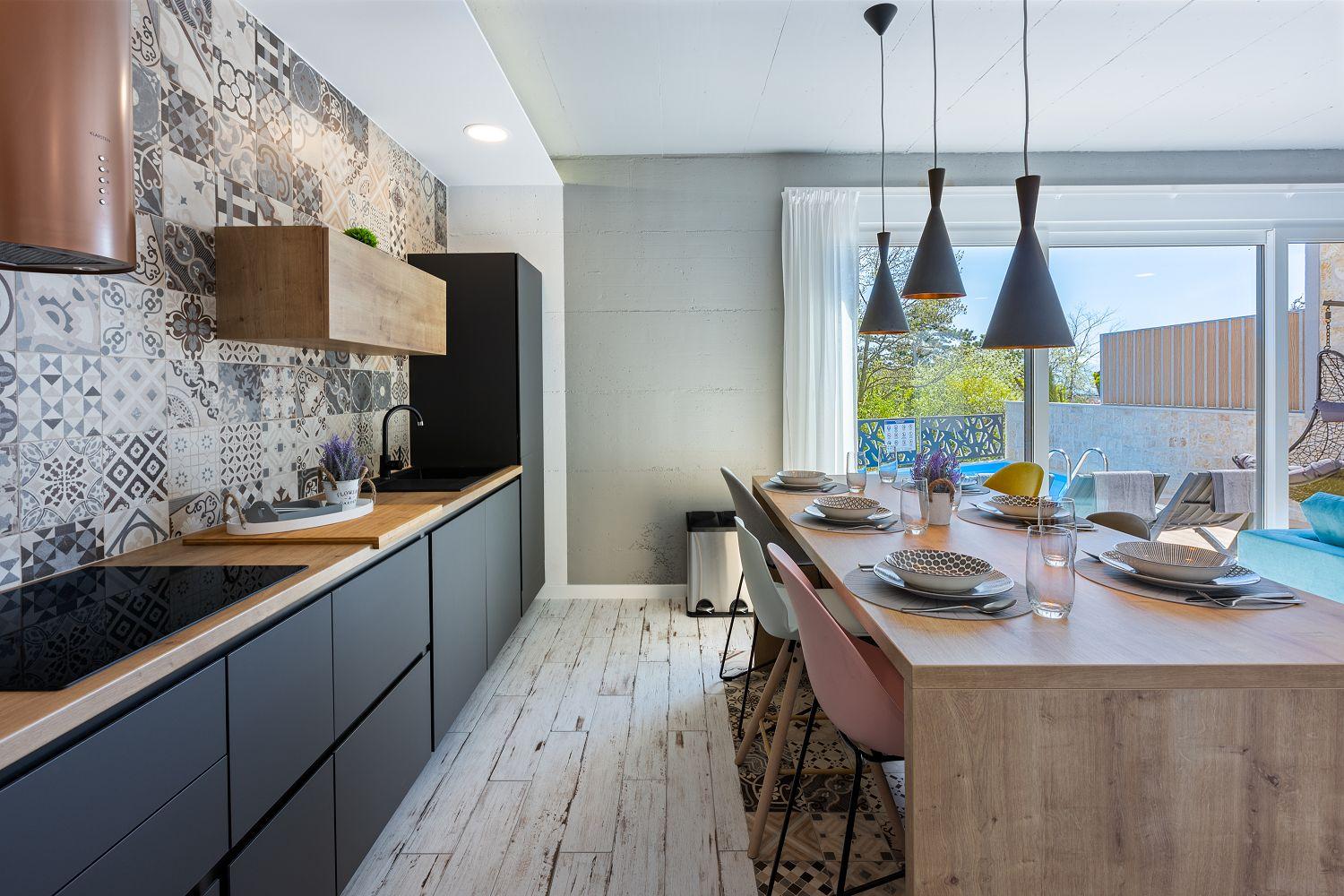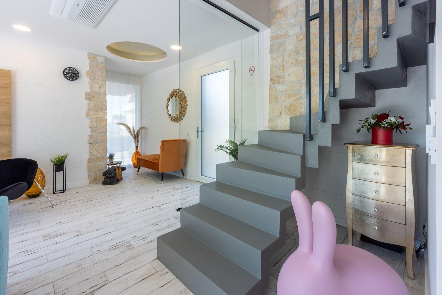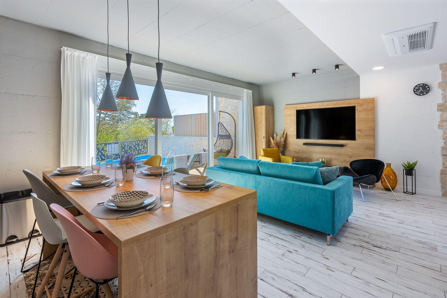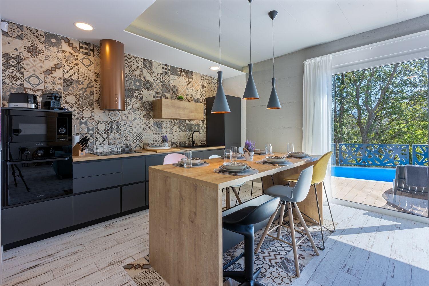 In einer ruhigen und neuen Wohngegend, direkt am berühmten Liebespfad in Crikvenica, befindet sich dieses im Jahr 2022 erbaute Ferienhaus mit eigenem Swimmingpool. Dieses im Jahr 2022 erbaute Ferienhaus verfügt über einen eigenen Swimmingpool. Das stilvoll designte Ferien-Reihenhaus bietet Platz für sechs Personen und erstreckt sich über zwei Etagen: das Erdgeschoss und das erste Obergeschoss. Vom Eingangsbereich im Erdgeschoss betritt man das Wohnzimmer mit Küche und Essbereich, das komplett ausgestattet ist. Im hinteren Bereich befindet sich ein Badezimmer. Vom Wohnbereich aus hat man direkten Zugang zum Außenbereich. Über eine Innentreppe gelangt man ins erste Obergeschoss. Das erste Schlafzimmer verfügt über getrennte Betten. Diese können bei Bedarf zusammengestellt werden. Von diesem Zimmer aus hat man einen schönen Ausblick auf das Meer, den Swimmingpool und die mittelalterliche Siedlung Kotor, die sich auf einem nahegelegenen Hügel befindet.