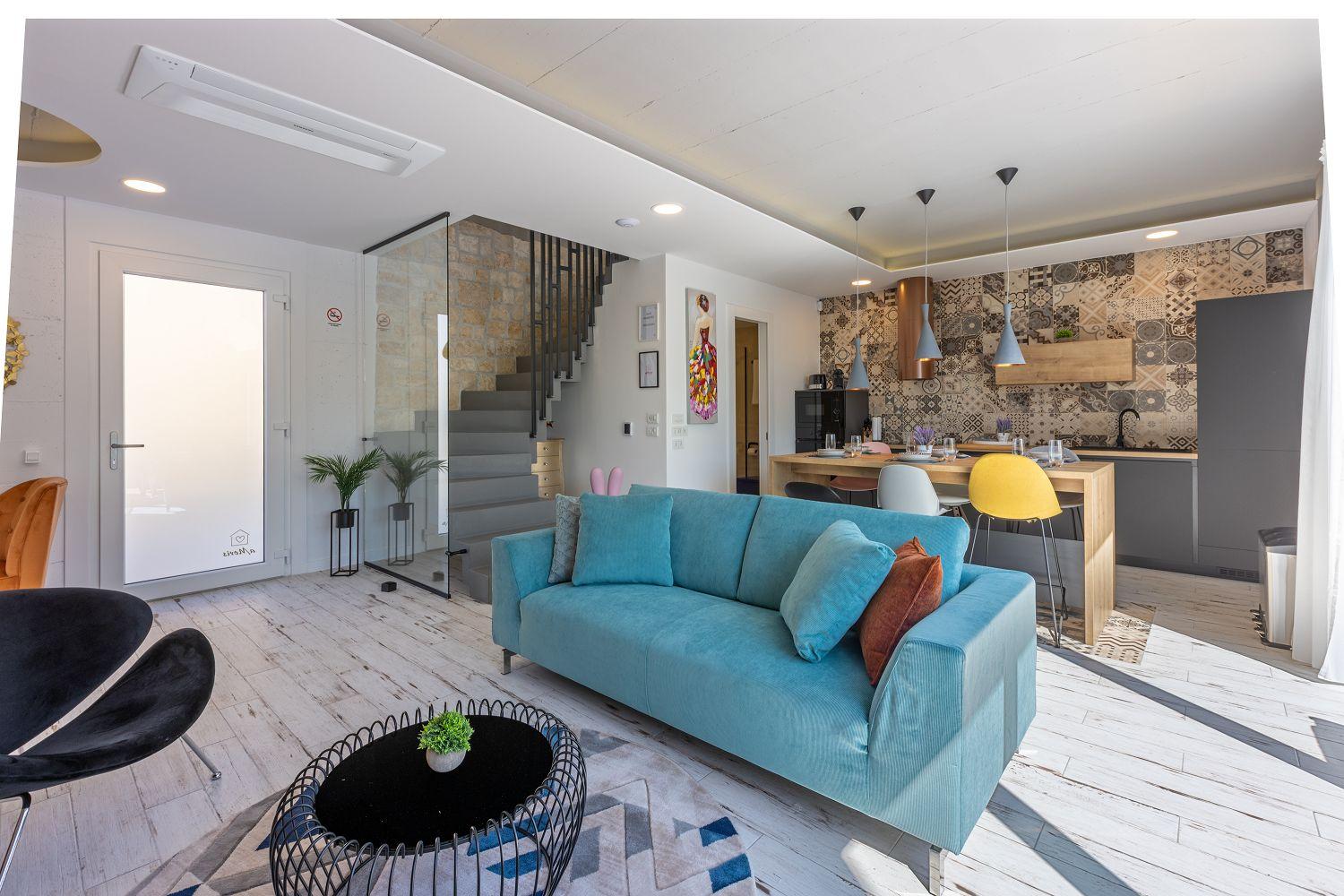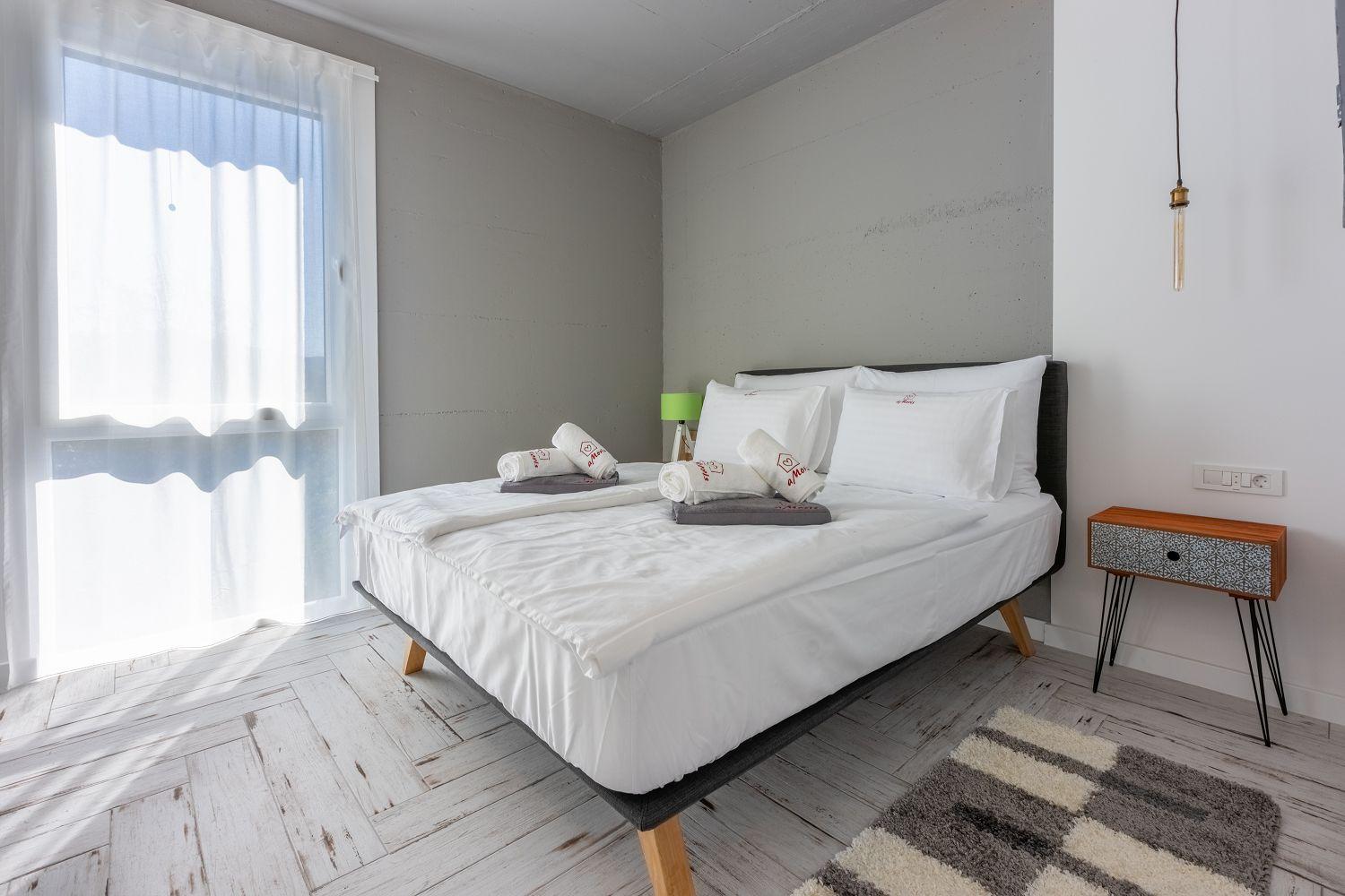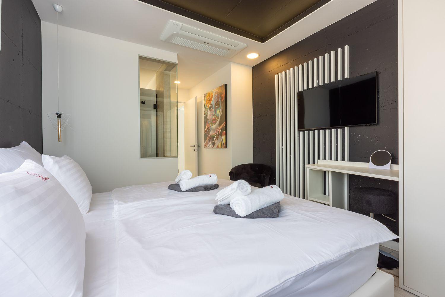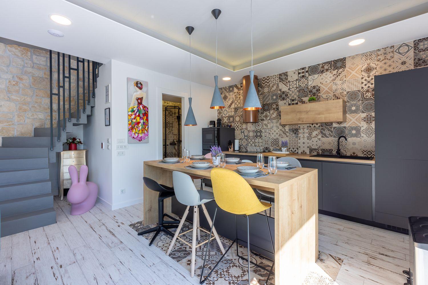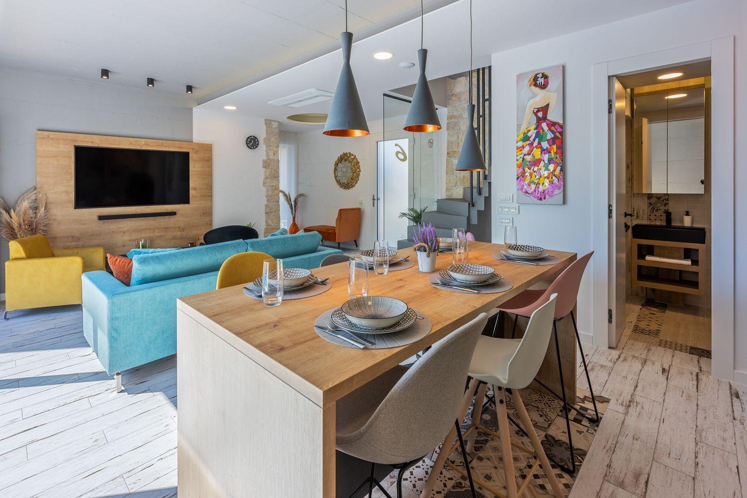 In einer ruhigen und neuen Wohngegend, direkt am berühmten Liebespfad in Crikvenica, befindet sich dieses im Jahr 2022 erbaute Ferienhaus mit eigenem Swimmingpool. Dieses im Jahr 2022 erbaute Ferienhaus verfügt über einen eigenen Swimmingpool. Das stilvoll designte Ferien-Reihenhaus bietet Platz für sechs Personen und erstreckt sich über zwei Etagen: das Erdgeschoss und das erste Obergeschoss. Vom Eingangsbereich im Erdgeschoss betritt man das Wohnzimmer mit Küche und Essbereich, das komplett ausgestattet ist. Im hinteren Bereich befindet sich ein Badezimmer. Vom Wohnbereich aus hat man direkten Zugang zum Außenbereich. Über eine Innentreppe gelangt man ins erste Obergeschoss. Das erste Schlafzimmer verfügt über getrennte Betten. Diese können bei Bedarf zusammengestellt werden. Von diesem Zimmer aus hat man einen schönen Ausblick auf das Meer, den Swimmingpool und die mittelalterliche Siedlung Kotor, die sich auf einem nahegelegenen Hügel befindet.