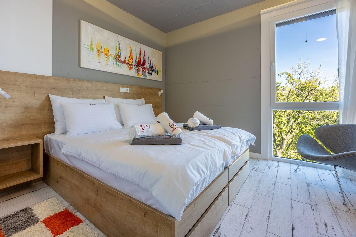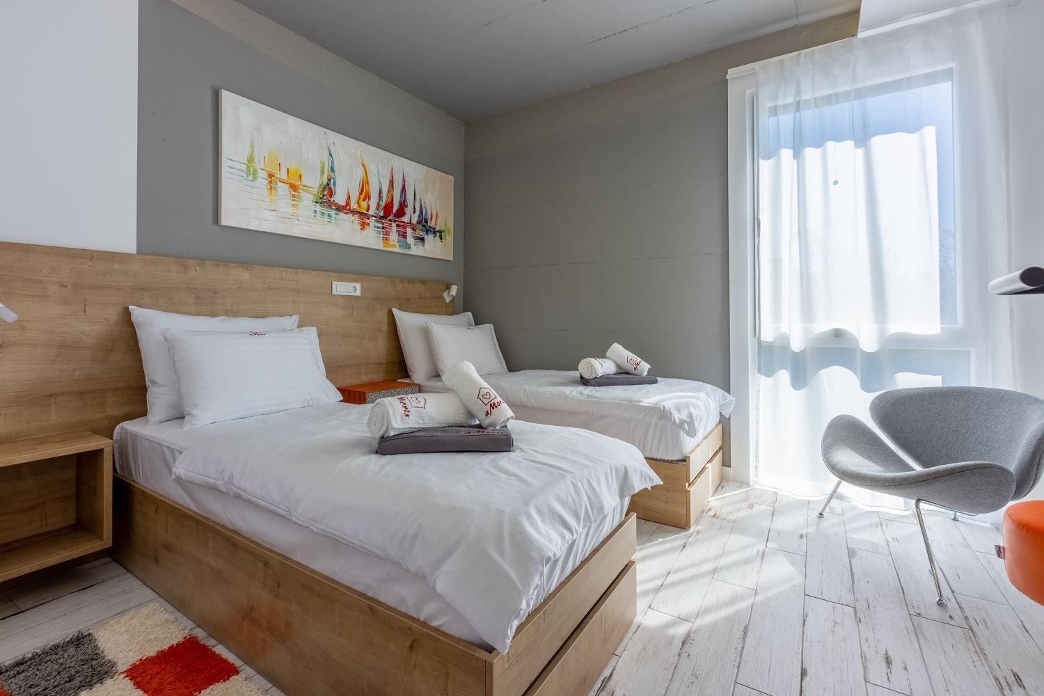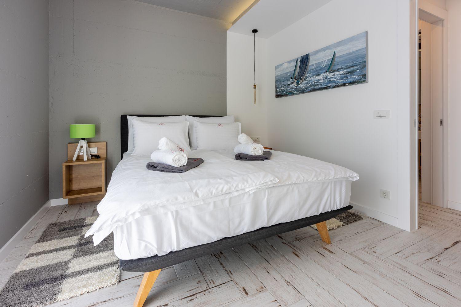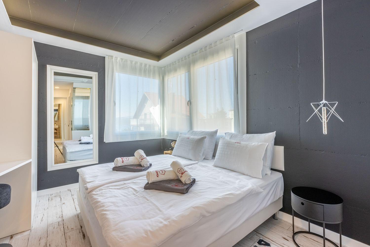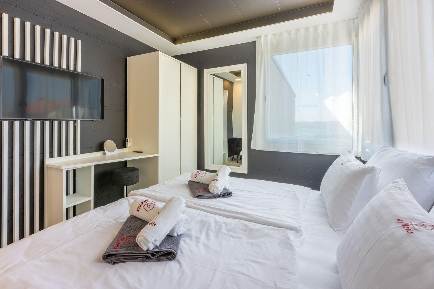 In einer ruhigen und neuen Wohngegend, direkt am berühmten Liebespfad in Crikvenica, befindet sich dieses im Jahr 2022 erbaute Ferienhaus mit eigenem Swimmingpool. Dieses im Jahr 2022 erbaute Ferienhaus verfügt über einen eigenen Swimmingpool. Das stilvoll designte Ferien-Reihenhaus bietet Platz für sechs Personen und erstreckt sich über zwei Etagen: das Erdgeschoss und das erste Obergeschoss. Vom Eingangsbereich im Erdgeschoss betritt man das Wohnzimmer mit Küche und Essbereich, das komplett ausgestattet ist. Im hinteren Bereich befindet sich ein Badezimmer. Vom Wohnbereich aus hat man direkten Zugang zum Außenbereich. Über eine Innentreppe gelangt man ins erste Obergeschoss. Das erste Schlafzimmer verfügt über getrennte Betten. Diese können bei Bedarf zusammengestellt werden. Von diesem Zimmer aus hat man einen schönen Ausblick auf das Meer, den Swimmingpool und die mittelalterliche Siedlung Kotor, die sich auf einem nahegelegenen Hügel befindet.