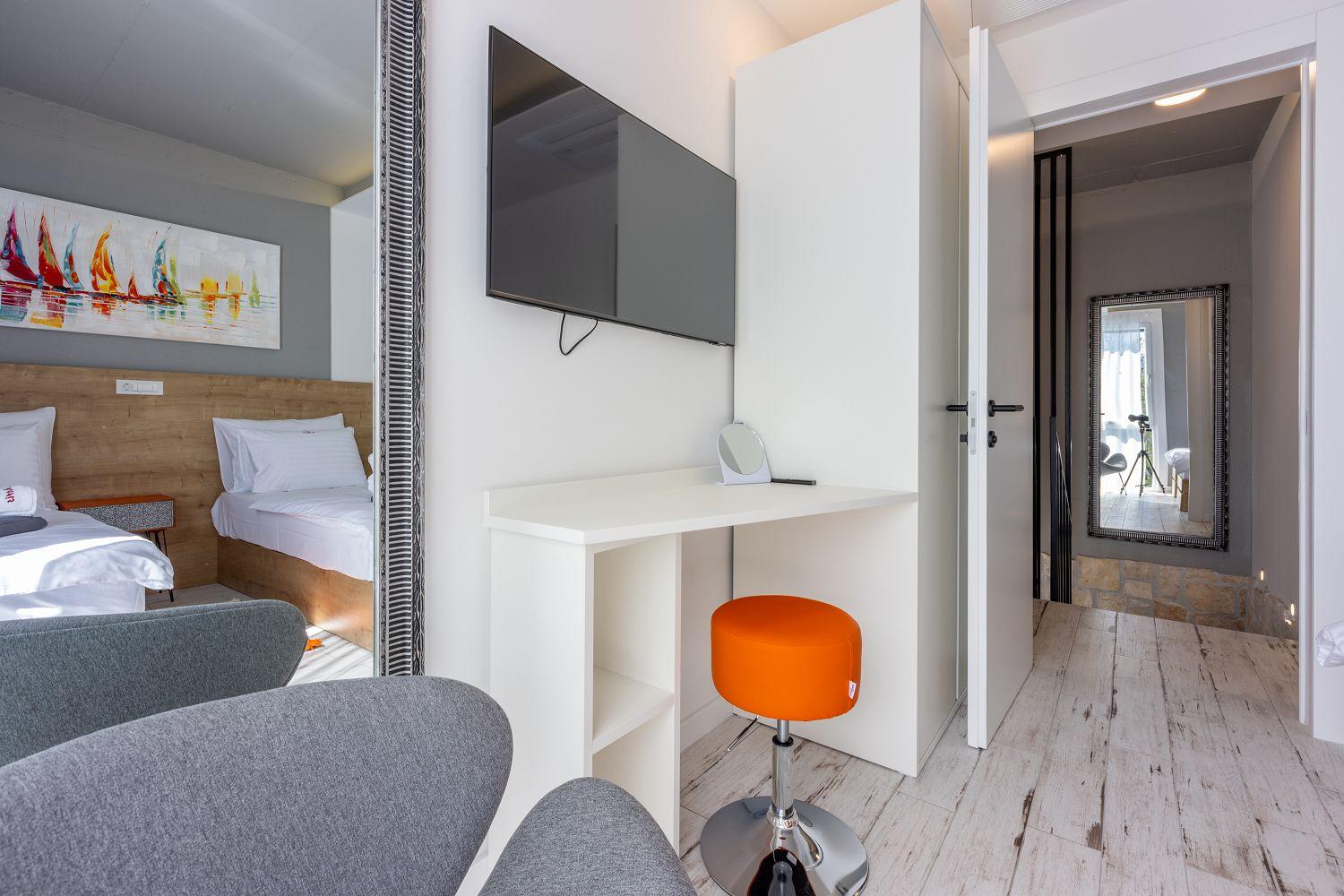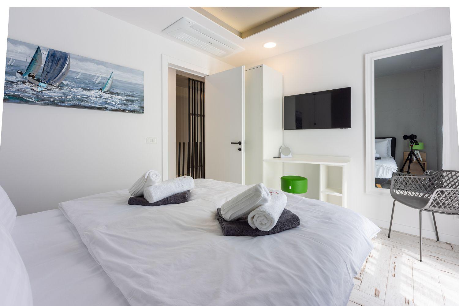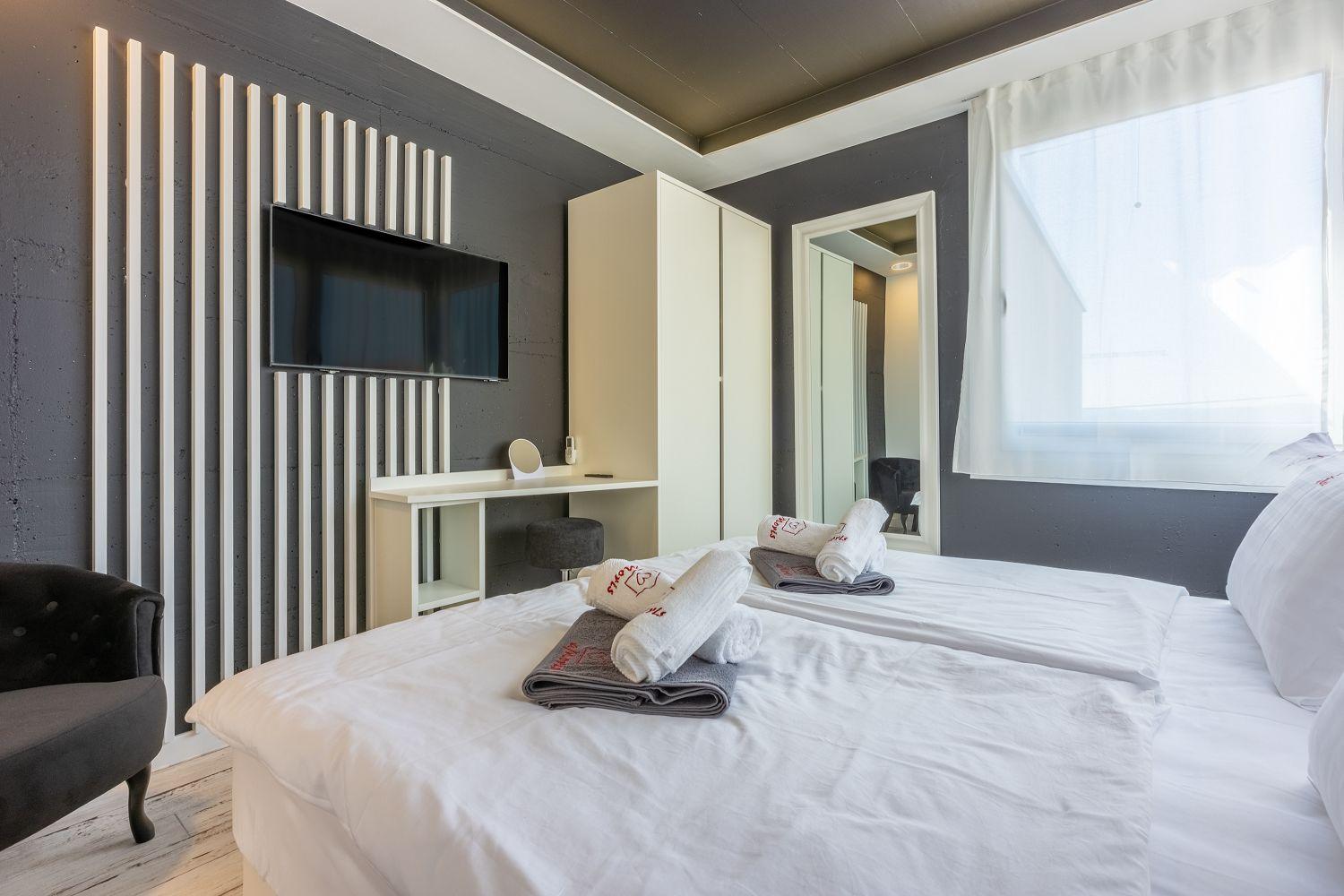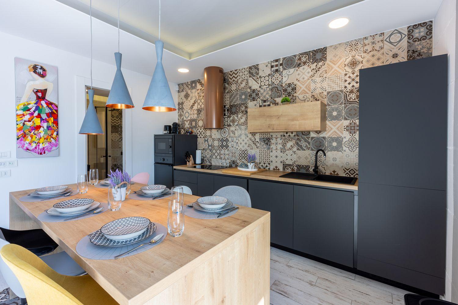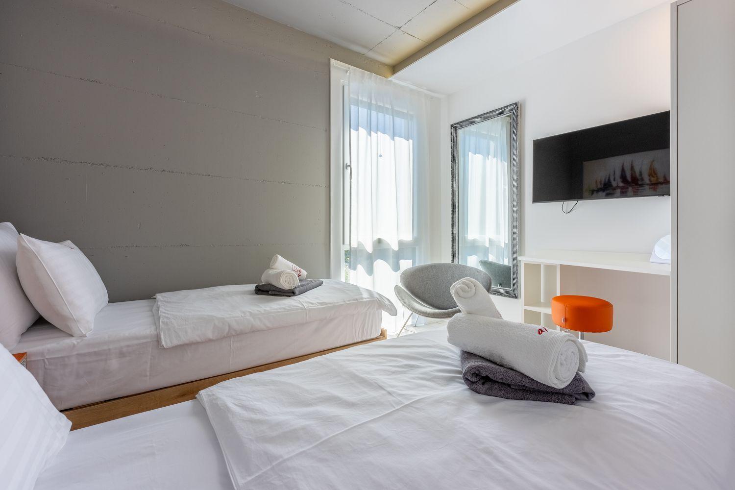 In einer ruhigen und neuen Wohngegend, direkt am berühmten Liebespfad in Crikvenica, befindet sich dieses im Jahr 2022 erbaute Ferienhaus mit eigenem Swimmingpool. Dieses im Jahr 2022 erbaute Ferienhaus verfügt über einen eigenen Swimmingpool. Das stilvoll designte Ferien-Reihenhaus bietet Platz für sechs Personen und erstreckt sich über zwei Etagen: das Erdgeschoss und das erste Obergeschoss. Vom Eingangsbereich im Erdgeschoss betritt man das Wohnzimmer mit Küche und Essbereich, das komplett ausgestattet ist. Im hinteren Bereich befindet sich ein Badezimmer. Vom Wohnbereich aus hat man direkten Zugang zum Außenbereich. Über eine Innentreppe gelangt man ins erste Obergeschoss. Das erste Schlafzimmer verfügt über getrennte Betten. Diese können bei Bedarf zusammengestellt werden. Von diesem Zimmer aus hat man einen schönen Ausblick auf das Meer, den Swimmingpool und die mittelalterliche Siedlung Kotor, die sich auf einem nahegelegenen Hügel befindet.