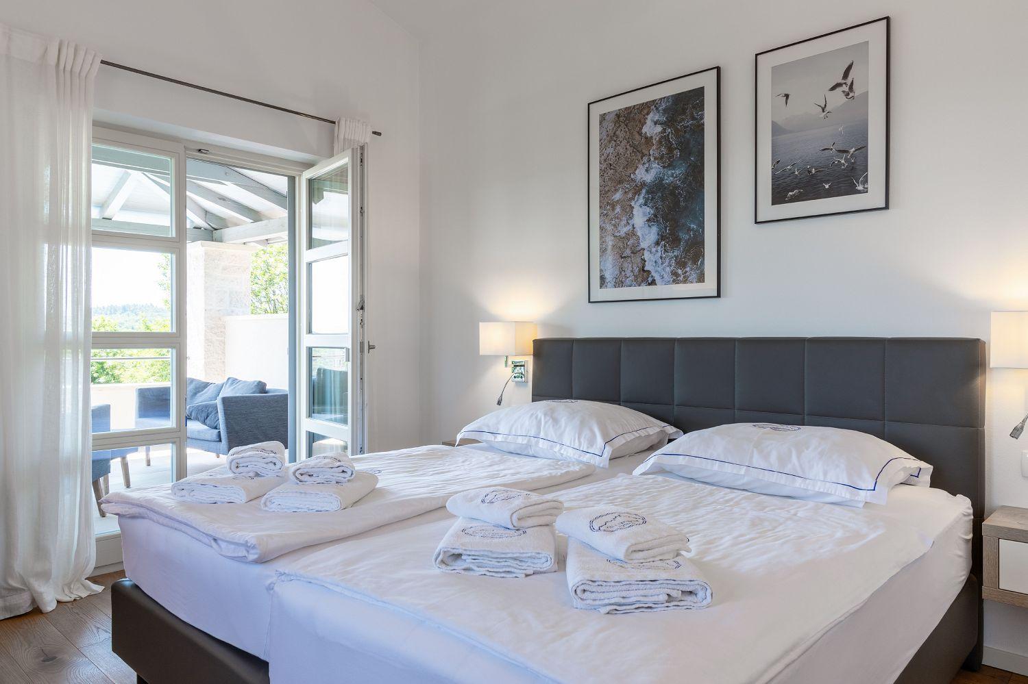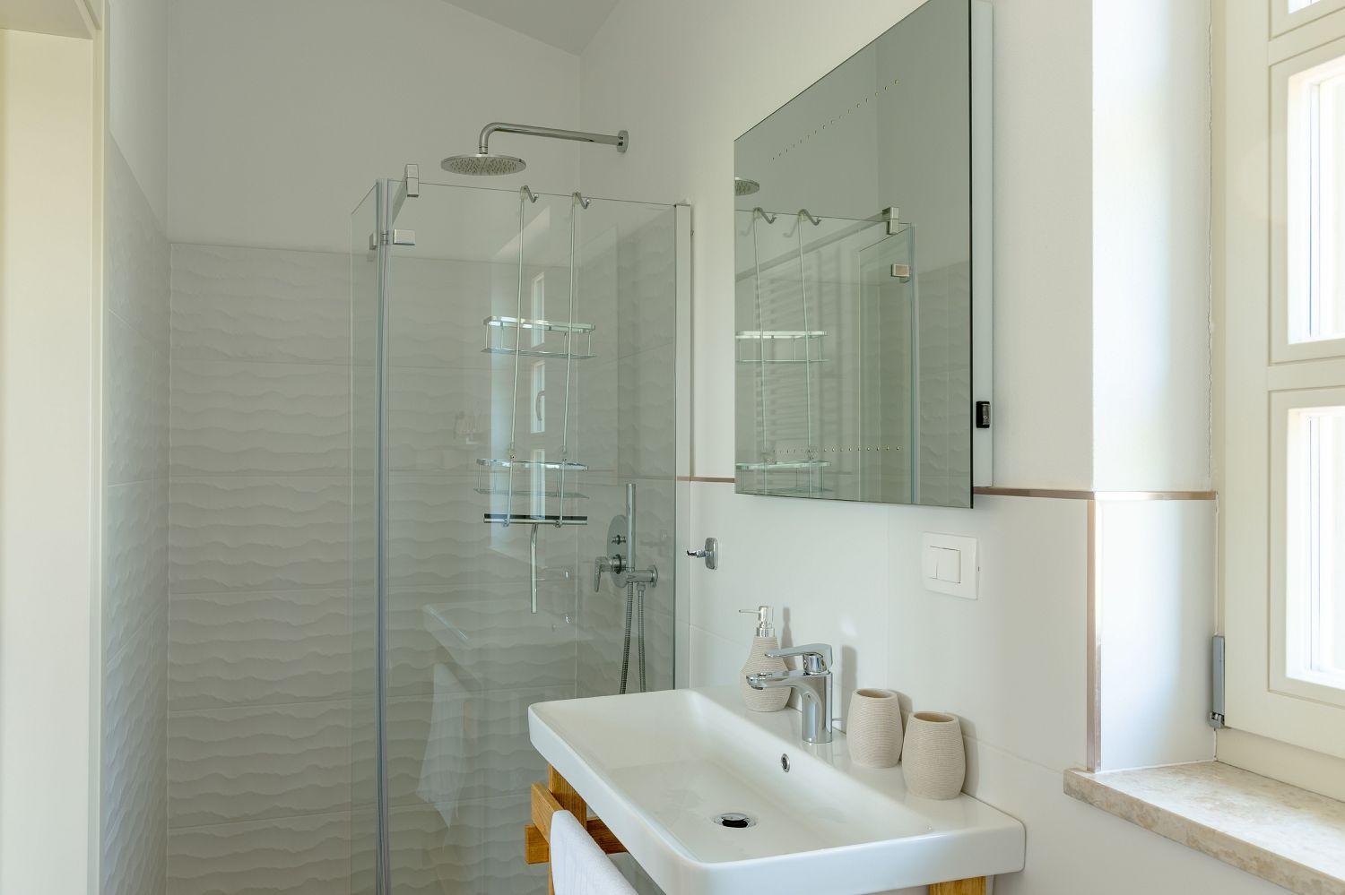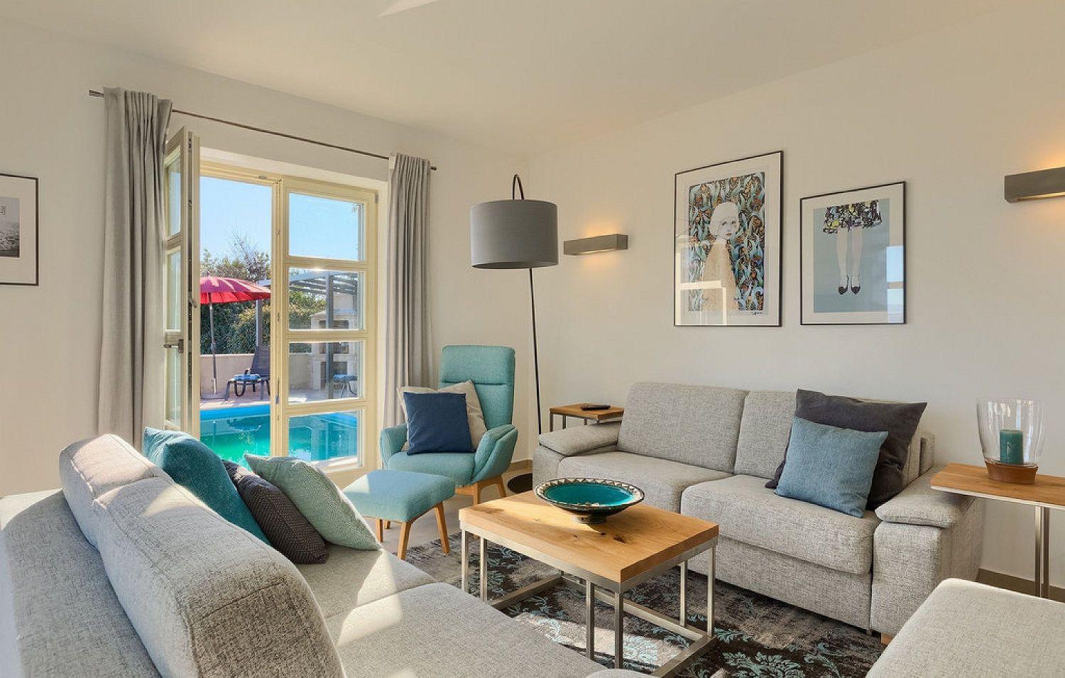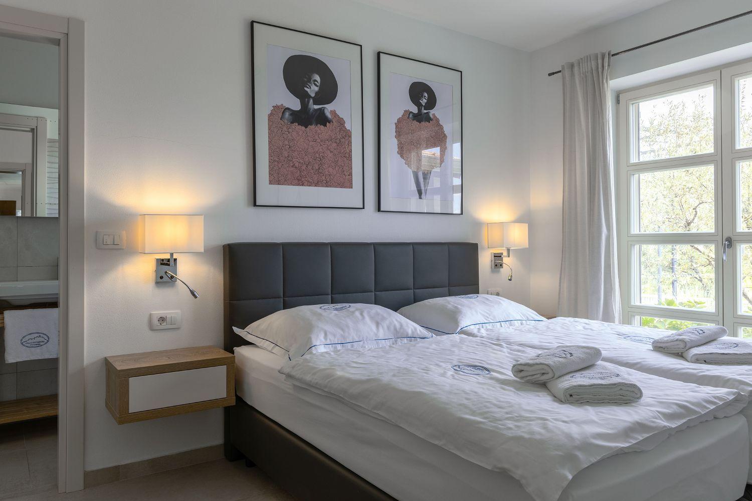 Die Villa ist ein neu erbautes Haus im istrischen Stil. Sie liegt am Rande von Vižinada und bietet einen wunderschönen Panoramablick auf Motovun und das grüne Landesinnere Istriens. Porec ist nur 20 Autominuten entfernt. Bis zum Touristenort Lanterna mit seinen schönen und gepflegten Kies- und Felsstränden sind es nur 17 Kilometer. In der Nähe gibt es mehrere Wein- und Olivenölstraßen sowie bekannte Weingüter. Für Radsportfans befindet sich in der Nähe auch der Parenzana-Rad-/Wanderweg. Das komplett eingezäunte 850 m² große Grundstück verfügt über einen 33 m² großen Pool, eine überdachte Terrasse mit Esstisch zum Verweilen und Essen im Freien, Liegestühle und einen gemauerten Grill. Im Hof befinden sich Parkplätze für zwei Fahrzeuge, außerdem ist ein Fahrradabstellraum vorhanden. Das schöne Ferienhaus mit Pool erstreckt sich über insgesamt 168 m² auf zwei vollklimatisierten Etagen. Im Erdgeschoss befindet sich ein Wohnraum mit einer voll ausgestatteten Küche, einem Esstisch, einem Wohnzimmer mit Schlafsofa für zwei Personen und einem Kamin sowie eine separate Toilette. Vom Esszimmer aus haben Sie Zugang zur schönen, überdachten Terrasse, die einen herrlichen Blick auf Motovun und die grüne Umgebung bietet. Ein Schlafzimmer mit Doppelbett und eigenem Bad mit Dusche und WC befindet sich ebenfalls im Erdgeschoss. In der ersten Etage befinden sich zwei geräumige Schlafzimmer mit jeweils eigenem Bad mit Dusche und einem geräumigen Balkon mit Sitzgelegenheiten, von dem aus Sie einen herrlichen Blick auf die grüne Landschaft haben. Kleinere Haustiere sind auf Anfrage möglich. Jugendgruppen sind nicht gestattet.