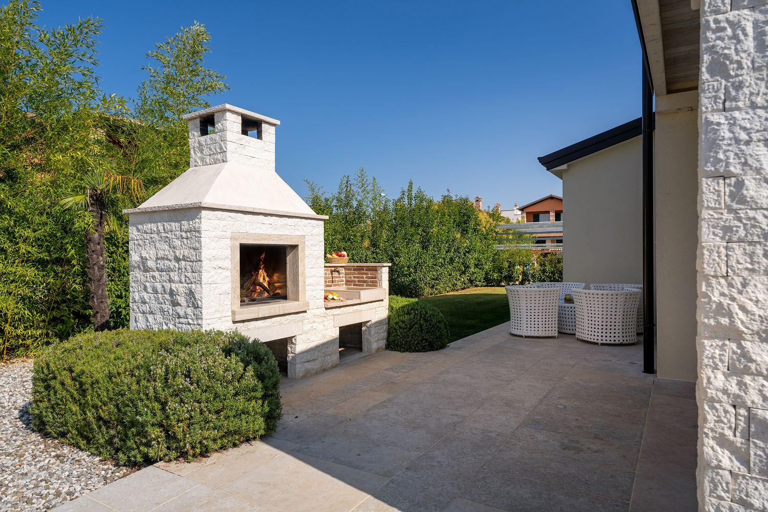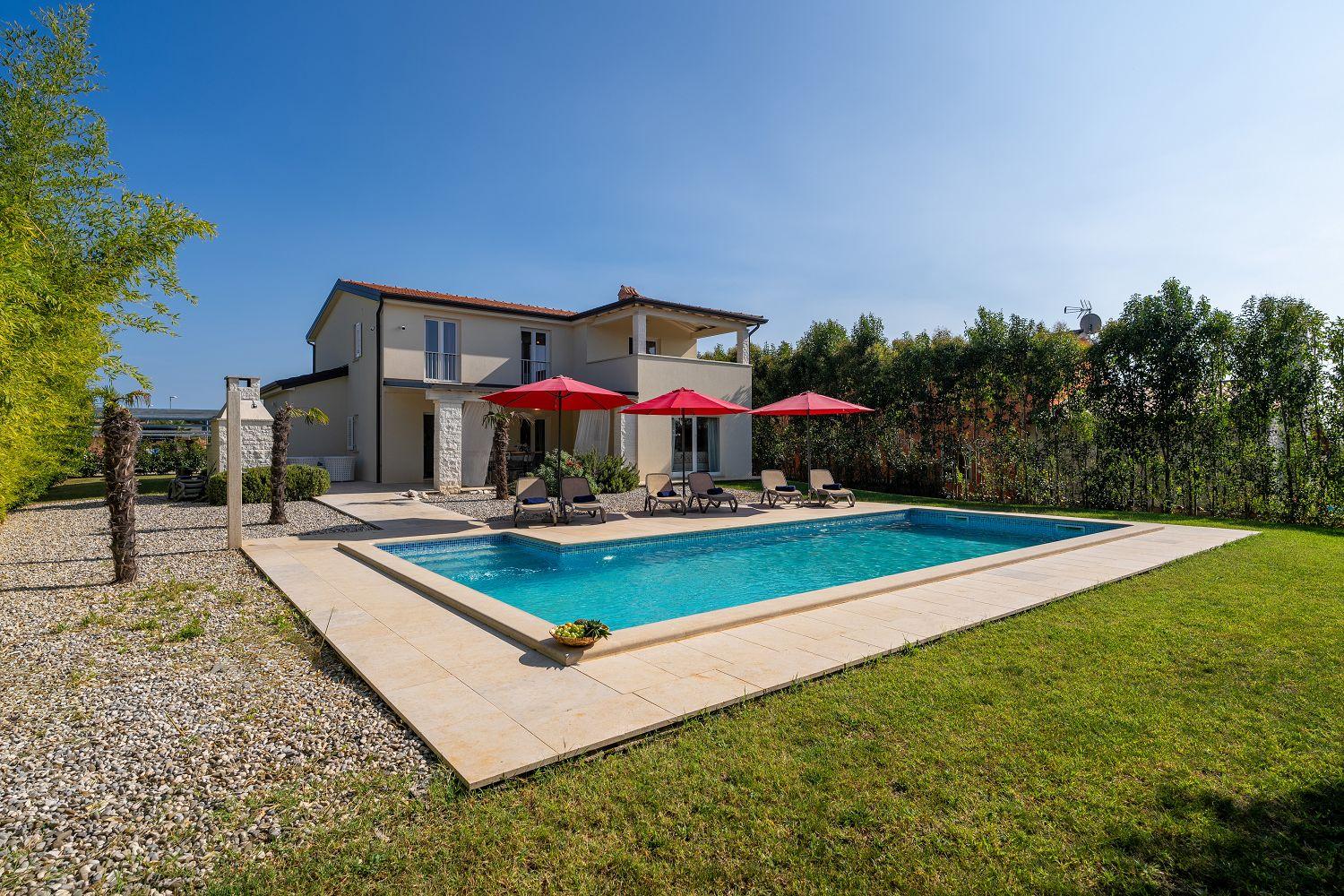 Die neu erbaute Villa mit Pool liegt am Rande des Ortes Labinci, unweit von Porec. In Kaštelir, nur 2–3 Autominuten entfernt, gibt es viele nützliche Einrichtungen, darunter ein Lebensmittelgeschäft (500 m vom Haus entfernt) sowie typische Restaurants, Kaffeebars, Agrotourismusbetriebe und Weinstraßen. Die nächsten Kiesstrände sowie Sport- und Freizeiteinrichtungen befinden sich im 9 km entfernten Touristenort Lanterna. Das Haus verfügt über einen eigenen, ca. 1.100 m² großen, gepflegten Garten, der ruhig gelegen ist und einen wunderschönen Panoramablick auf das Meer bietet. Im Außenbereich bietet die Villa Domenica Exclusive ihren Gästen einen privaten, überdachten Parkplatz für zwei Fahrzeuge, einen 40 m² großen Pool mit Liegestühlen und Sitzgarnitur, eine überdachte Terrasse mit Sitzgelegenheiten sowie einen gemauerten Grill. Die Villa ist 200 m² groß, voll klimatisiert und für acht Personen ausgelegt. Sie erstreckt sich über zwei Etagen. Im Erdgeschoss befinden sich eine Küche mit Esstisch, ein geräumiges Wohnzimmer mit Zugang zu einer überdachten Terrasse und Pool sowie ein Schlafzimmer mit Dusche/WC. Im Flur steht eine weitere Dusche/WC zur Verfügung. Im ersten Stock befinden sich drei geräumige Schlafzimmer mit Doppelbetten und jeweils eigener Dusche/WC, eines davon mit Balkon und wunderschönem Panoramablick auf das Meer. Haustiere sind erlaubt. Jugendgruppen sind nicht gestattet.