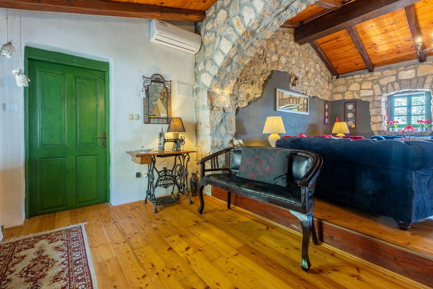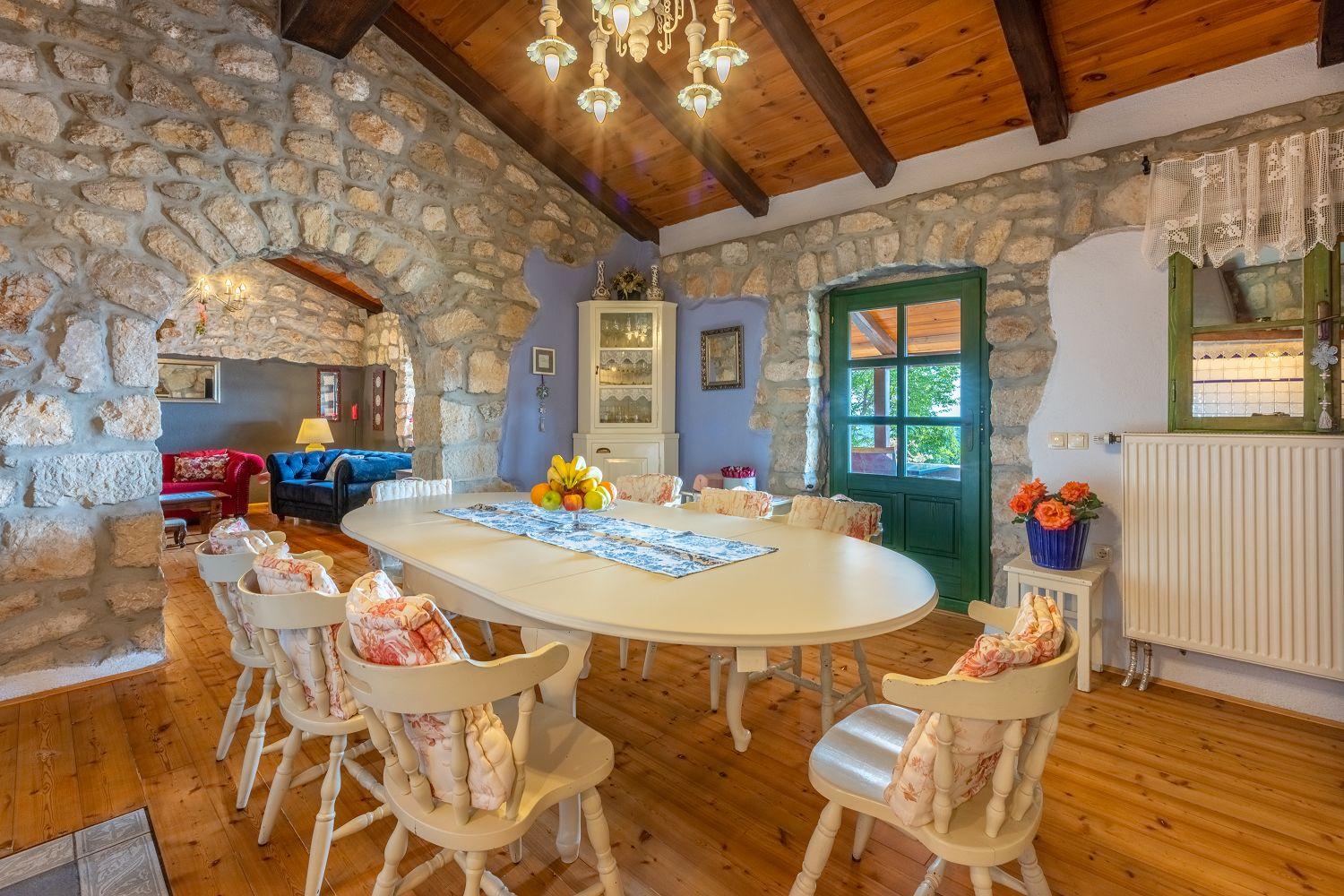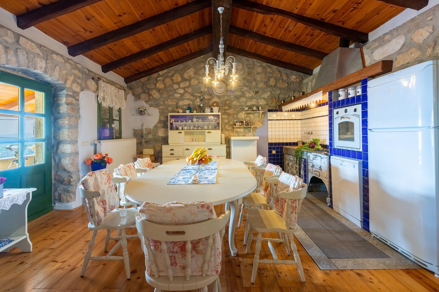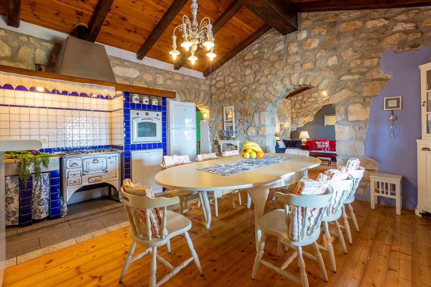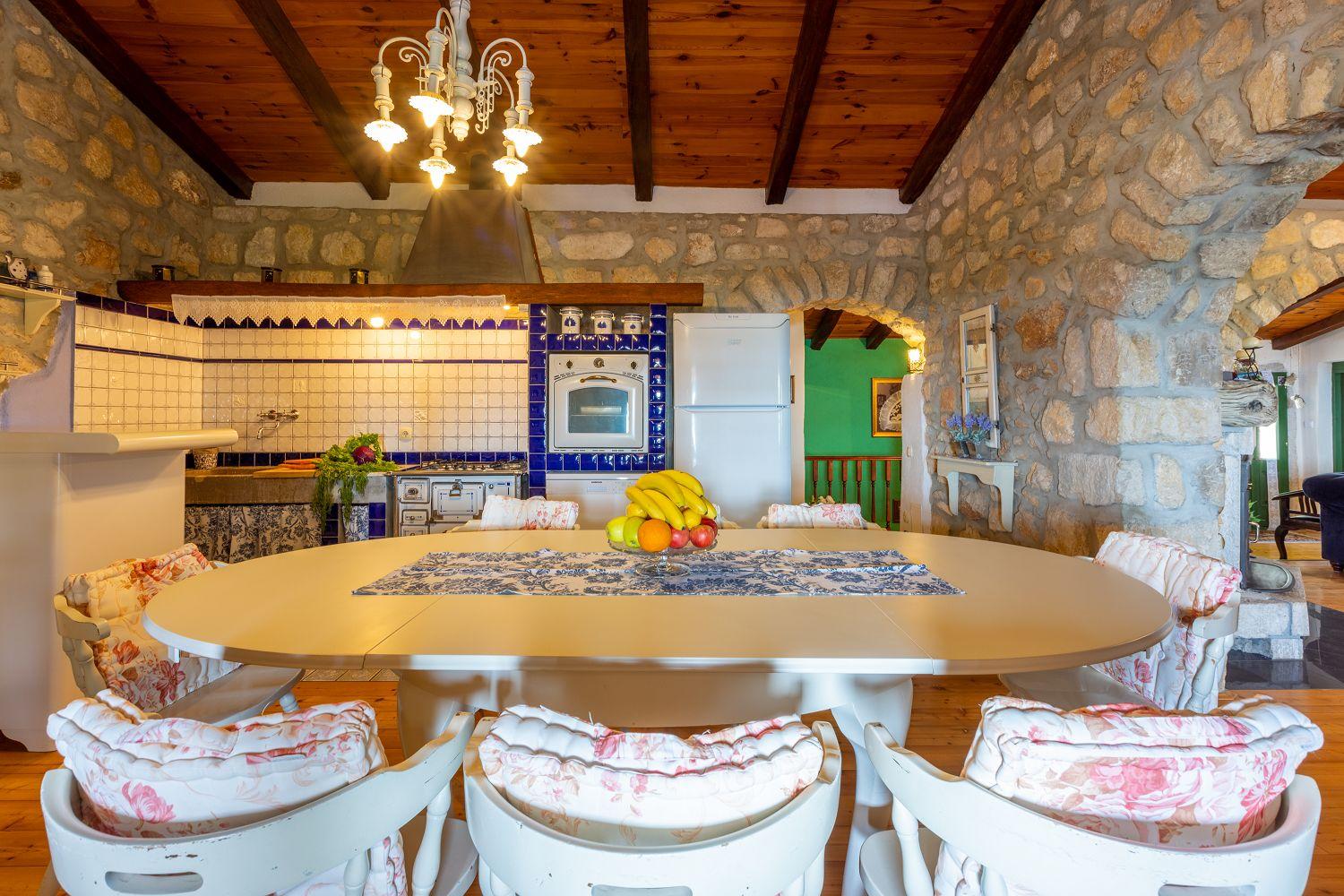 Das Ferienhaus erstreckt sich über zwei Etagen und bietet auf ca. 220 m² Wohnfläche mehrere Eingänge von allen Seiten. Die Räume sind sehr groß: Das Wohnzimmer ist ca. 30 m² groß, die Küche mit Esszimmer ebenfalls. Die Räume sind offen und vermitteln dadurch ein Gefühl von Freiheit. Die Schlafzimmer sind jedoch für ruhiges Schlafen voneinander getrennt. Es gibt luxuriös eingerichtete und sehr große Bäder, eine Terrasse mit Meerblick, einen Garten vor dem Haus und einen weiteren großen Garten hinter dem Haus. Das Haus wird ganzjährig vermietet und ist komplett beheizt, die Bäder verfügen sogar über Fußbodenheizung. Zwei größere Schlafzimmer befinden sich im Erdgeschoss und haben direkten Zugang zur Terrasse. Auf der anderen Seite befinden sich zwei große Bäder mit jeweils zwei Waschbecken aus Stein. In beiden Zimmern steht jeweils ein rustikales Doppelbett (ca. 160 x 200 cm) mit Top-Matratzen sowie ein weiteres Einzelbett. Ob Sie das Einzelbett benutzen möchten, ist Ihnen überlassen. Durch die Treppe im Flur sind beide Zimmer mit dem ersten Geschoss verbunden. Dort befindet sich ein weiteres, jedoch kleineres Schlafzimmer mit einem Doppelbett (140 x 200 cm). Neben dem Zimmer steht eine Toilette mit Waschbecken zur Verfügung. Weiter geht es zum Wohnzimmer, in dem sich auch eine Klimaanlage befindet. Von hier aus gelangt man zur Terrasse/zum Balkon sowie durch eine massive gewölbte Steinöffnung in die Küche und das Esszimmer. Vom Wohnzimmer aus gelangt man auch zur Garage. Auf der anderen Seite befindet sich der Haupteingang. Im Wohnzimmer stehen ein SAT-TV mit DVD-Player und Surround-System zur Verfügung. Es ist auch Wireless Internet vorhanden. Die Küche ist mit Besteck, Pfannen, Töpfen und Küchentüchern ausgestattet. Weiterhin vorhanden sind ein Toaster, eine Mikrowelle, ein Wasserkocher und natürlich eine Kaffeemaschine. Ein Geschirrspüler ist ebenfalls vorhanden. Alle Betten sind mit Bettwäsche bezogen. Die Bettwäsche wird einmal wöchentlich gewechselt, sofern der Aufenthalt mindestens zwei Wochen beträgt. Handtücher für das Badezimmer werden ebenfalls zur Verfügung gestellt.