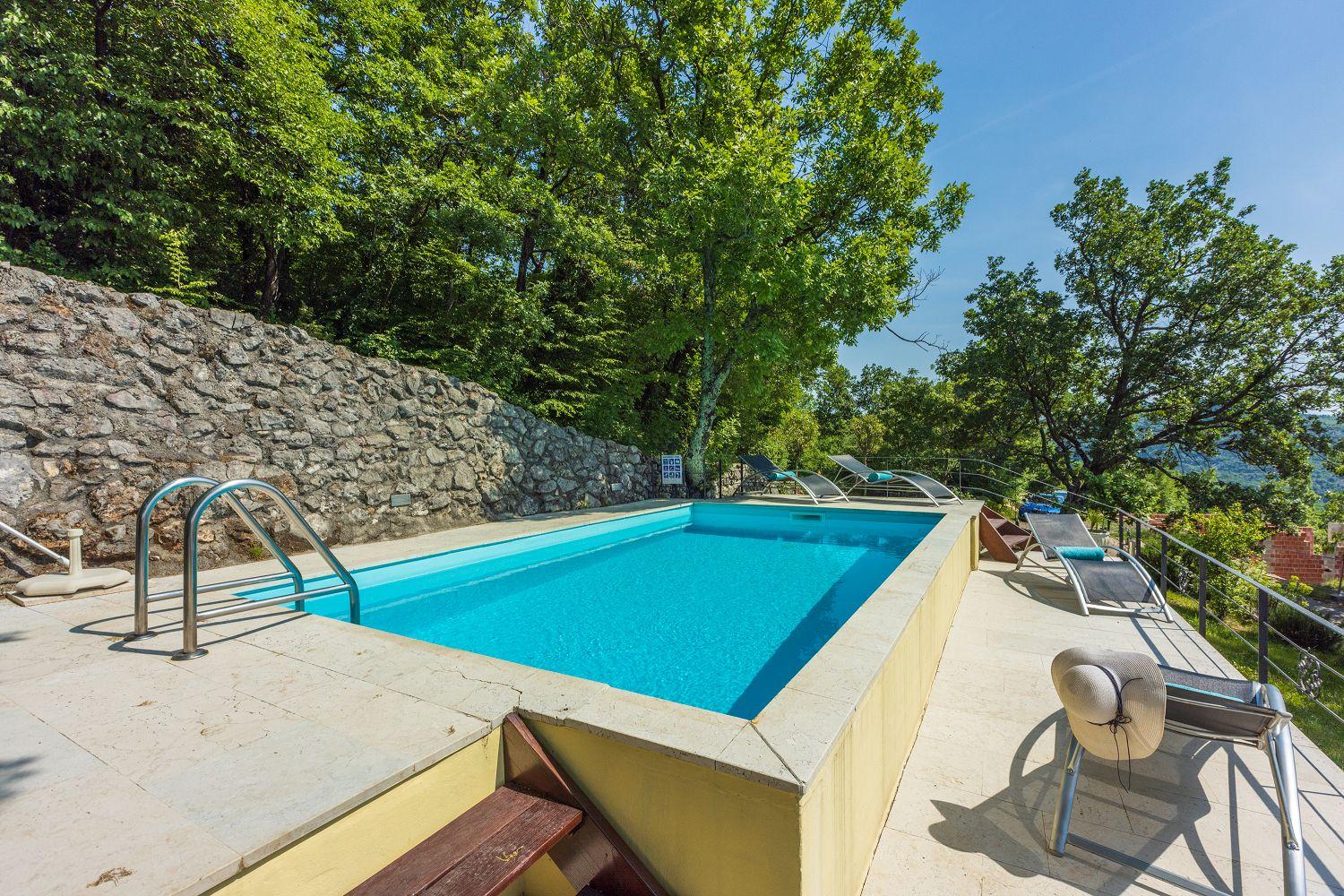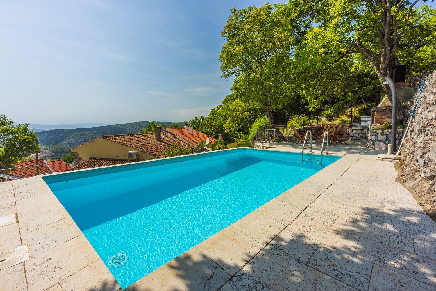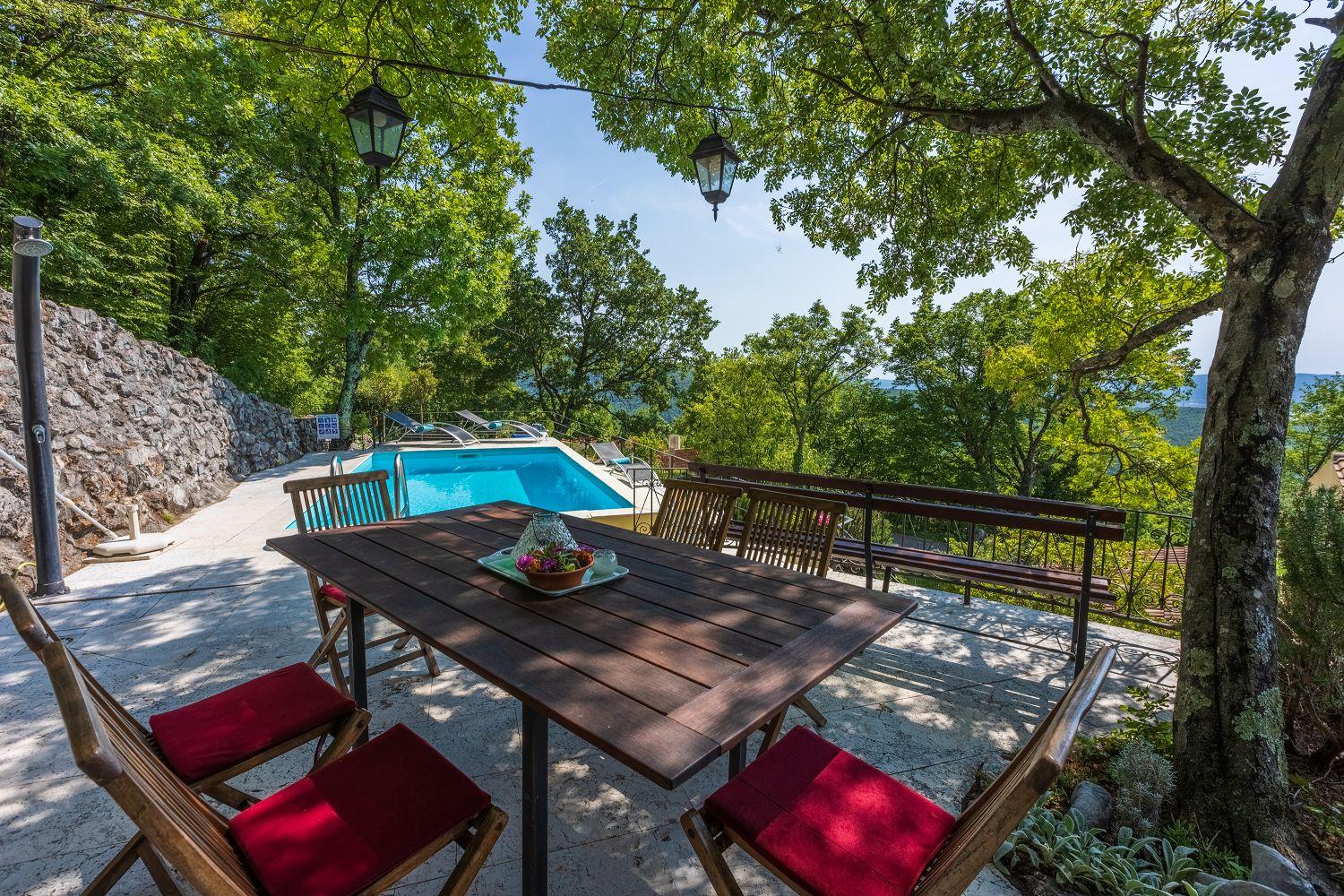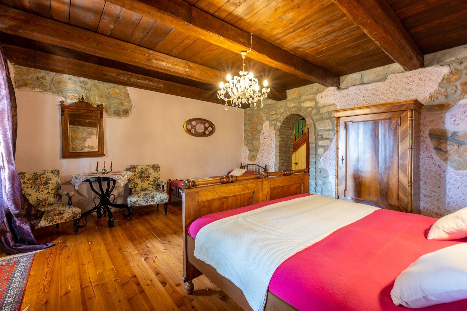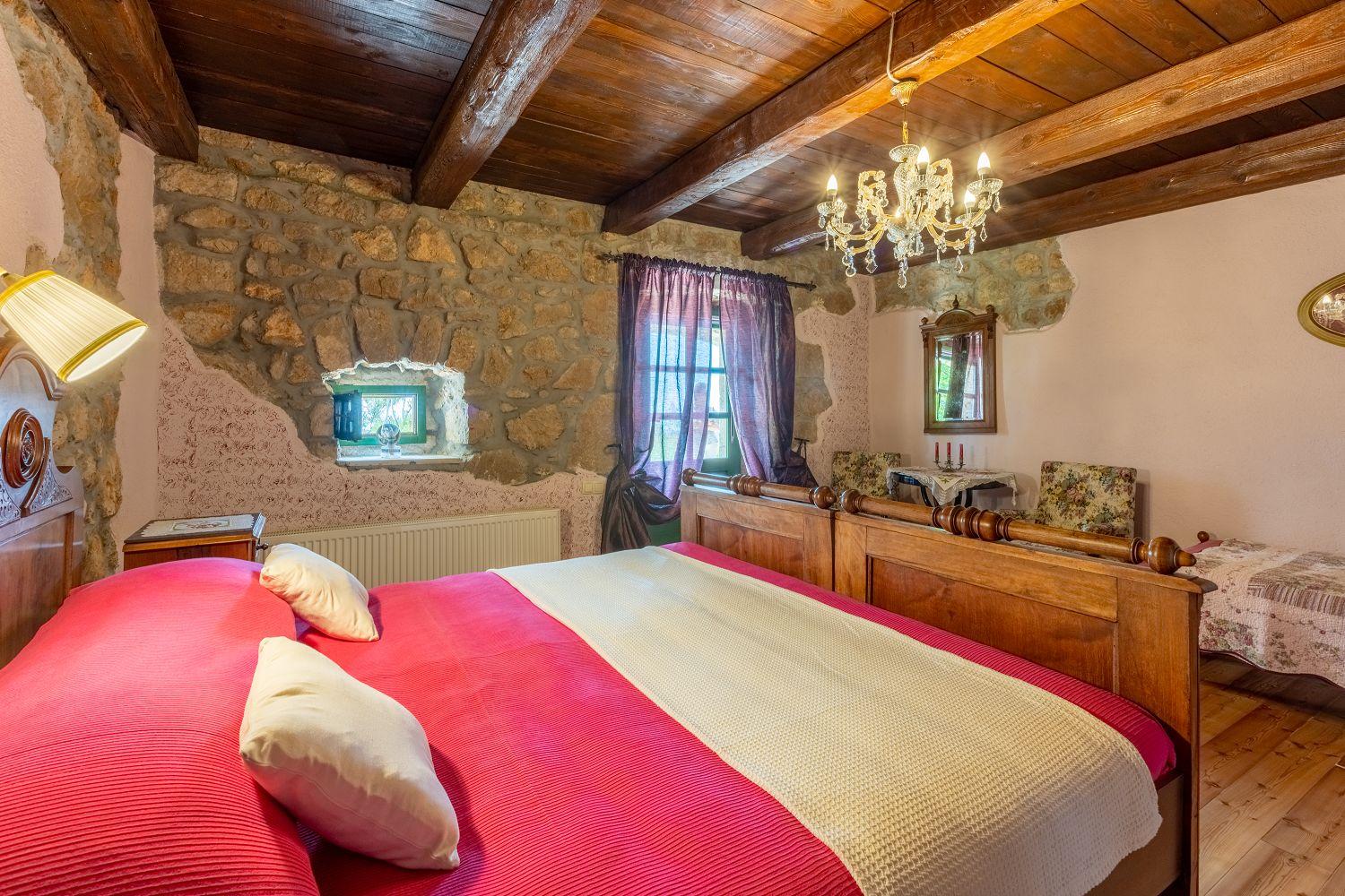 Das Ferienhaus erstreckt sich über zwei Etagen und bietet auf ca. 220 m² Wohnfläche mehrere Eingänge von allen Seiten. Die Räume sind sehr groß: Das Wohnzimmer ist ca. 30 m² groß, die Küche mit Esszimmer ebenfalls. Die Räume sind offen und vermitteln dadurch ein Gefühl von Freiheit. Die Schlafzimmer sind jedoch für ruhiges Schlafen voneinander getrennt. Es gibt luxuriös eingerichtete und sehr große Bäder, eine Terrasse mit Meerblick, einen Garten vor dem Haus und einen weiteren großen Garten hinter dem Haus. Das Haus wird ganzjährig vermietet und ist komplett beheizt, die Bäder verfügen sogar über Fußbodenheizung. Zwei größere Schlafzimmer befinden sich im Erdgeschoss und haben direkten Zugang zur Terrasse. Auf der anderen Seite befinden sich zwei große Bäder mit jeweils zwei Waschbecken aus Stein. In beiden Zimmern steht jeweils ein rustikales Doppelbett (ca. 160 x 200 cm) mit Top-Matratzen sowie ein weiteres Einzelbett. Ob Sie das Einzelbett benutzen möchten, ist Ihnen überlassen. Durch die Treppe im Flur sind beide Zimmer mit dem ersten Geschoss verbunden. Dort befindet sich ein weiteres, jedoch kleineres Schlafzimmer mit einem Doppelbett (140 x 200 cm). Neben dem Zimmer steht eine Toilette mit Waschbecken zur Verfügung. Weiter geht es zum Wohnzimmer, in dem sich auch eine Klimaanlage befindet. Von hier aus gelangt man zur Terrasse/zum Balkon sowie durch eine massive gewölbte Steinöffnung in die Küche und das Esszimmer. Vom Wohnzimmer aus gelangt man auch zur Garage. Auf der anderen Seite befindet sich der Haupteingang. Im Wohnzimmer stehen ein SAT-TV mit DVD-Player und Surround-System zur Verfügung. Es ist auch Wireless Internet vorhanden. Die Küche ist mit Besteck, Pfannen, Töpfen und Küchentüchern ausgestattet. Weiterhin vorhanden sind ein Toaster, eine Mikrowelle, ein Wasserkocher und natürlich eine Kaffeemaschine. Ein Geschirrspüler ist ebenfalls vorhanden. Alle Betten sind mit Bettwäsche bezogen. Die Bettwäsche wird einmal wöchentlich gewechselt, sofern der Aufenthalt mindestens zwei Wochen beträgt. Handtücher für das Badezimmer werden ebenfalls zur Verfügung gestellt.
