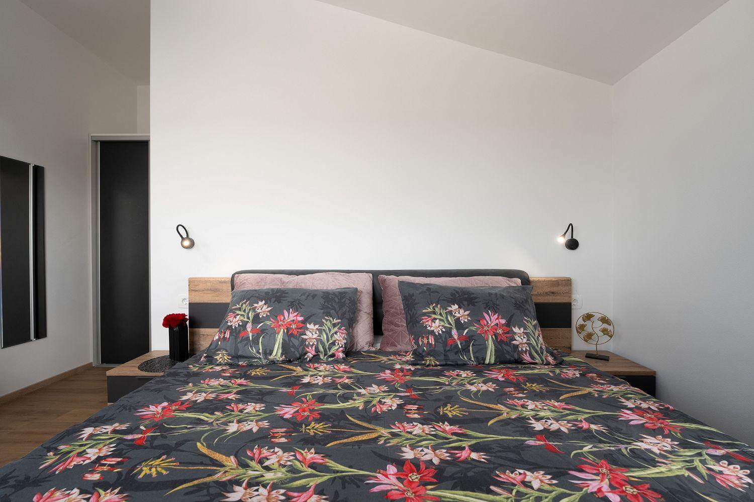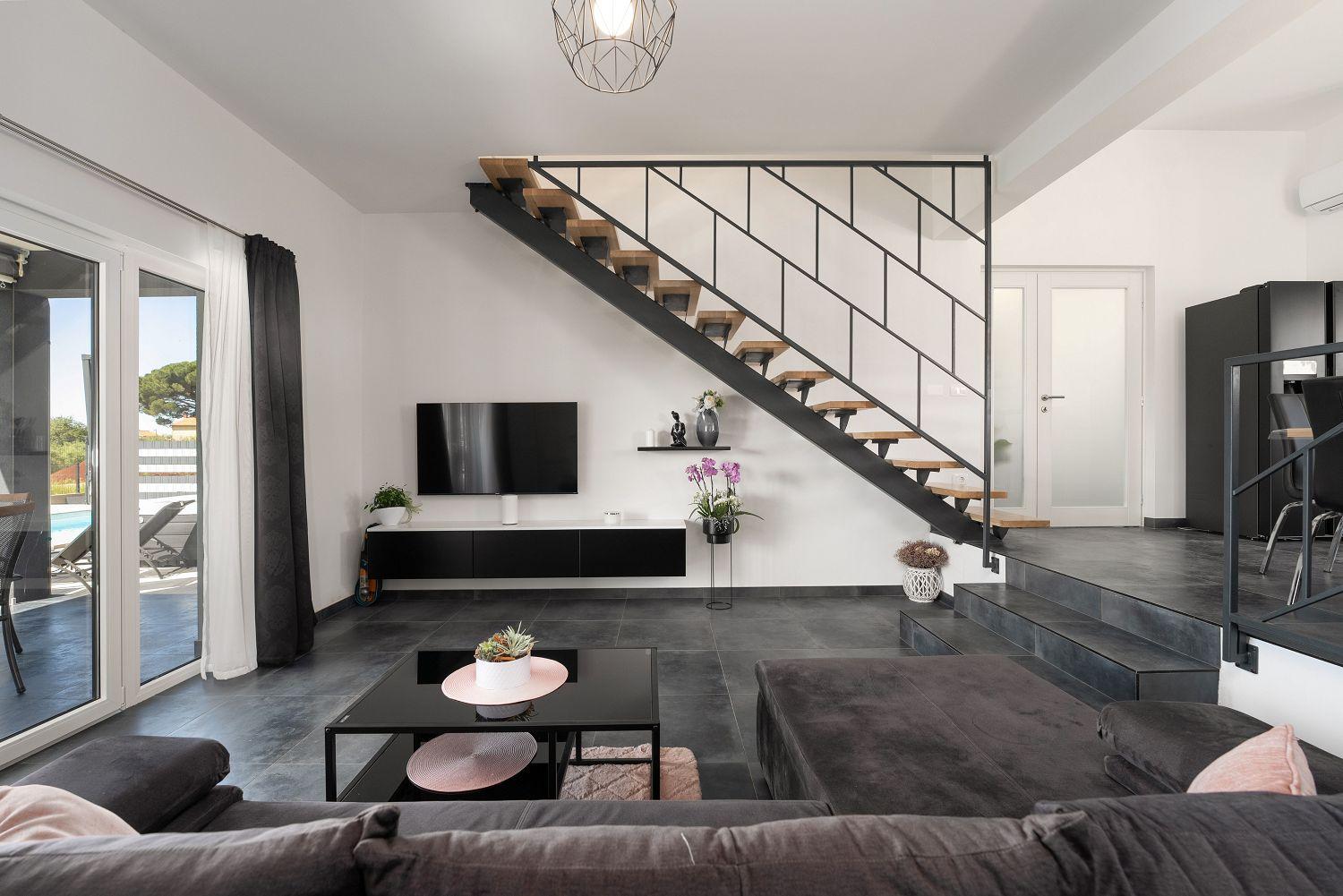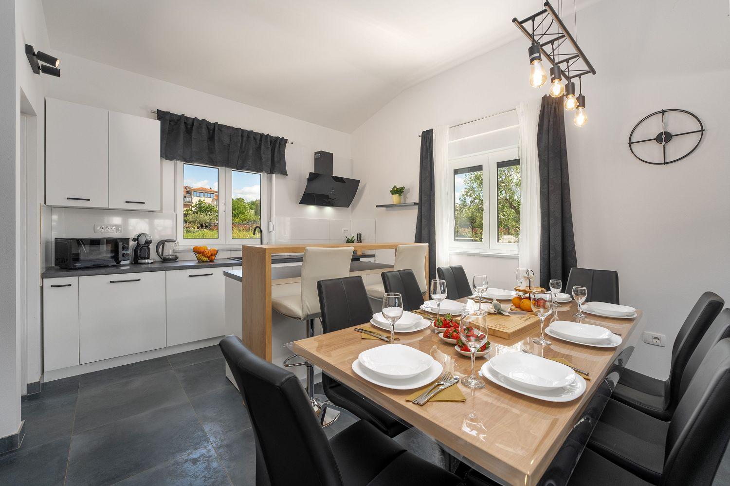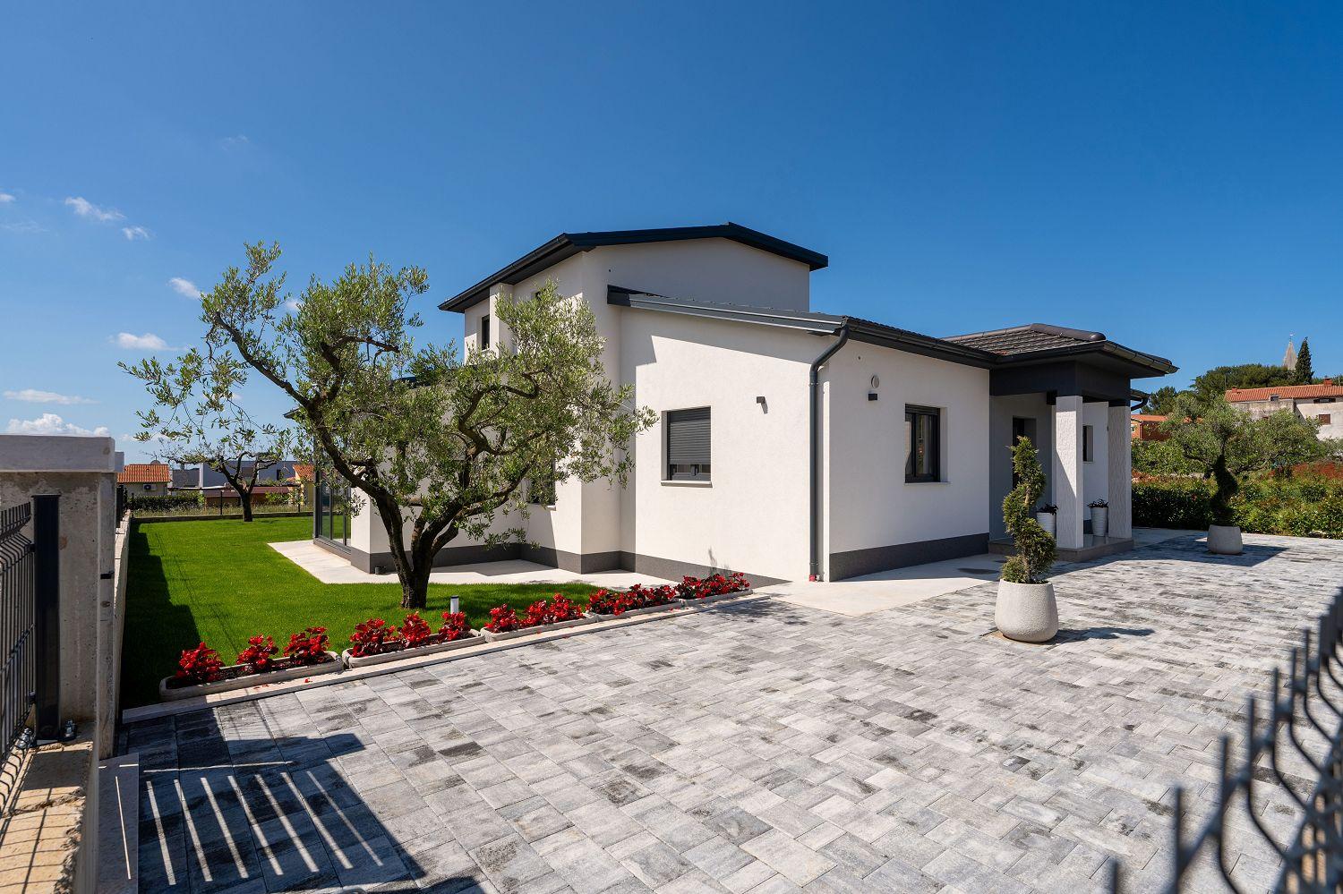 Die Villa ist ein neugebautes Ferienhaus in Kastelir, das ca. 12 km von Porec und 8 km vom Meer entfernt liegt. In der Nähe befinden sich ein Geschäft, ein Restaurant, eine Pizzeria, ein Geldautomat und weitere Einrichtungen. Das Haus steht auf einem 950 m² großen, eingezäunten Grundstück mit angelegtem Rasen und Olivenbäumen. Das 2023 erbaute Haus bietet einen wunderschönen Panoramablick auf das Meer und die Umgebung. Im Außenbereich stehen den Gästen ein Pool mit Sonnenliegen, ein Jacuzzi, eine Sauna, eine separate Toilette, eine überdachte Terrasse mit Gartenmöbeln und Grill sowie zwei Parkplätze zur Verfügung. Das neue Ferienhaus für 6–7 Personen verfügt über 160 m² Wohnfläche auf zwei voll klimatisierten Etagen und ist mit modernen Möbeln ausgestattet. Im Erdgeschoss befindet sich der Wohnbereich mit einer voll ausgestatteten Küche, einem Esstisch und einem Wohnzimmer mit Zugang zur überdachten Terrasse und zum Garten. Außerdem gibt es ein Doppelzimmer mit Dusche/WC und ein Schlafzimmer mit getrennten Betten und eigener Dusche/WC. Im Obergeschoss befindet sich ein geräumiges Doppelzimmer mit wunderschönem Panoramameerblick und ein Badezimmer mit Dusche/WC.