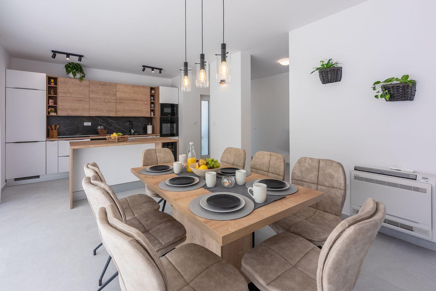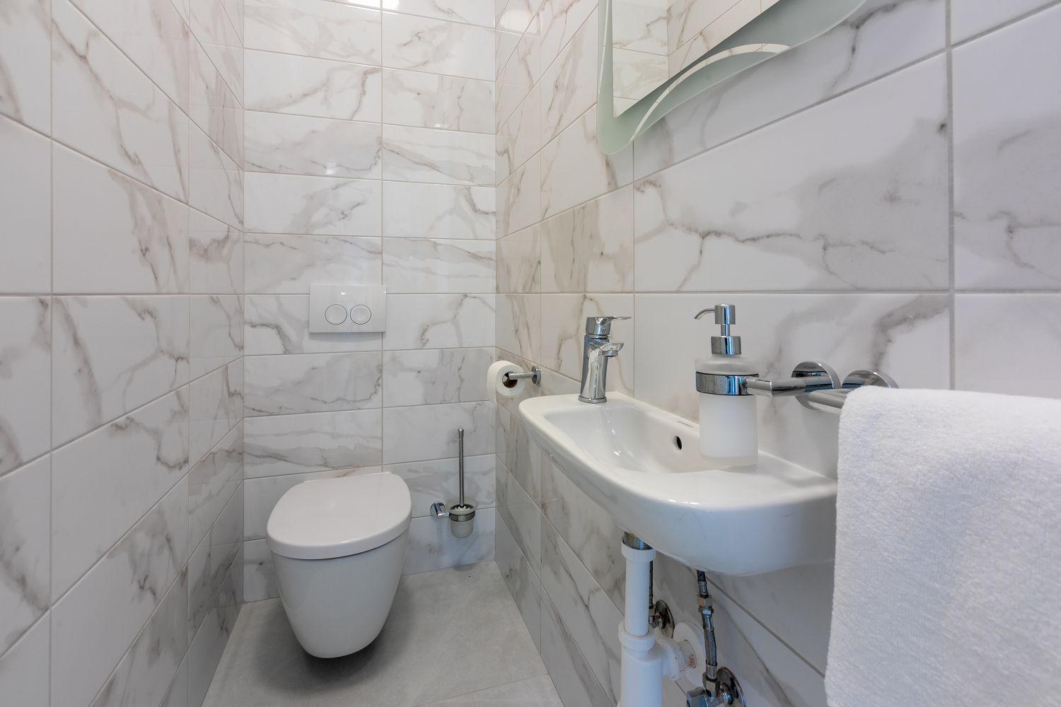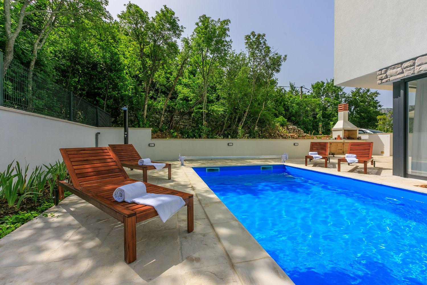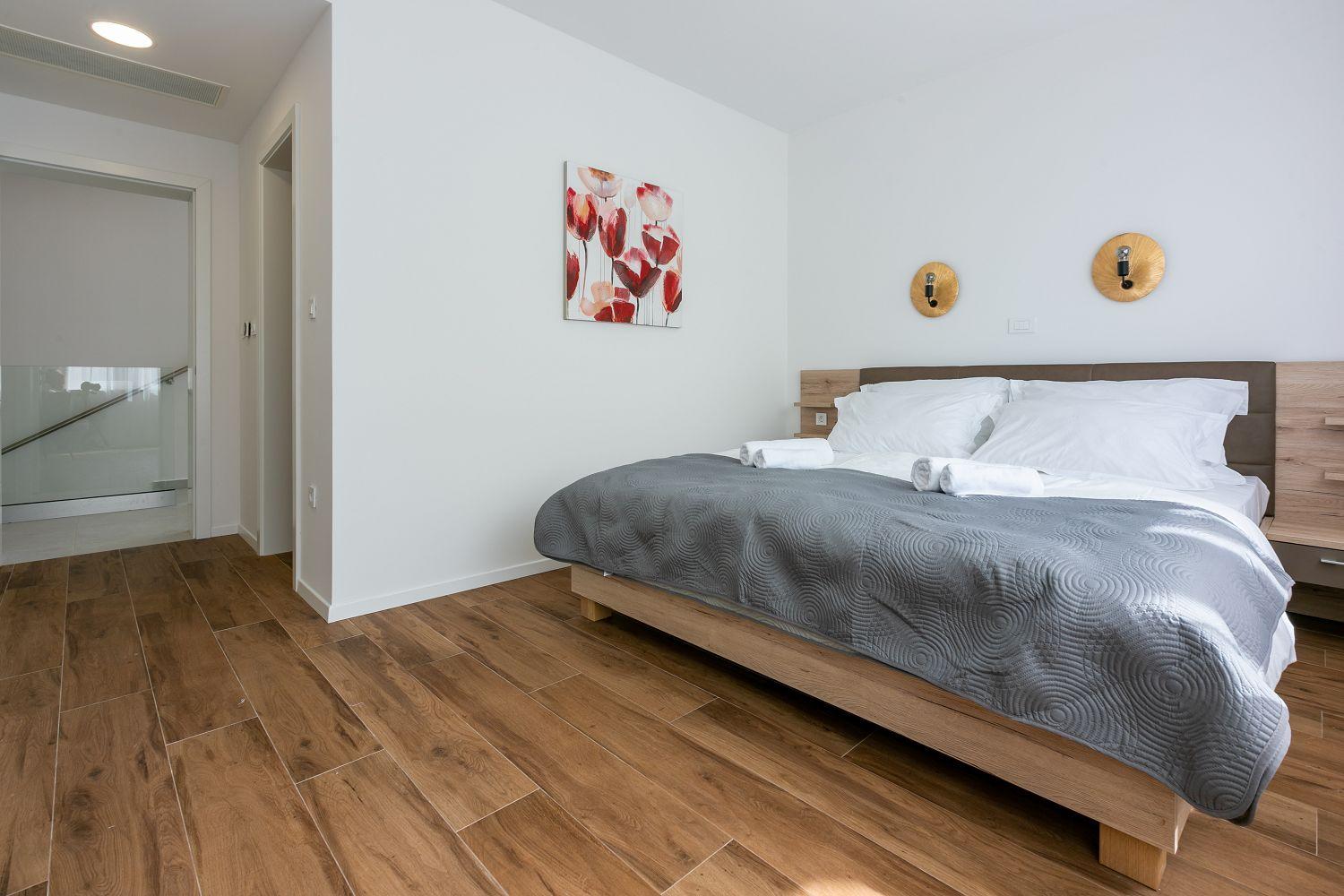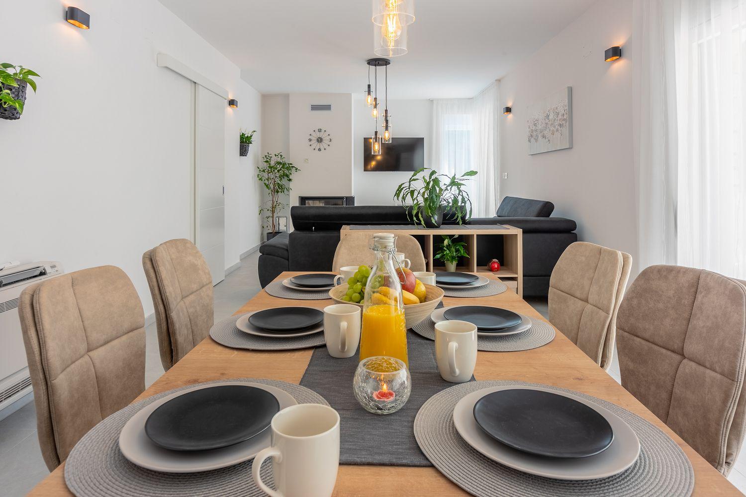 Im Erdgeschoss des Hauses befindet sich ein offener Wohn-/Essbereich mit gut ausgestatteter Küche, ein separates WC und ein Waschraum. Im Wohnbereich befindet sich eine Schlafcouch für bis zu 2 Personen. Über eine Innentreppe gelangt man in das Obergeschoss der Villa. Hier befinden sich drei sehr gemütliche Schlafzimmer mit jeweils eigenem Bad. Der schöne Außenbereich ist komplett eingezäunt und bietet Platz für bis zu 8 Personen. Hier gibt es eine möblierte Terrasse mit Rasen und direktem Zugang zum Grill und zum Swimmingpool. Zwei Privatparkplätze stehen kostenlos zur Verfügung.