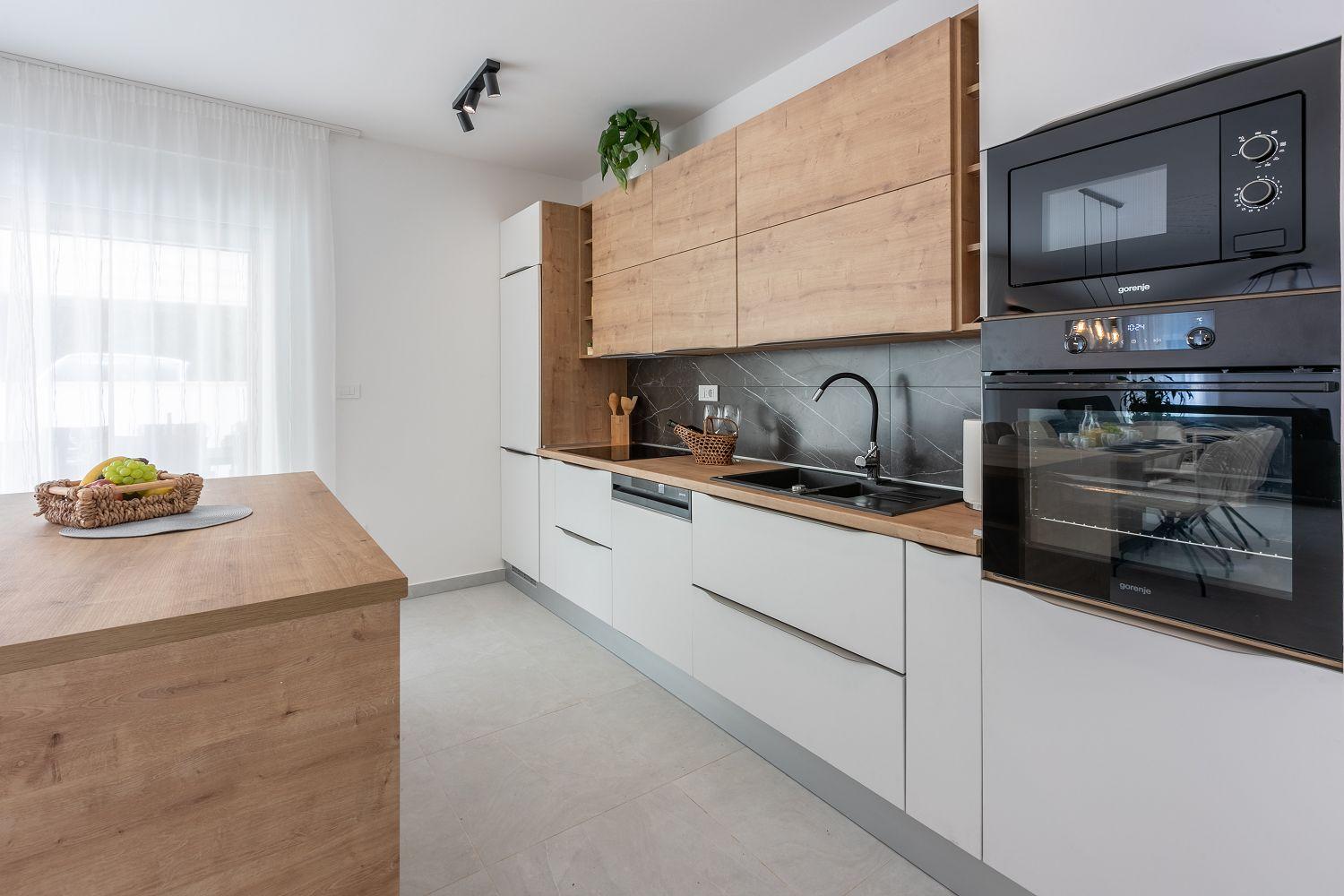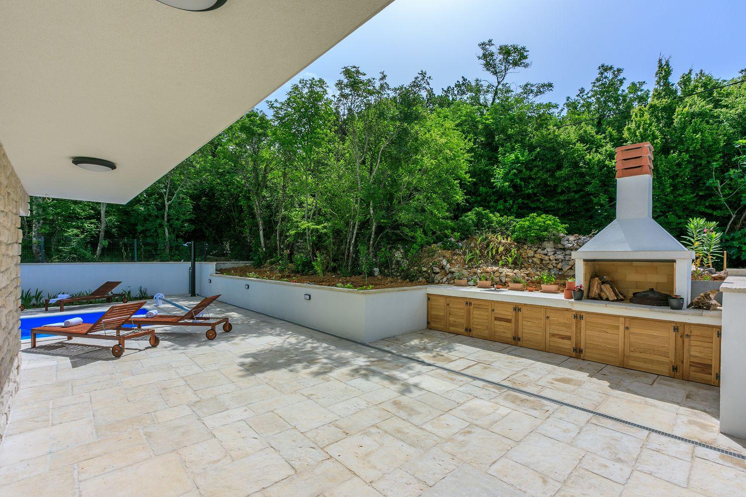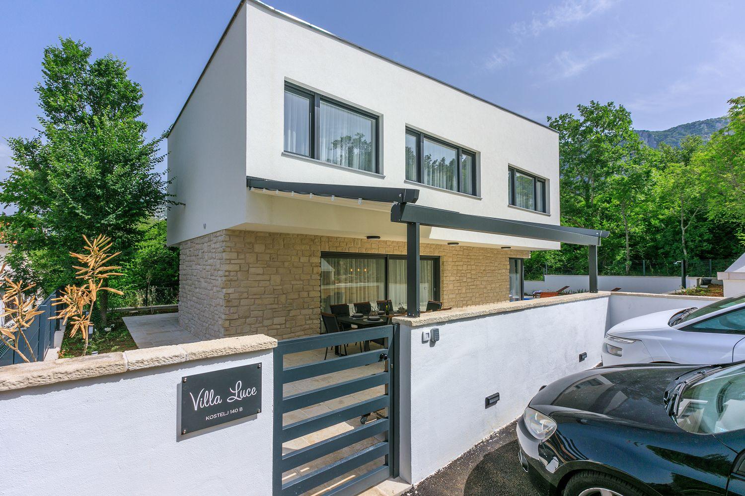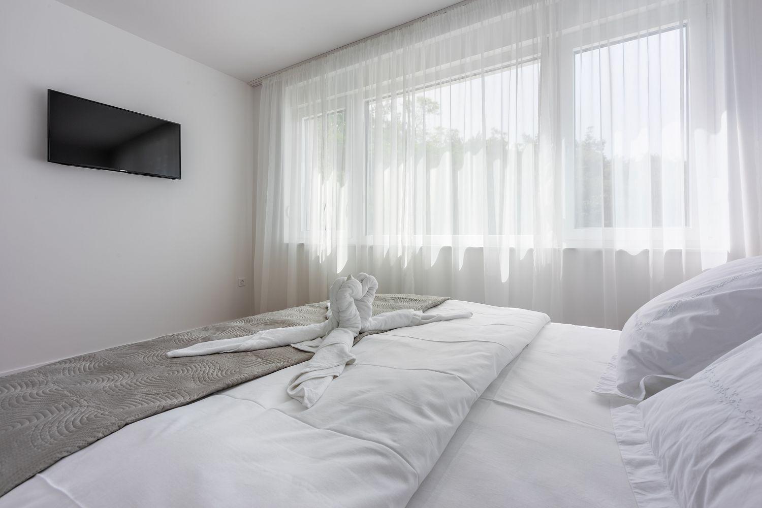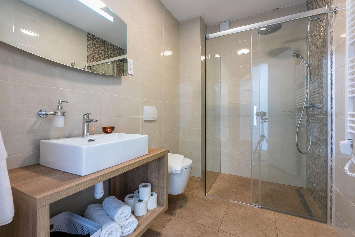 Im Erdgeschoss des Hauses befindet sich ein offener Wohn-/Essbereich mit gut ausgestatteter Küche, ein separates WC und ein Waschraum. Im Wohnbereich befindet sich eine Schlafcouch für bis zu 2 Personen. Über eine Innentreppe gelangt man in das Obergeschoss der Villa. Hier befinden sich drei sehr gemütliche Schlafzimmer mit jeweils eigenem Bad. Der schöne Außenbereich ist komplett eingezäunt und bietet Platz für bis zu 8 Personen. Hier gibt es eine möblierte Terrasse mit Rasen und direktem Zugang zum Grill und zum Swimmingpool. Zwei Privatparkplätze stehen kostenlos zur Verfügung.