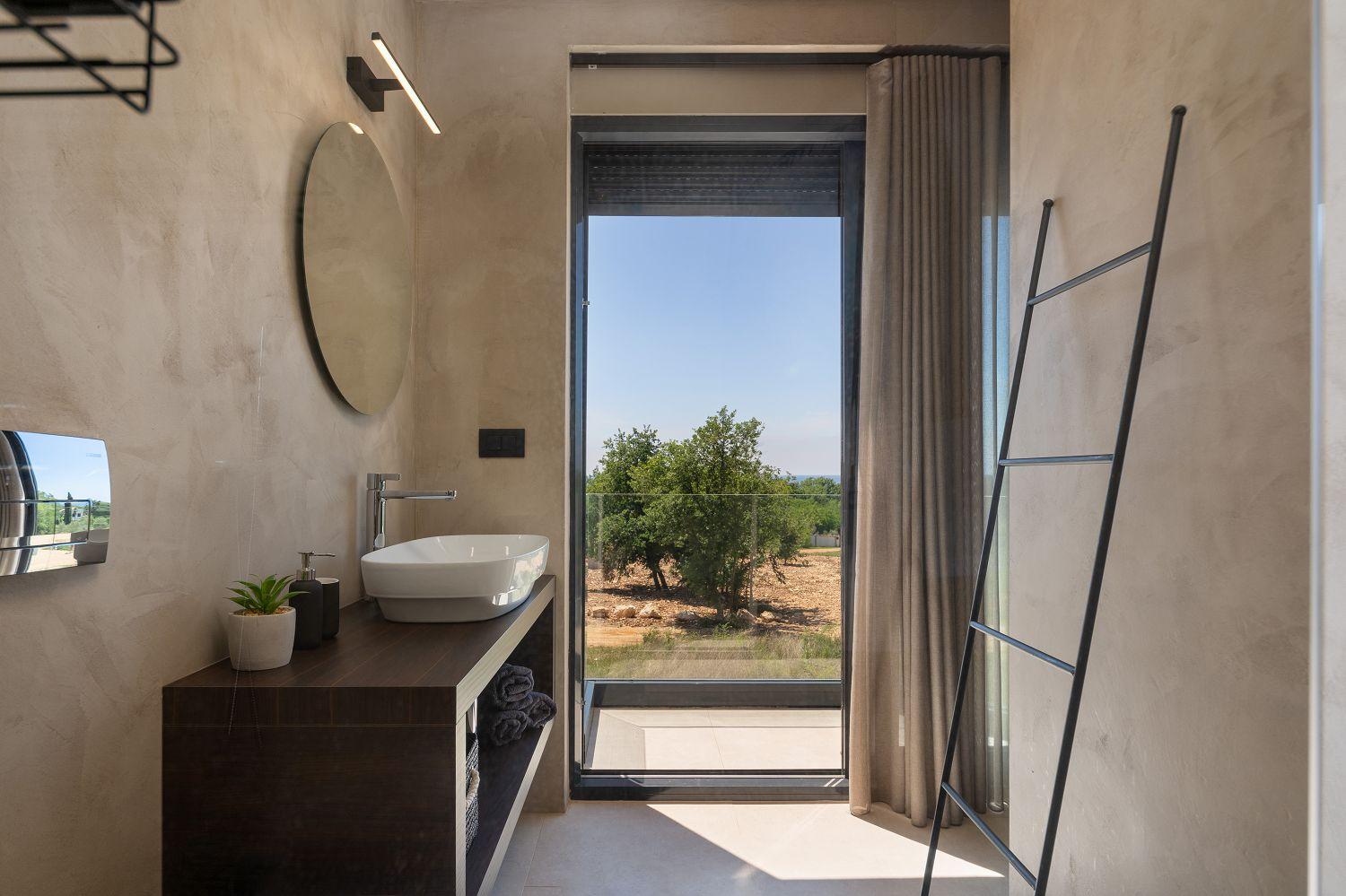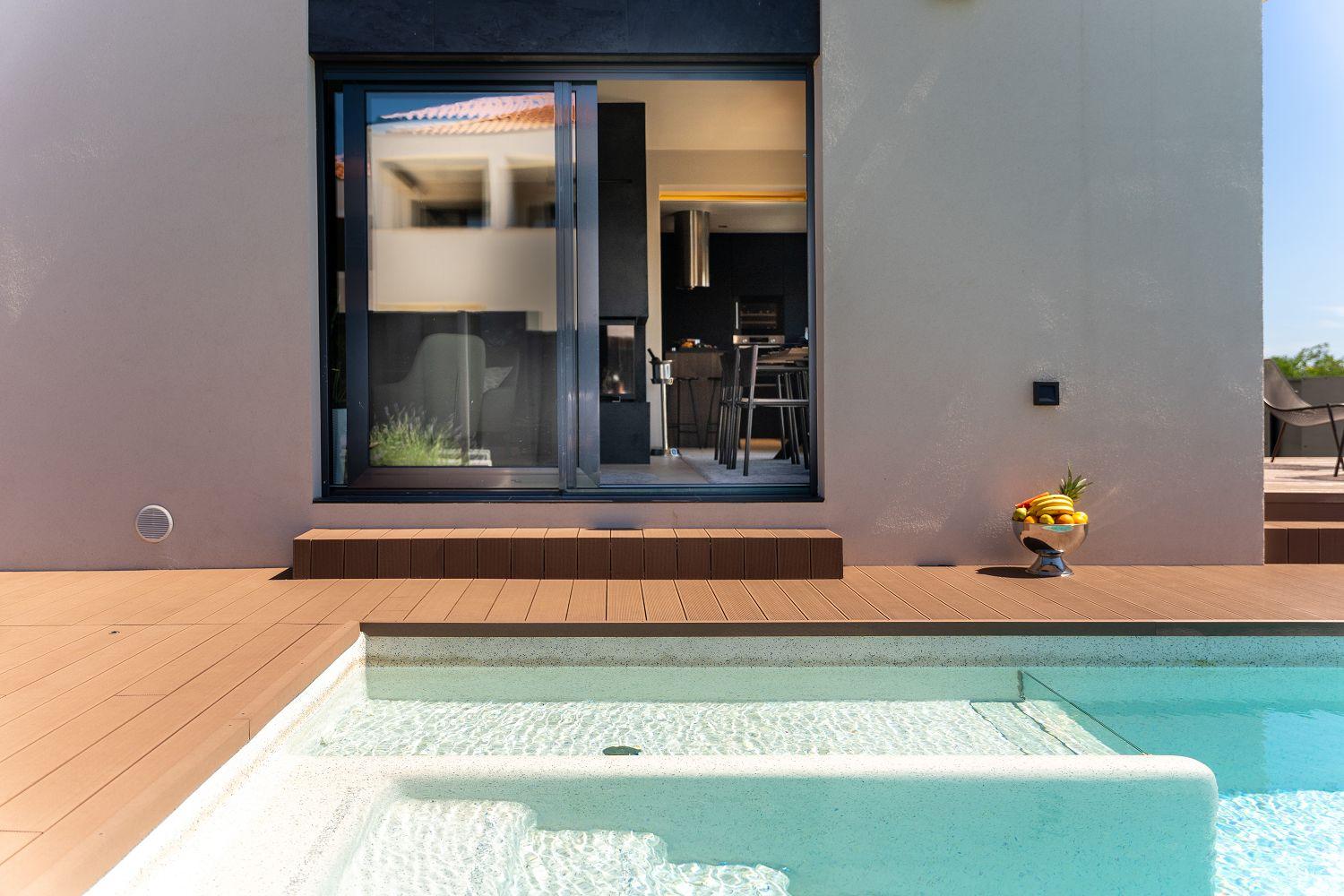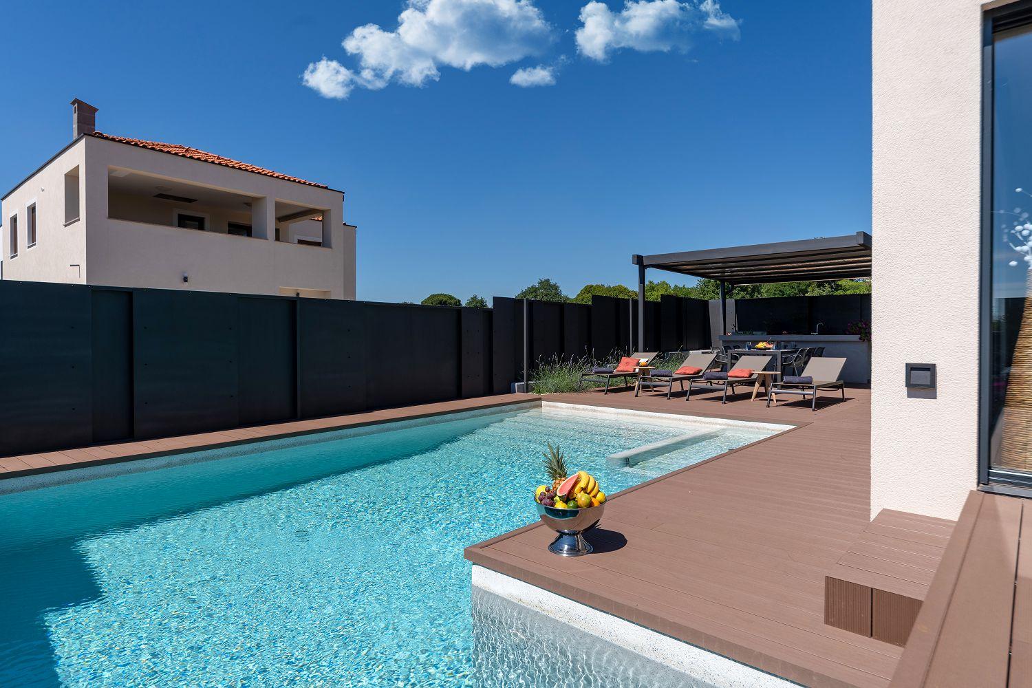 Diese moderne Villa liegt am Rande des Vorortes Spadici bei Porec, nur 700 m vom Meer und 2 km vom Stadtzentrum entfernt. Die Villa (Doppelhaushälfte) verfügt über ein umzäuntes Grundstück mit wundervollem 50m2 großen Infinity-Pool, Liegen, überdachte Terrasse mit Grill, Tisch und Stühlen für Mahlzeiten im Freien und die andere mit einer Loungeecke. Die Besonderheit des Hauses ist der bezaubernde Blick aufs Meer schon vom Garten und Erdgeschoß sowie von allen Etagen aus. Dank der Lage ist die Villa ein ideales Ferienhaus für den Urlaub in Porec, entspannen in der Ruhe aber gleichzeitig nur 10 Minuten zu Fuß bis zum Strand, Geschäften, Restaurants und anderen Freizeitangeboten. Der Vermieter wohnt gelegentlich in der anderen Haushälfte, aber der Garten und Poolbereich stehen ausschließlich zur Alleinnutzung zur Verfügung. Die Villa ist ein Ferienhaus mit Pool von 200 qm große Fläche auf drei luxuriösen Etagen. Das Erdgeschoss beinhaltet das Wohnzimmer mit Kamin und viel Tageslicht durch die großen Glaswänden, Esszimmer, völlig ausgestattete Küche und eine separate Toilette. Aus dem Wohnzimmer gelangt man auf die schöne Terrasse. Auf dem ersten Stock gibt es zwei klimatisierte Schlafzimmer, jedes mit eigene Dusche/WC und SAT-TV und im zweiten Stock befindet sich noch ein Doppelzimmer mit eigenem besonderen Wellness-Badezimmer aus dem man den Sonnenuntergang genießen kann.