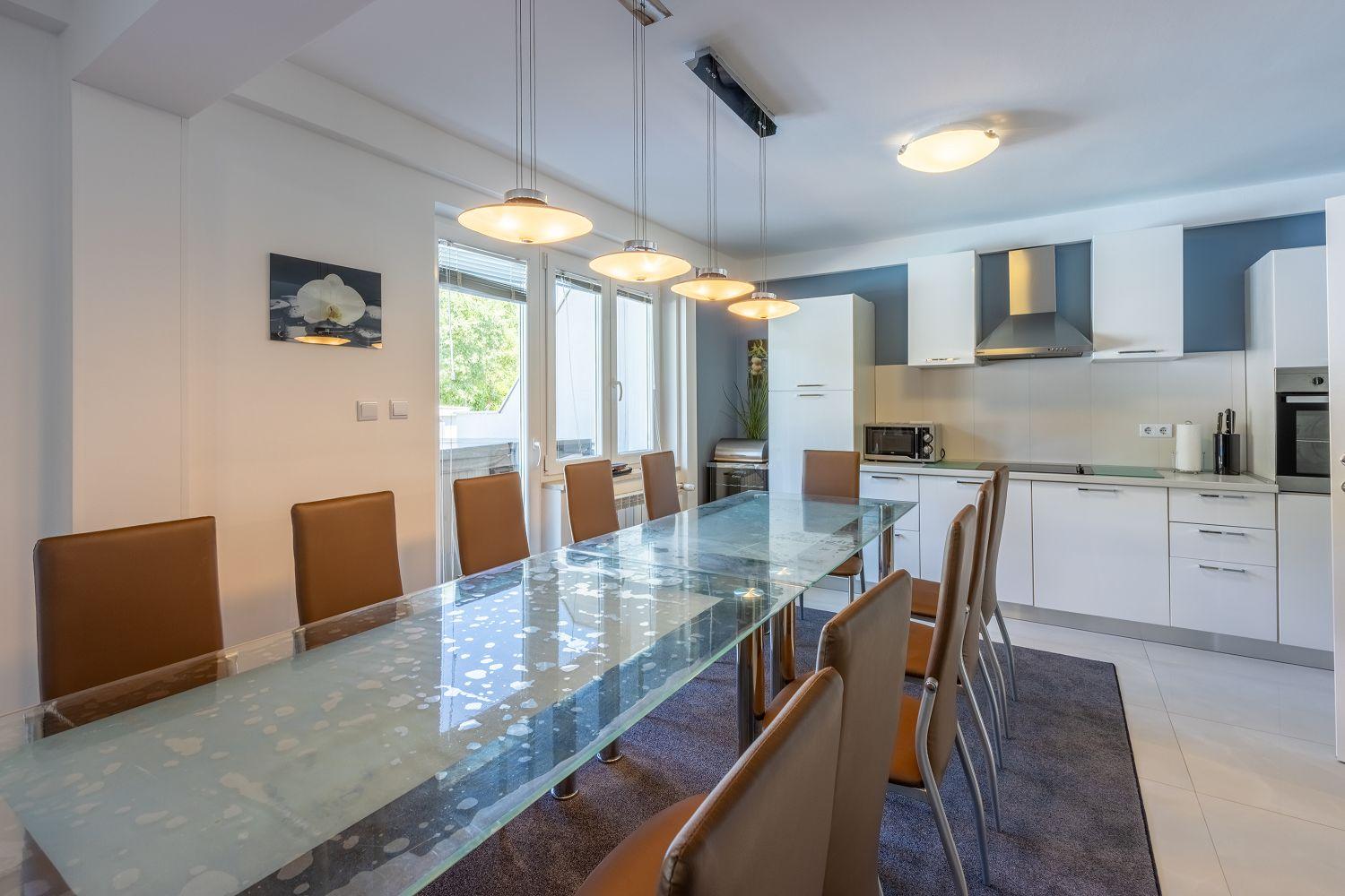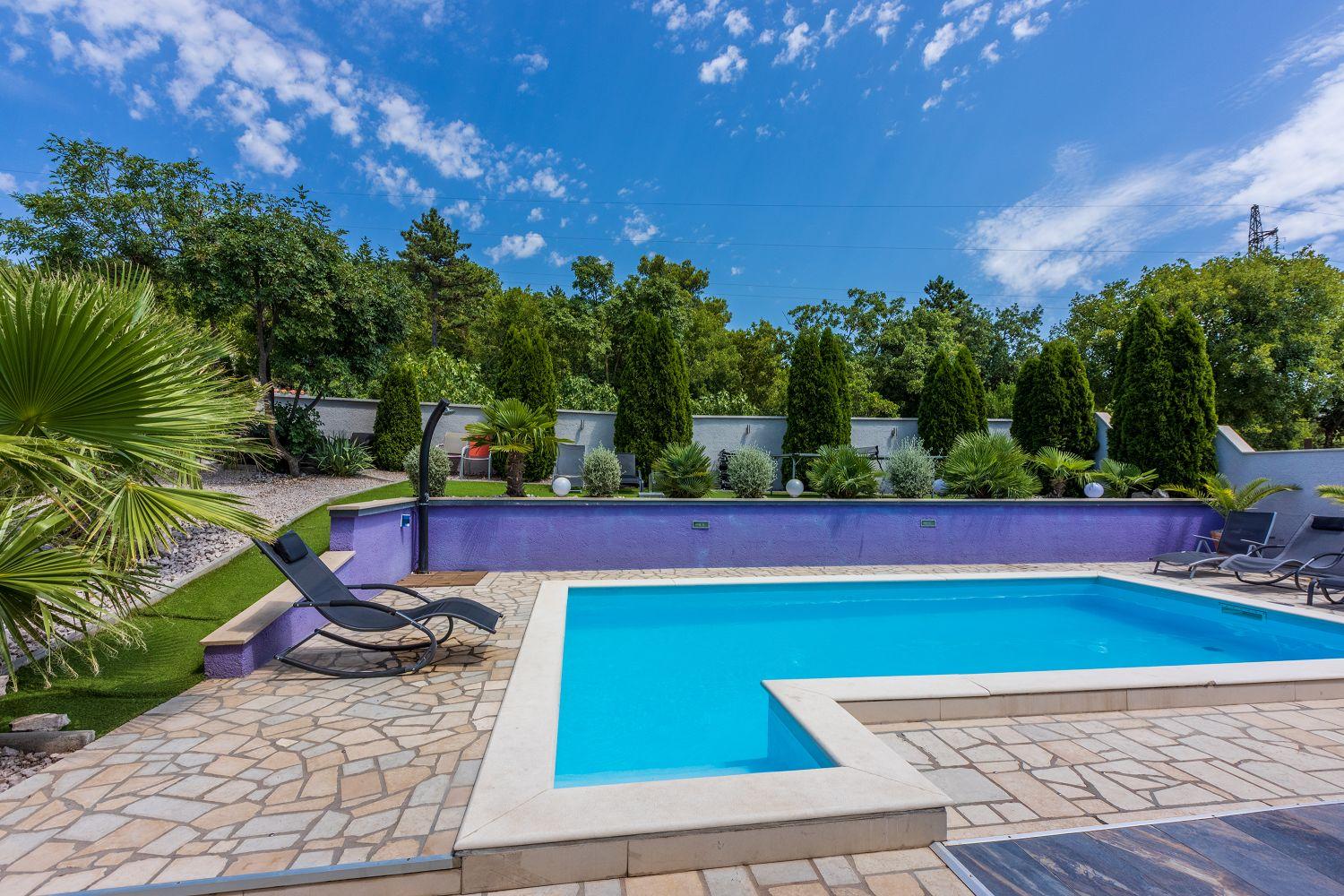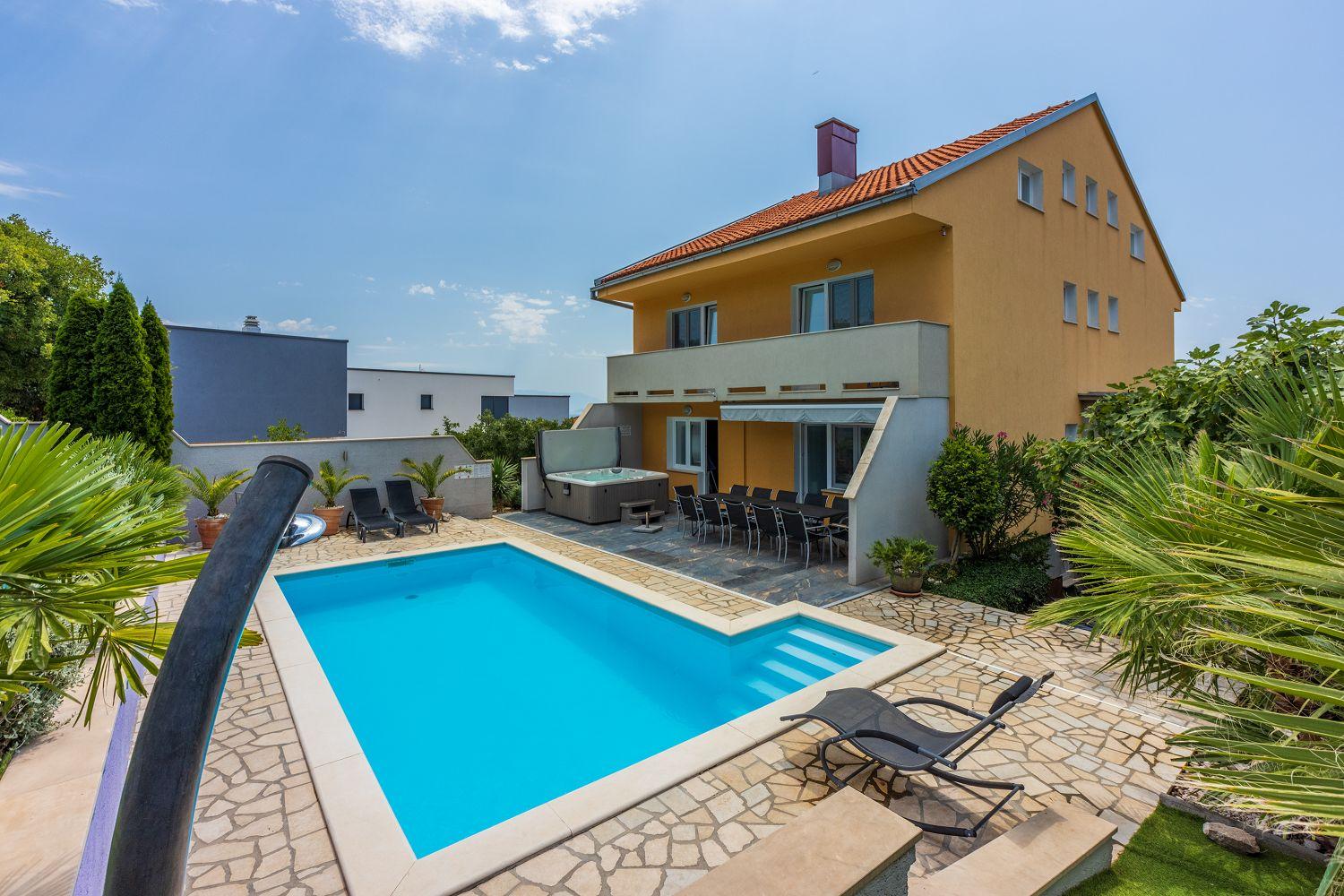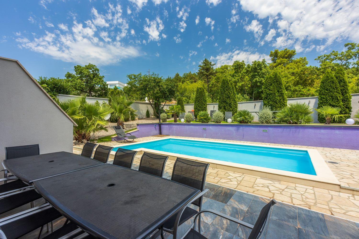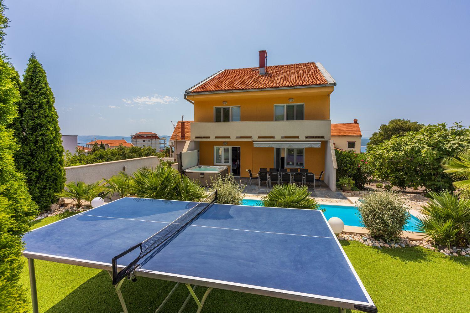 Dieses moderne Ferienhaus liegt in einem ruhigen Stadtteil des Urlaubsortes Crikvenica an der Kvarner Bucht. Es ist stilvoll und charmant eingerichtet. Der wundervolle Außenbereich bietet viel Platz und zahlreiche Freizeitmöglichkeiten. Der Wohnbereich sowie alle Schlafzimmer verfügen über Satellitenfernsehen. Im Keller des Hauses befindet sich ein separater Raum mit einem Billardtisch. Das Erdgeschoss besteht aus einer voll ausgestatteten Küche mit einem stilvollen Essbereich für bis zu acht Personen, einem Wohnraum, zwei Schlafzimmern mit Balkon, zwei Badezimmern und einem Wäscheraum. Von der Wohn-/Ess-/Küche aus hat man Zugang zum hinteren Außenbereich. Die übrigen zwei Schlafzimmer und zwei Badezimmer befinden sich im ersten Obergeschoss. Dort stehen Ihnen auch einige Fitnessgeräte zur Verfügung. Der gut ausgestattete Außenbereich wird durch den Poolbereich dominiert, der über eine schattige Terrasse, acht Sonnenliegen, einen Whirlpool für sechs Personen, einen Tischtennistisch und viel Grün verfügt. Diese Villa befindet sich in einer ruhigen und idyllischen Umgebung und ist daher für Partyurlauber nicht geeignet. Buchungen von Jugendgruppen unter 25 Jahren sind nicht möglich.