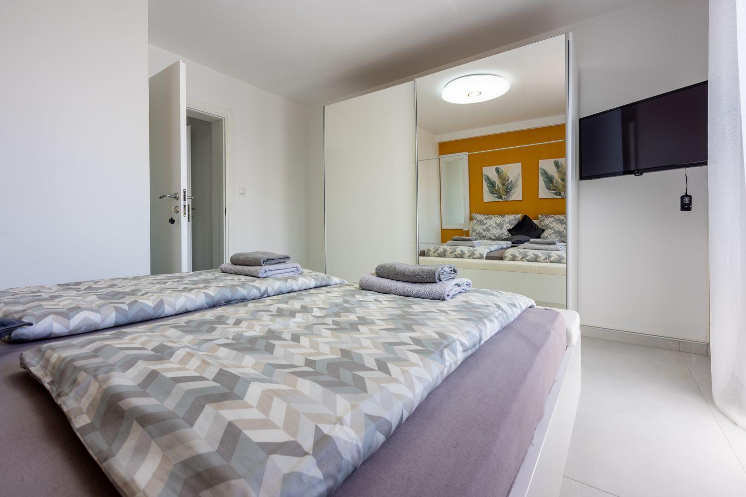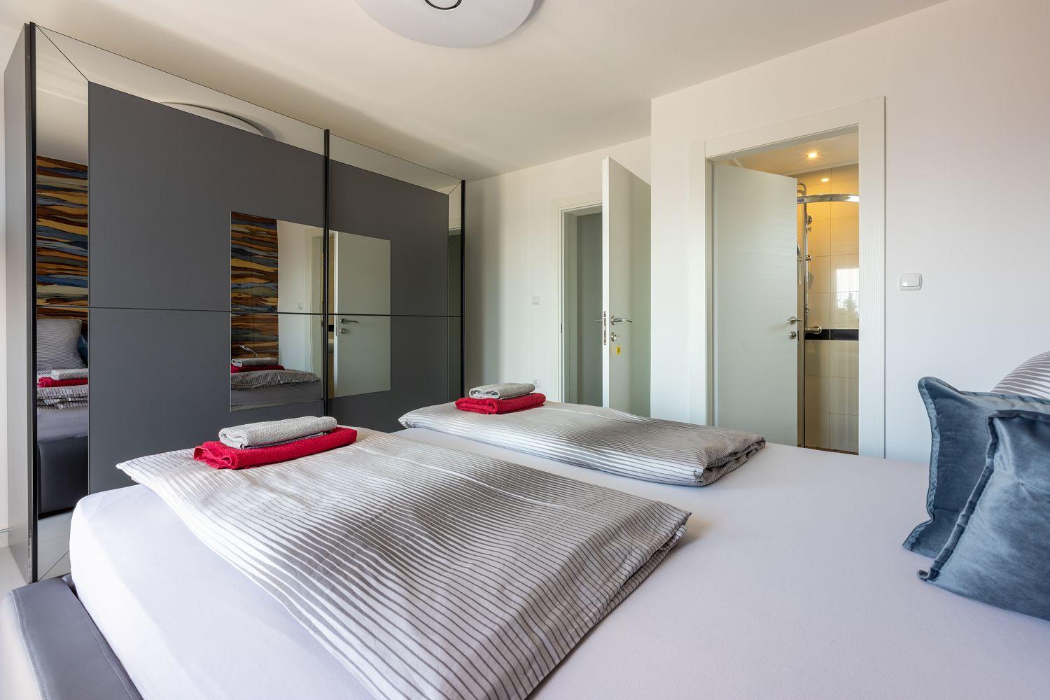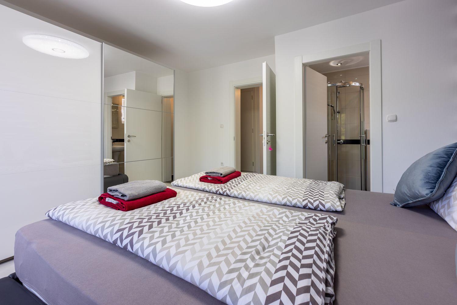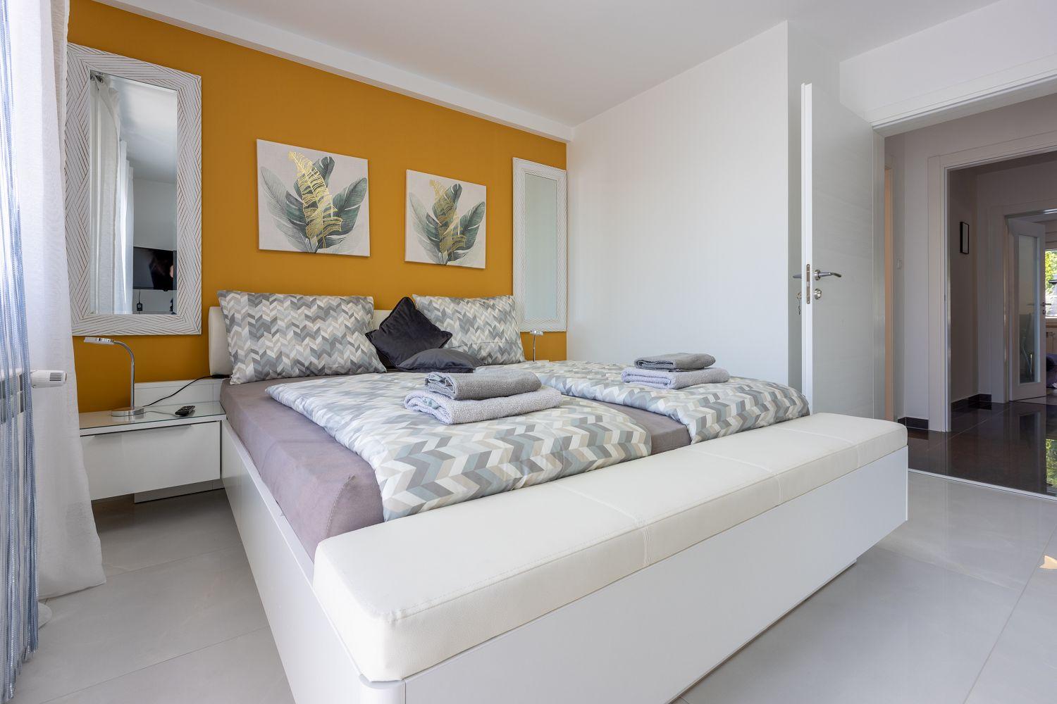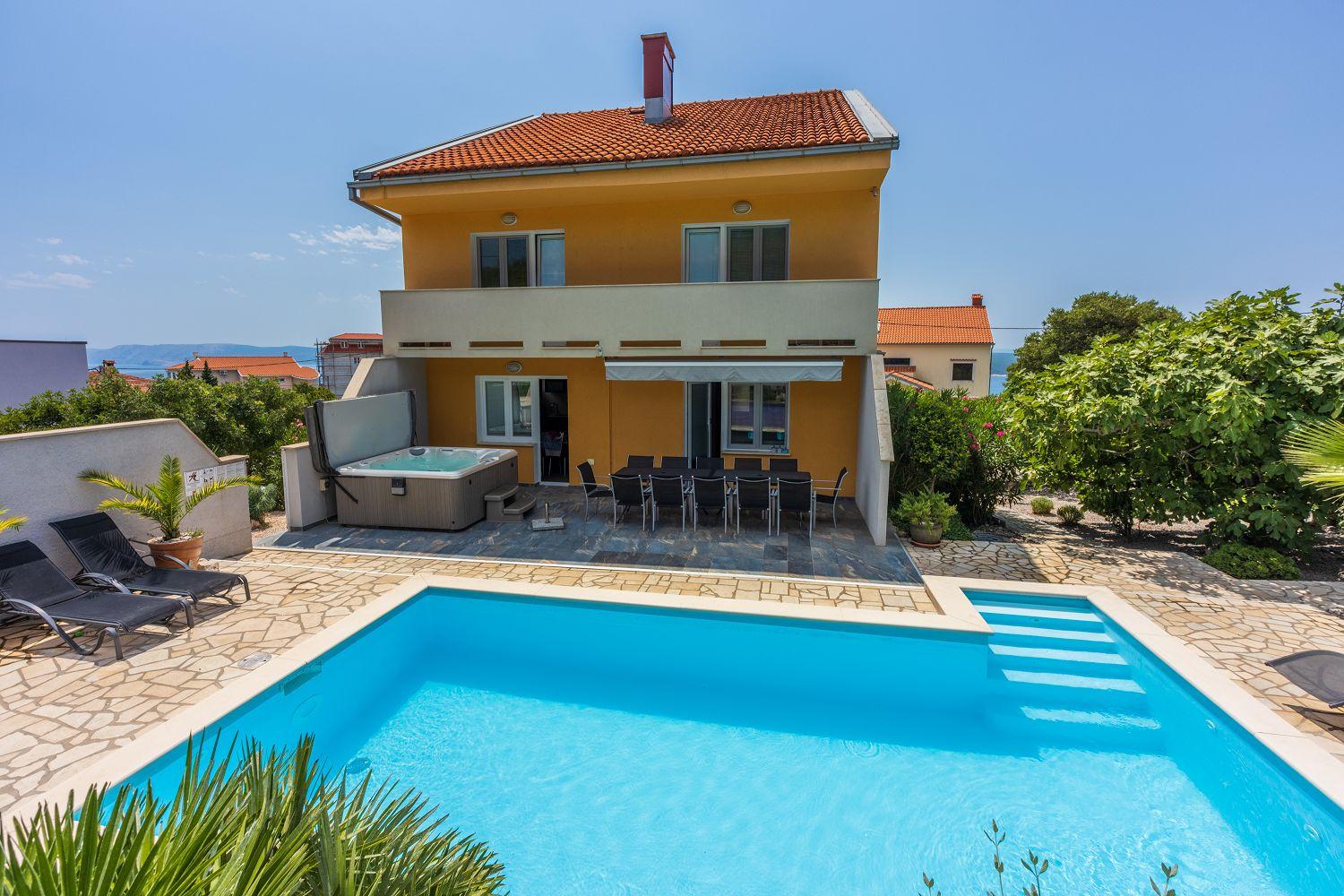 Dieses moderne Ferienhaus liegt in einem ruhigen Stadtteil des Urlaubsortes Crikvenica an der Kvarner Bucht. Es ist stilvoll und charmant eingerichtet. Der wundervolle Außenbereich bietet viel Platz und zahlreiche Freizeitmöglichkeiten. Der Wohnbereich sowie alle Schlafzimmer verfügen über Satellitenfernsehen. Im Keller des Hauses befindet sich ein separater Raum mit einem Billardtisch. Das Erdgeschoss besteht aus einer voll ausgestatteten Küche mit einem stilvollen Essbereich für bis zu acht Personen, einem Wohnraum, zwei Schlafzimmern mit Balkon, zwei Badezimmern und einem Wäscheraum. Von der Wohn-/Ess-/Küche aus hat man Zugang zum hinteren Außenbereich. Die übrigen zwei Schlafzimmer und zwei Badezimmer befinden sich im ersten Obergeschoss. Dort stehen Ihnen auch einige Fitnessgeräte zur Verfügung. Der gut ausgestattete Außenbereich wird durch den Poolbereich dominiert, der über eine schattige Terrasse, acht Sonnenliegen, einen Whirlpool für sechs Personen, einen Tischtennistisch und viel Grün verfügt. Diese Villa befindet sich in einer ruhigen und idyllischen Umgebung und ist daher für Partyurlauber nicht geeignet. Buchungen von Jugendgruppen unter 25 Jahren sind nicht möglich.